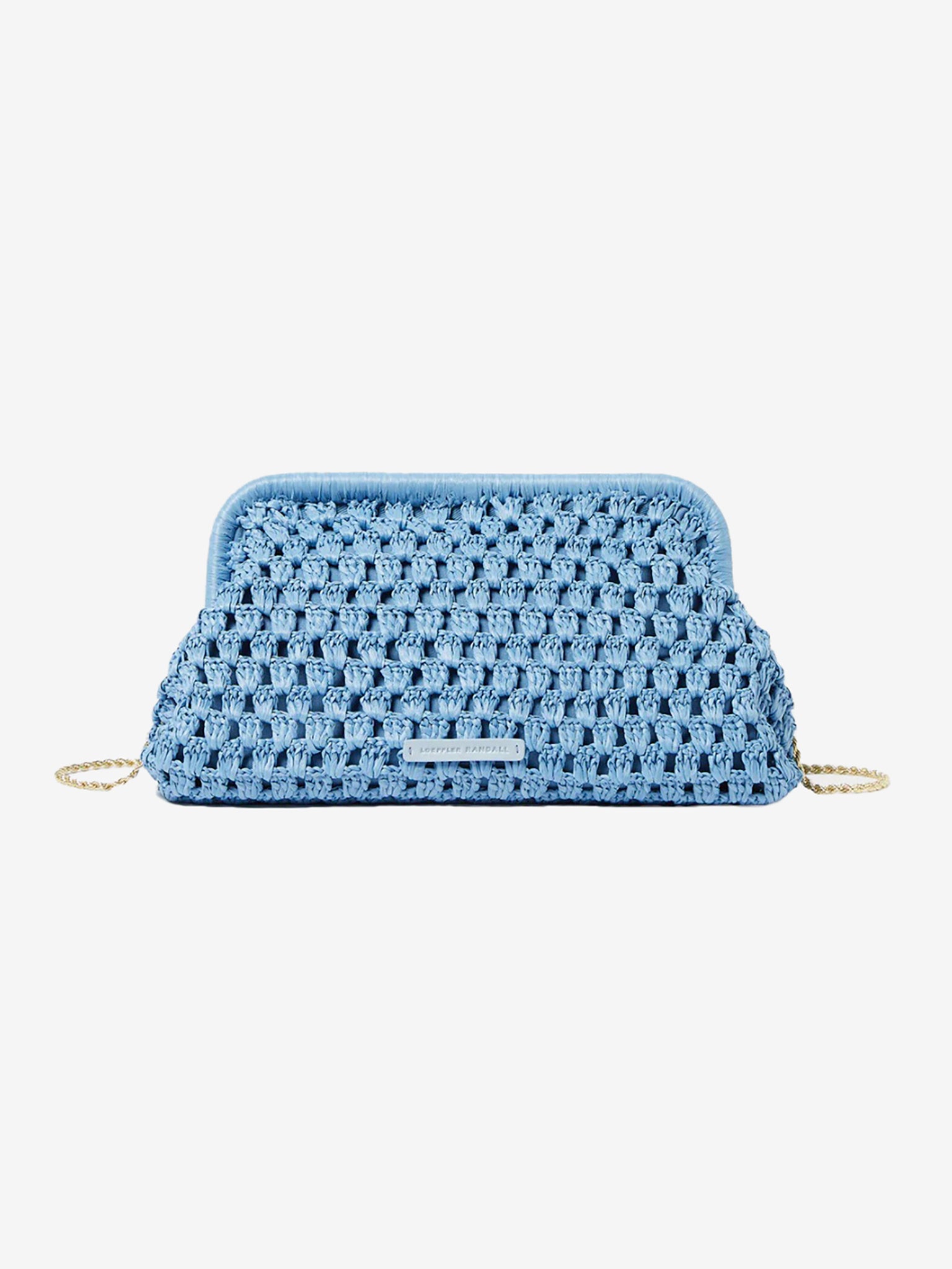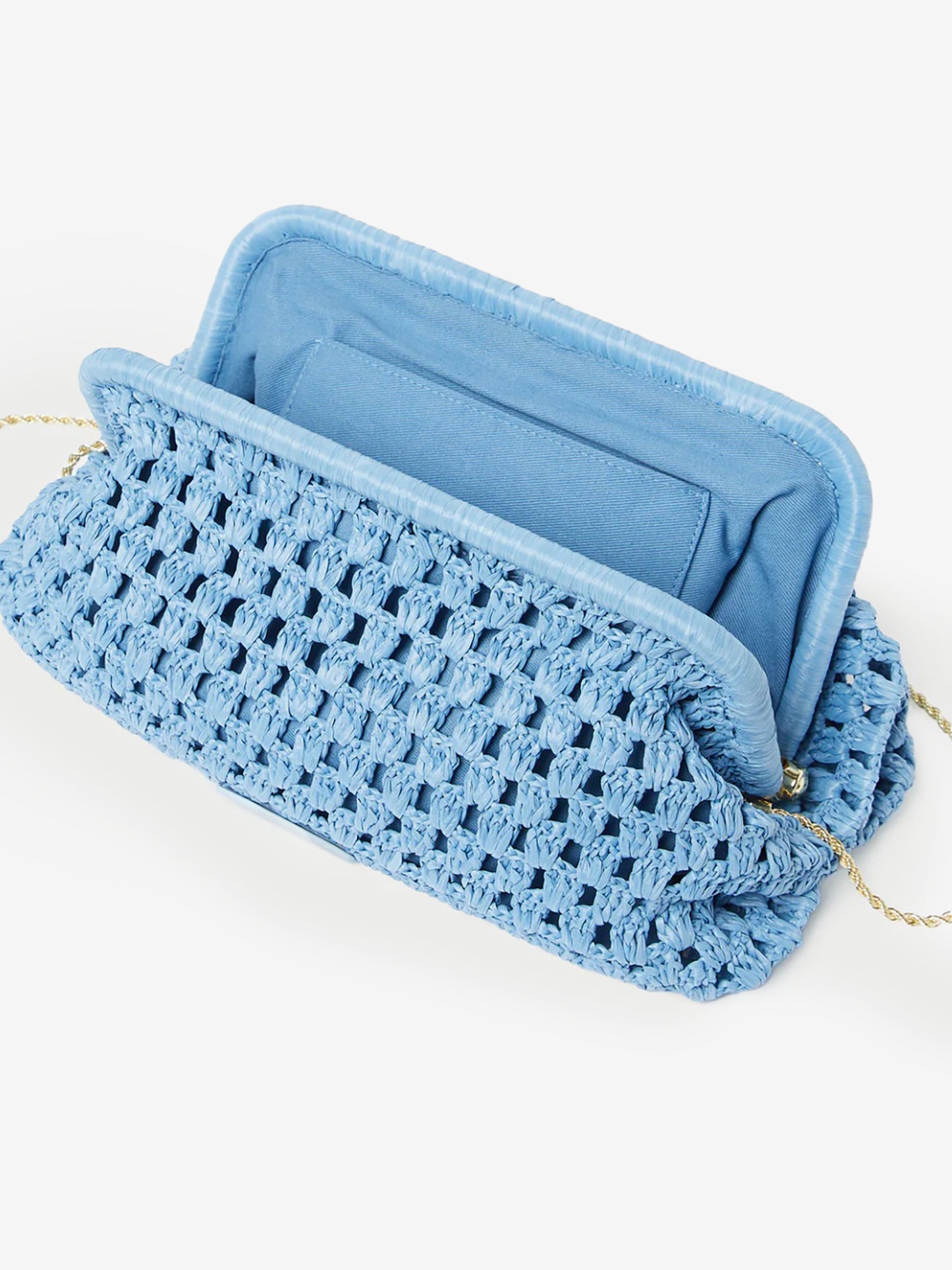 A light blue crocheted raffia frame clutch with a full lining and removable chain strap.