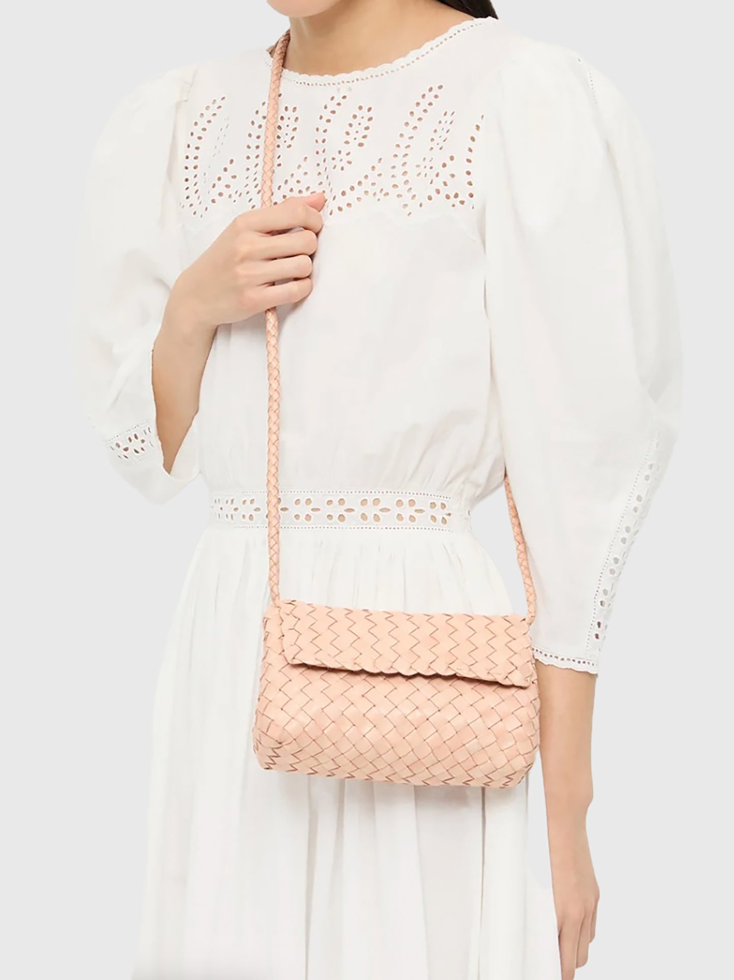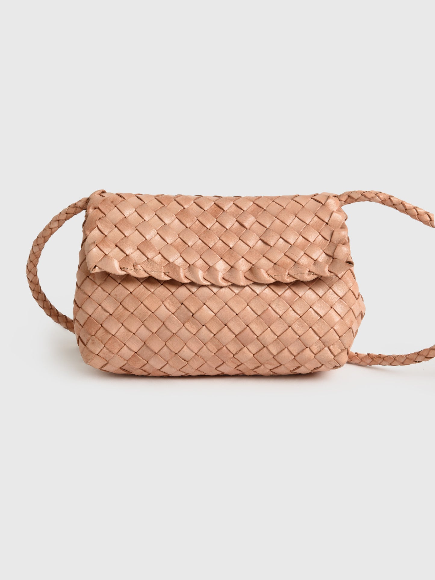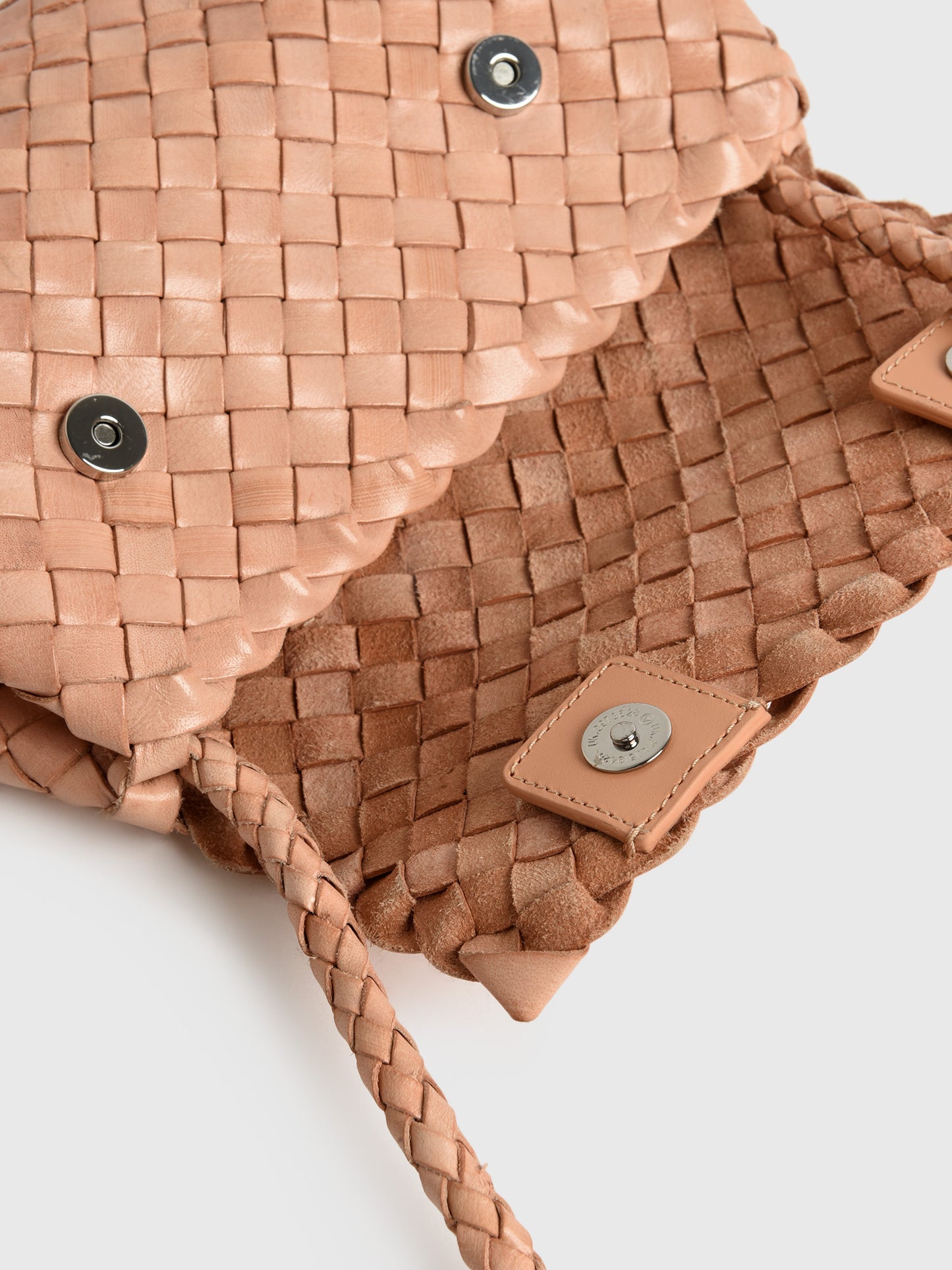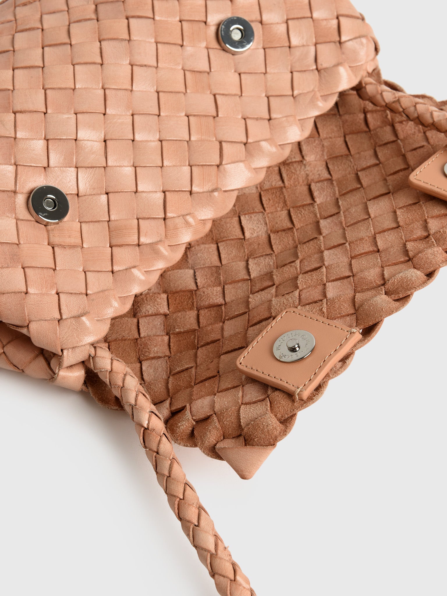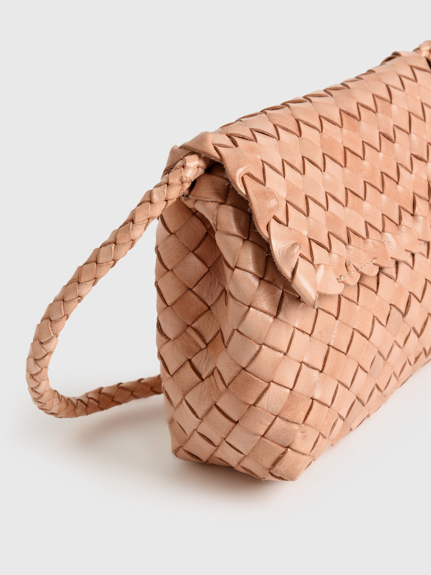 This neutral-toned crossbody bag is made from woven leather and features a magnetic flap closure with an interior card slot pocket.