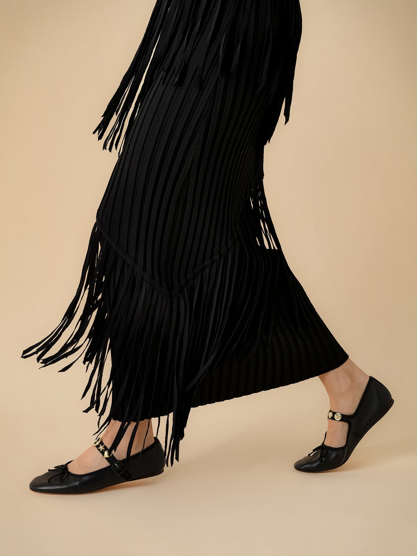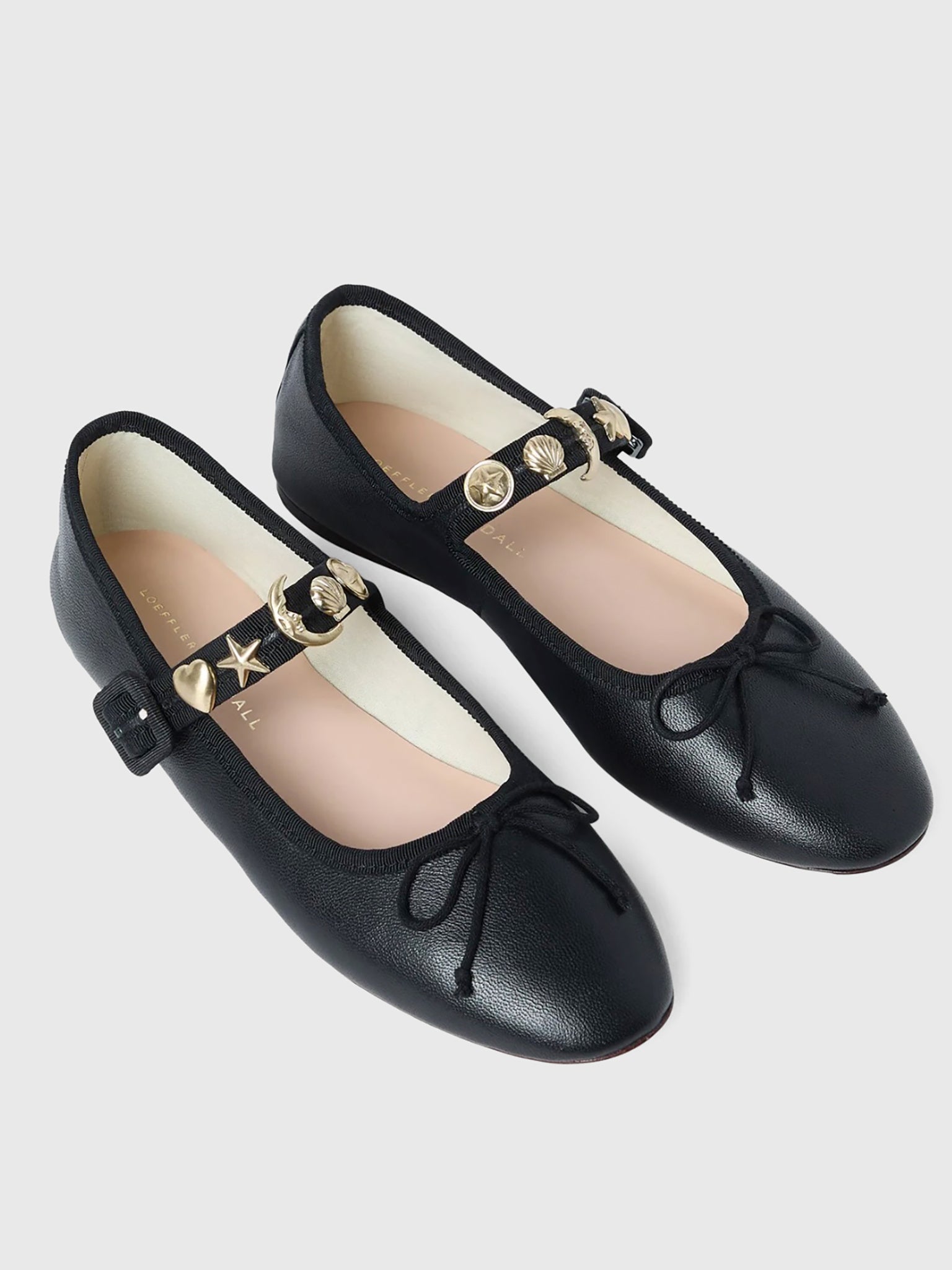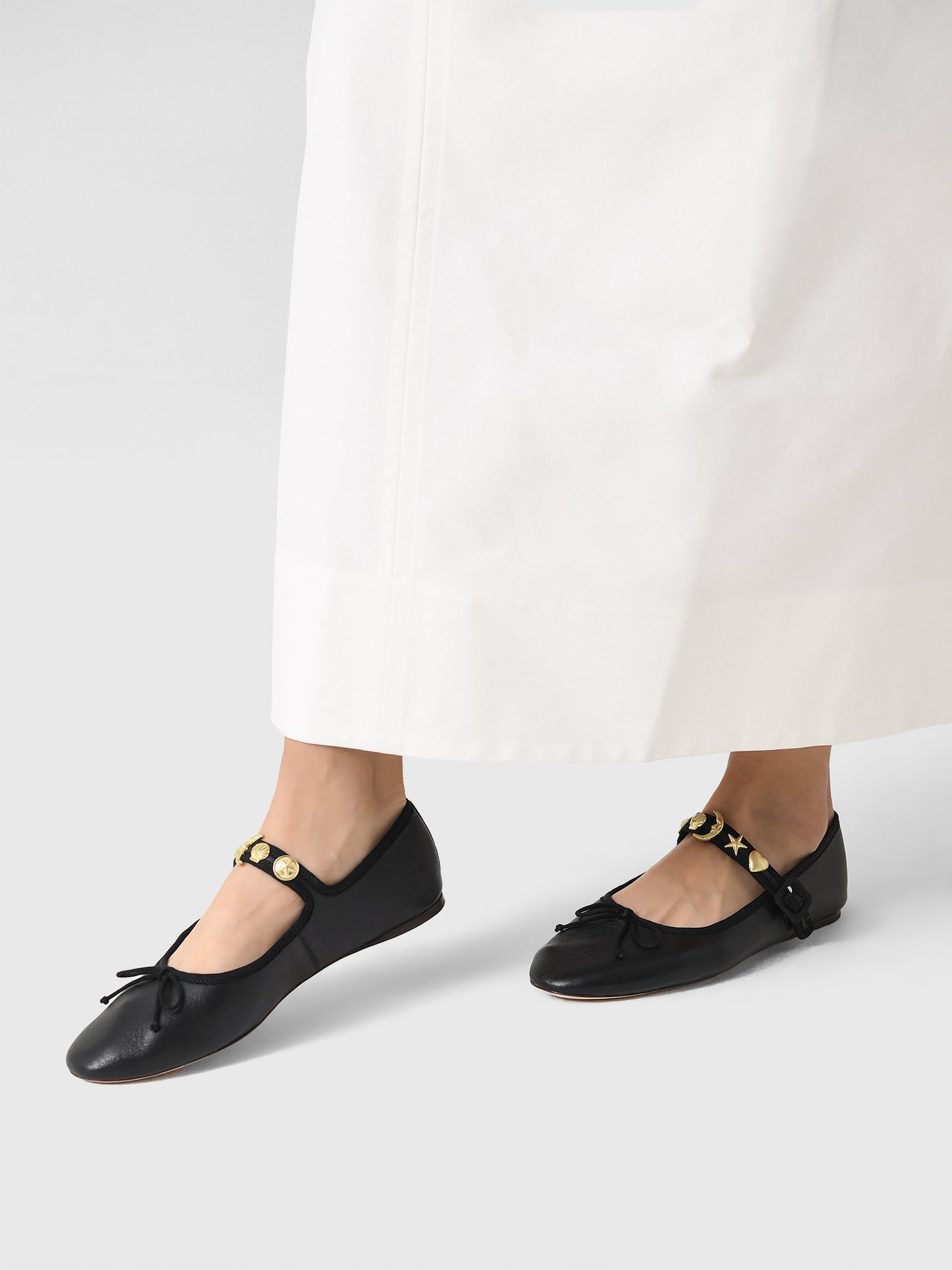 This black leather flat features an adjustable buckle adorned with gold-plated sun, moon, and star charms and a padded footbed for comfort.