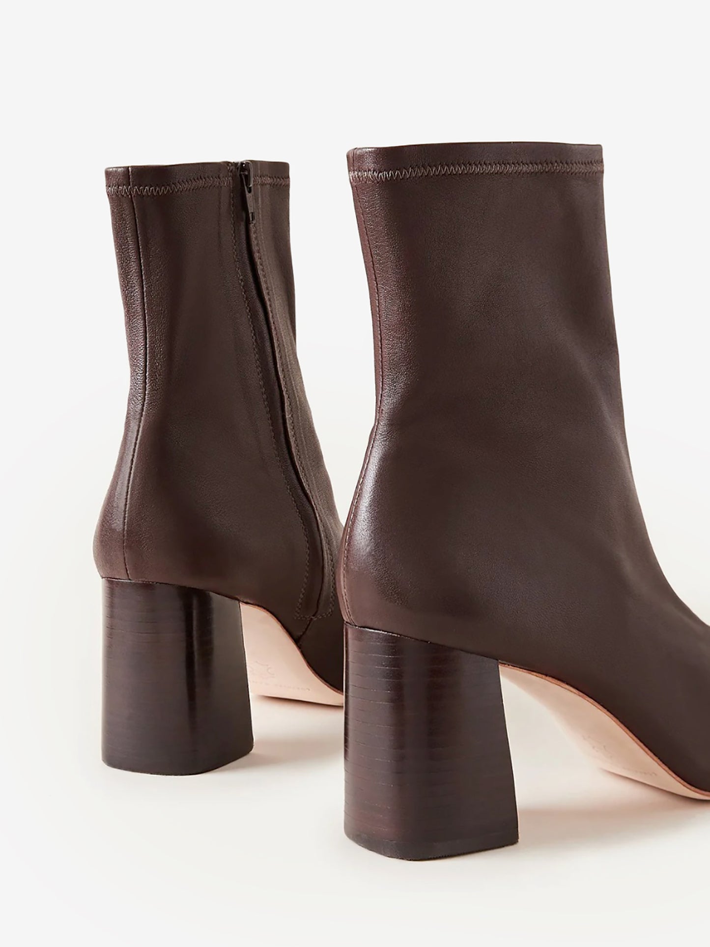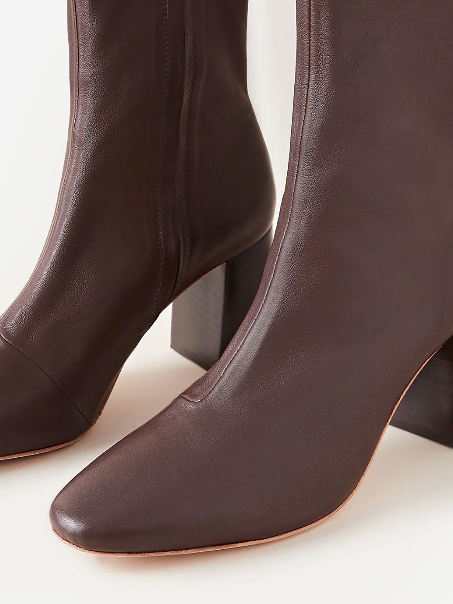 Chocolate brown leather bootie with a slim silhouette.