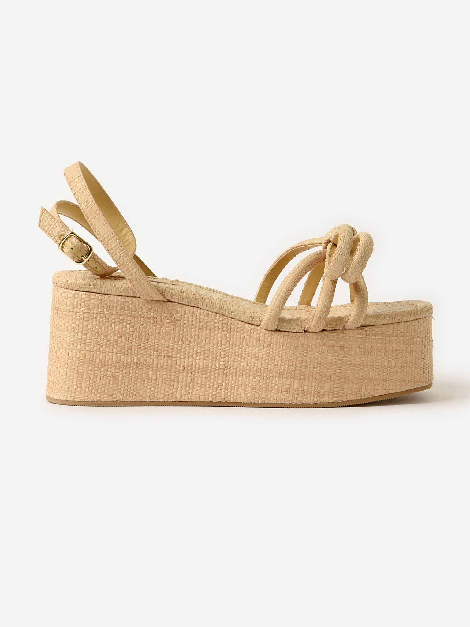 A platform sandal made from natural raffia with a bow detail and adjustable ankle strap.
