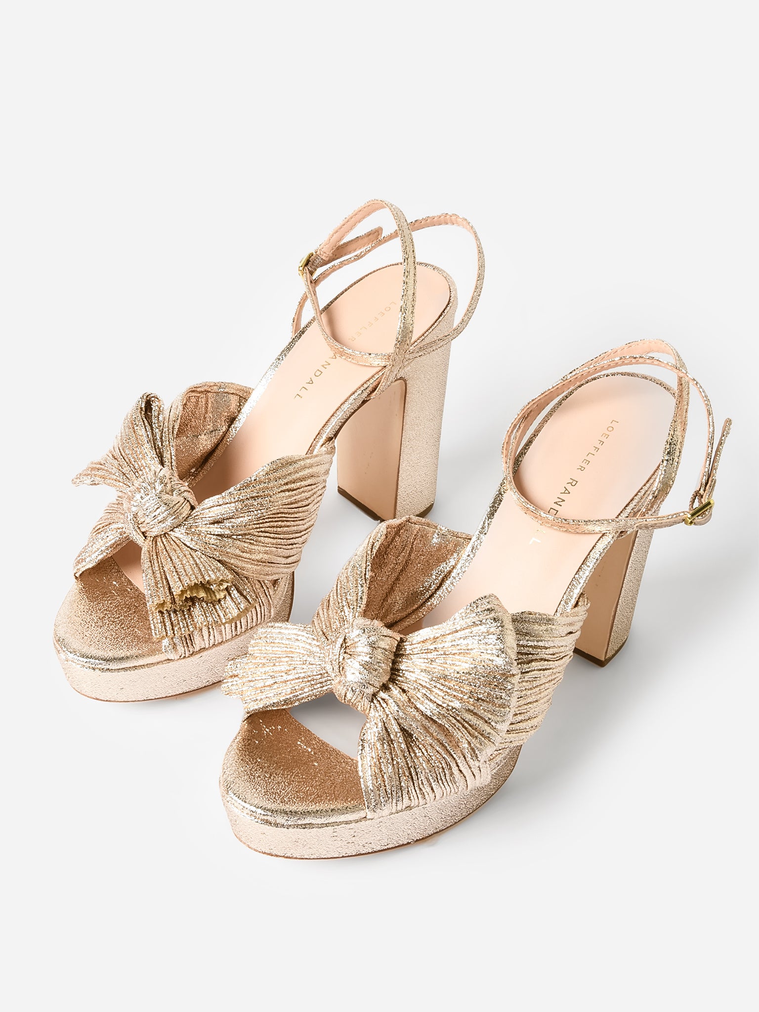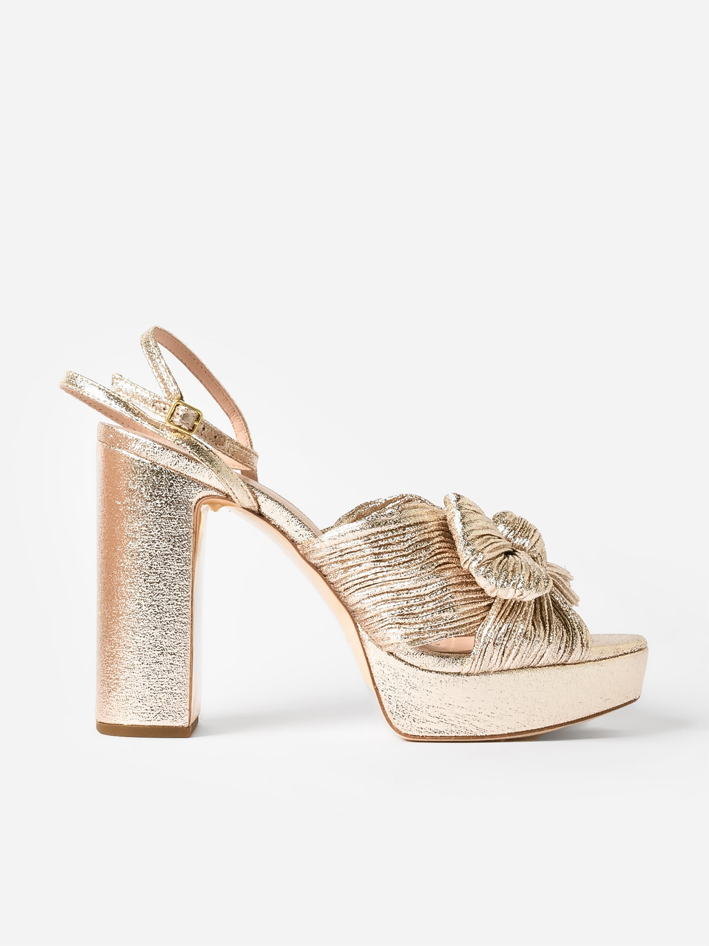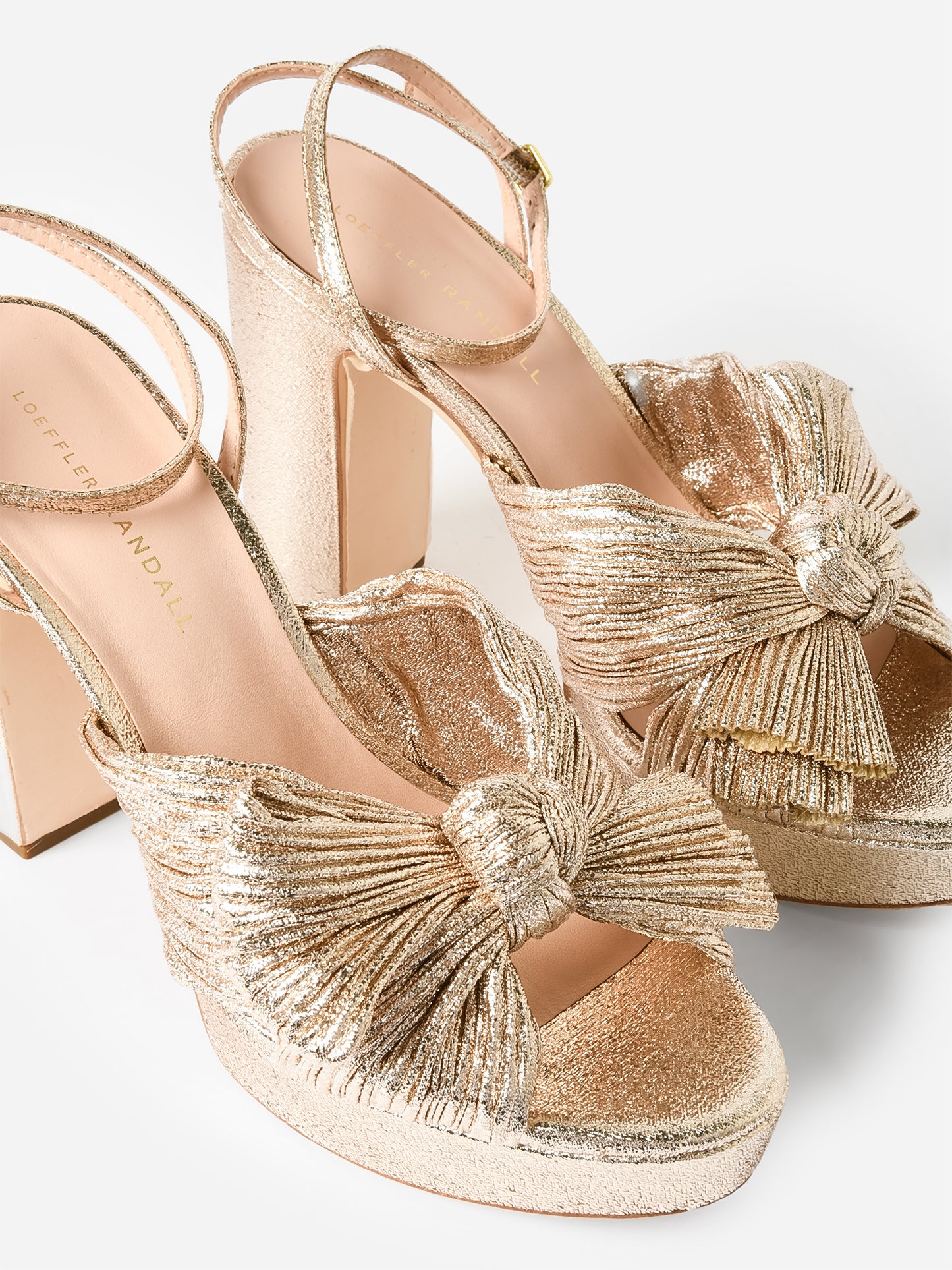 Pleated lamé platform sandal with a signature knotted bow and adjustable ankle strap.