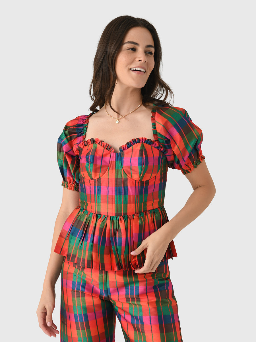 This statement top features a softly structured sweetheart bodice and romantic peplum to create an effortless hourglass shape. Feminine, festive, and beautifully nostalgic, it’s perfect when paired with the matching Libby Pant.