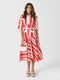 This vibrant striped dress features half-length sleeves, an adjustable D-ring belt, and a flowy asymmetrical tiered skirt.