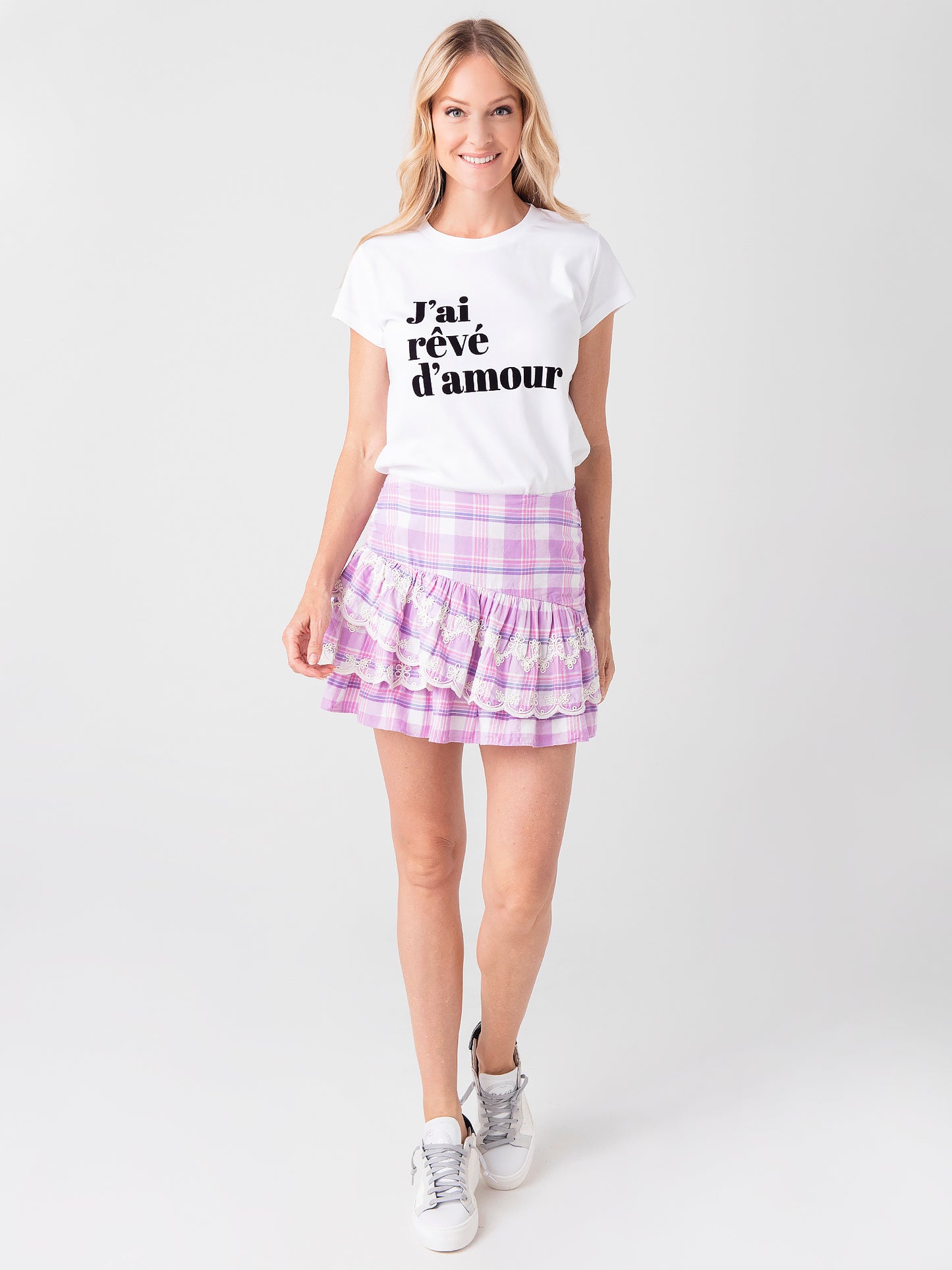 Mini skirt featuring ruching detail, swirl contrast embroidery, and a scalloped asymmetrical tiered flounce hem.
