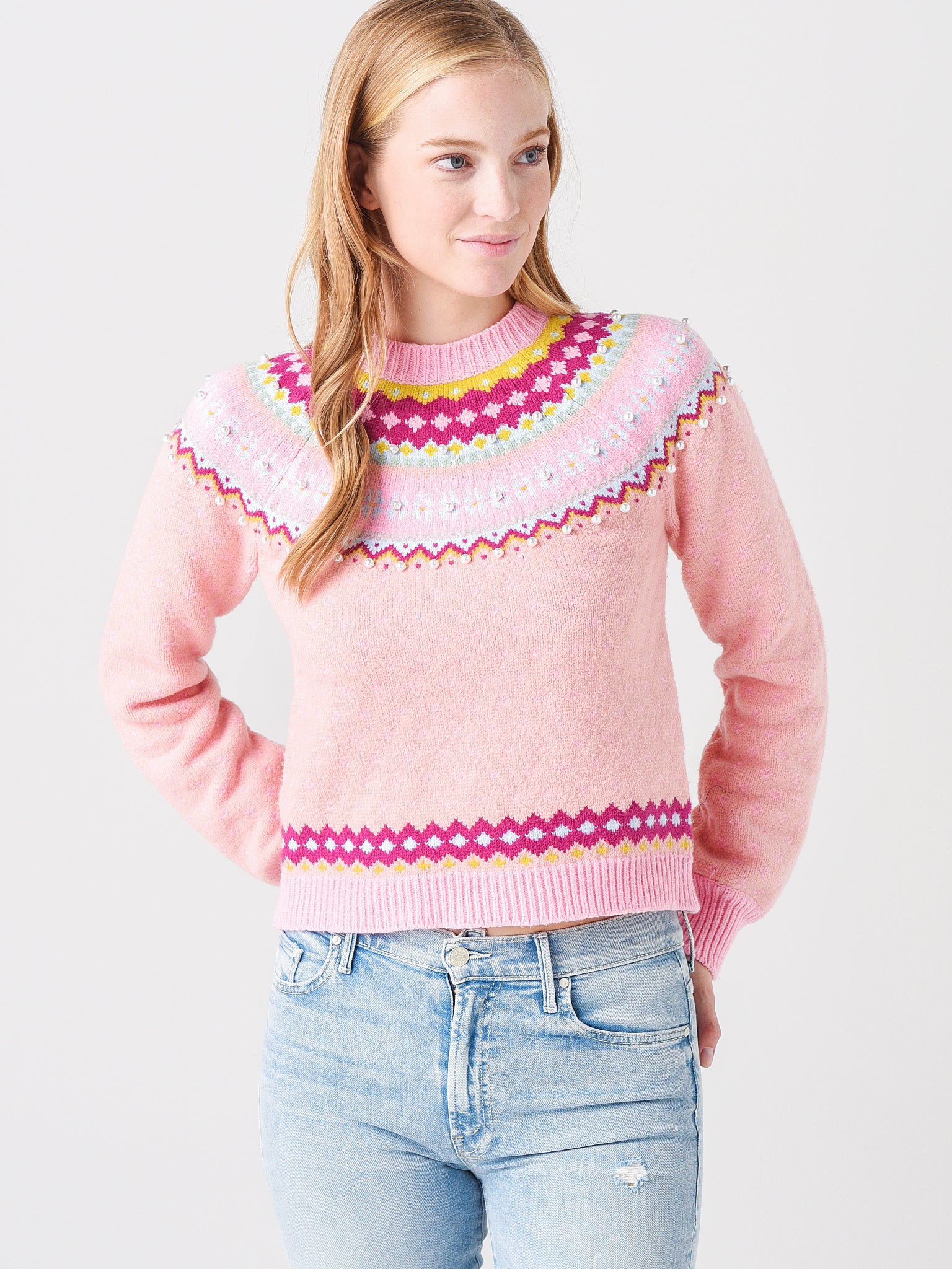 Slim pullover sweater with charming English fairisle print and mini pearl embellishments.