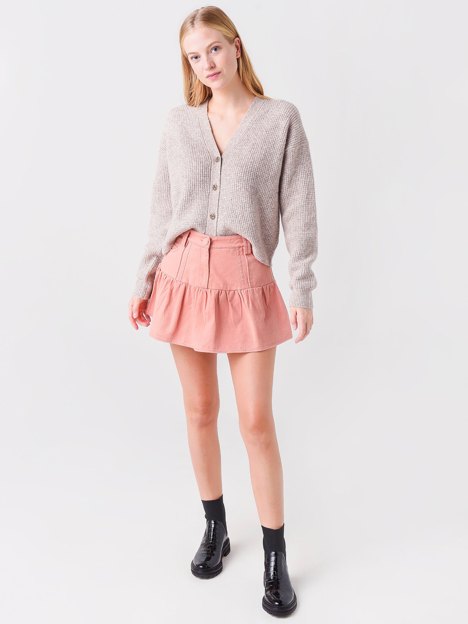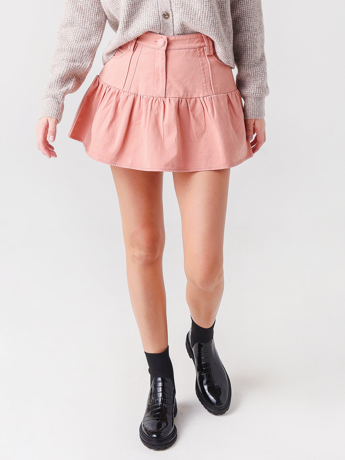 Mini denim-style skirt with seaming details, button closure and a flounce hem.