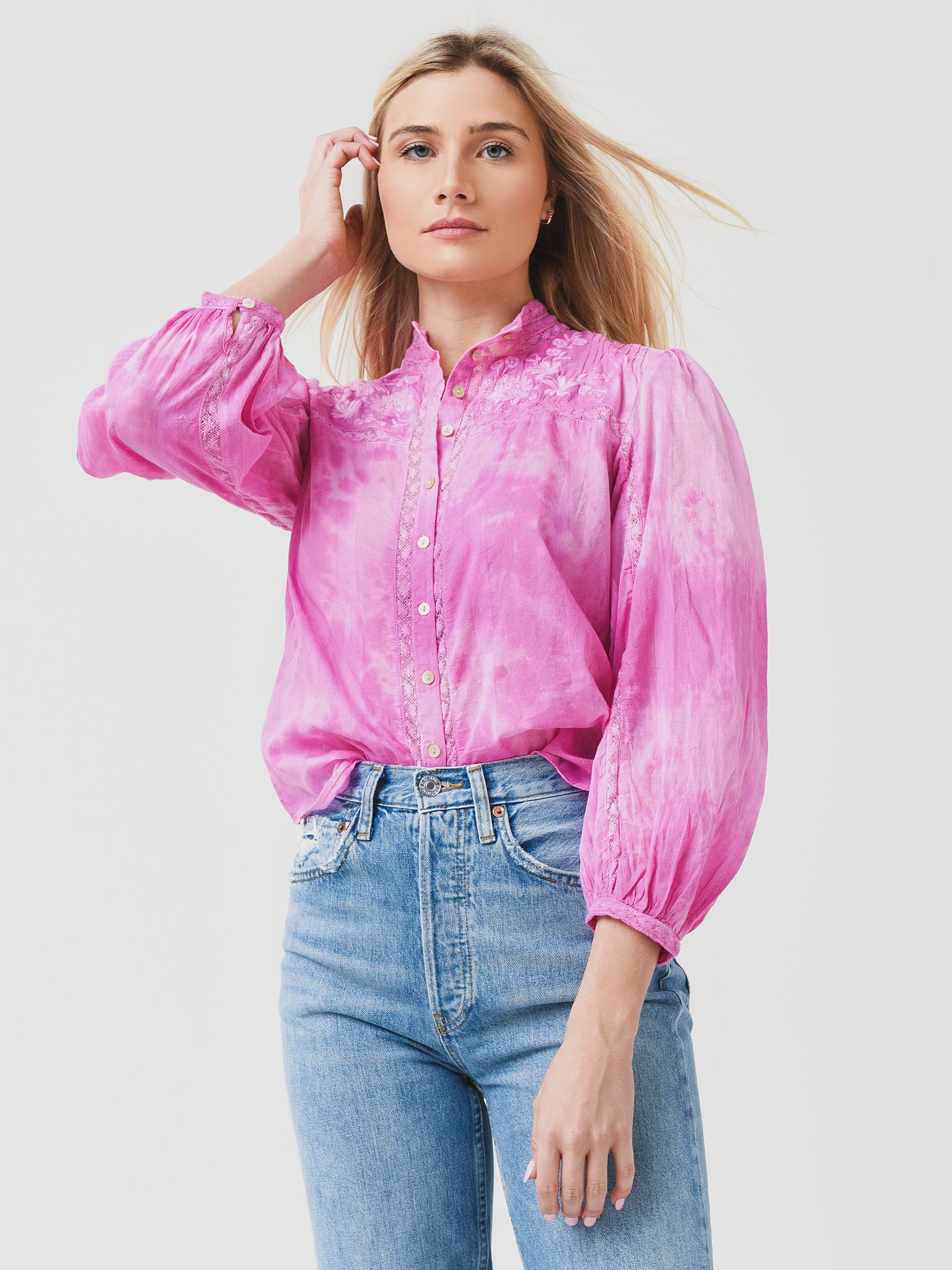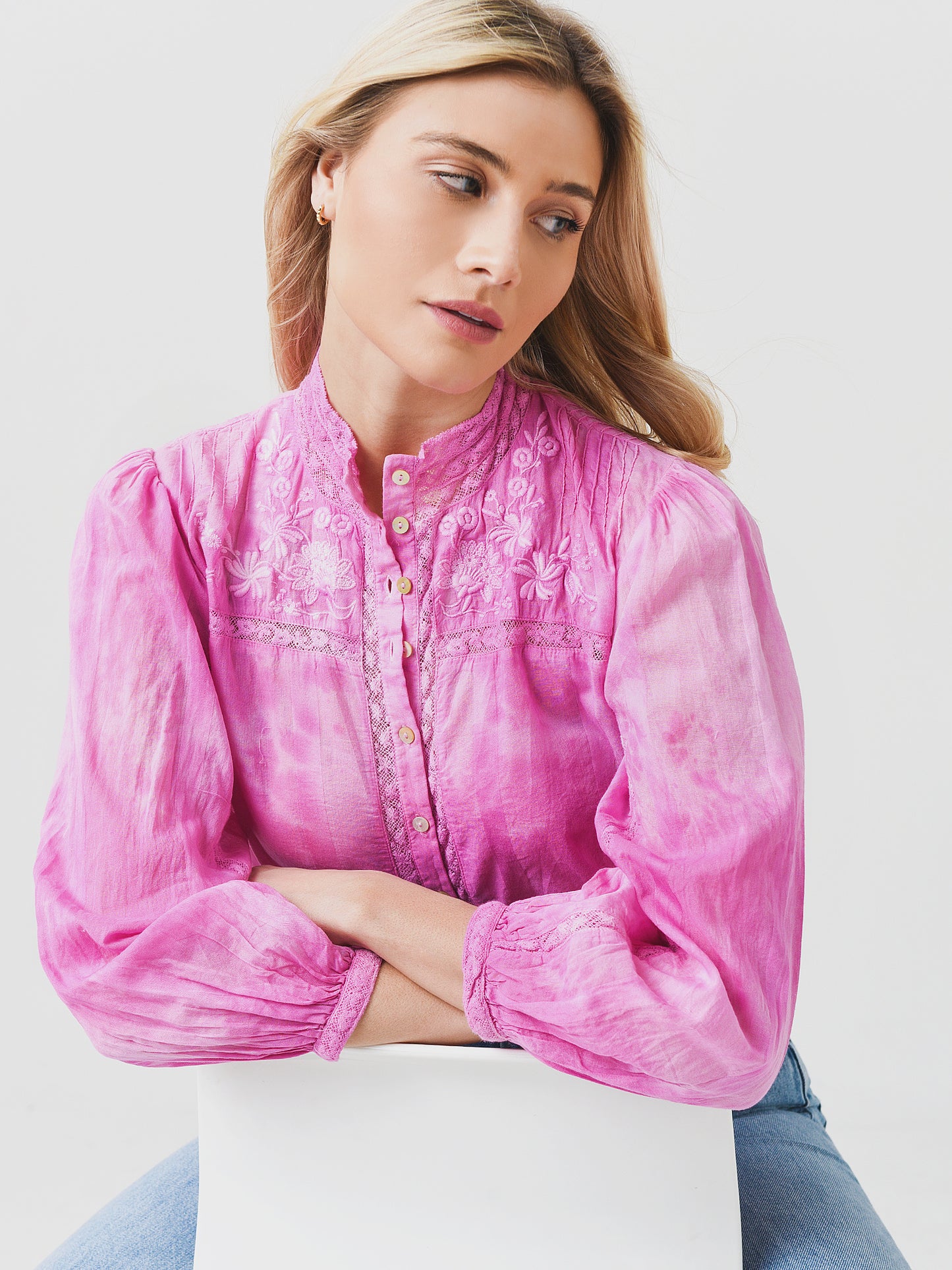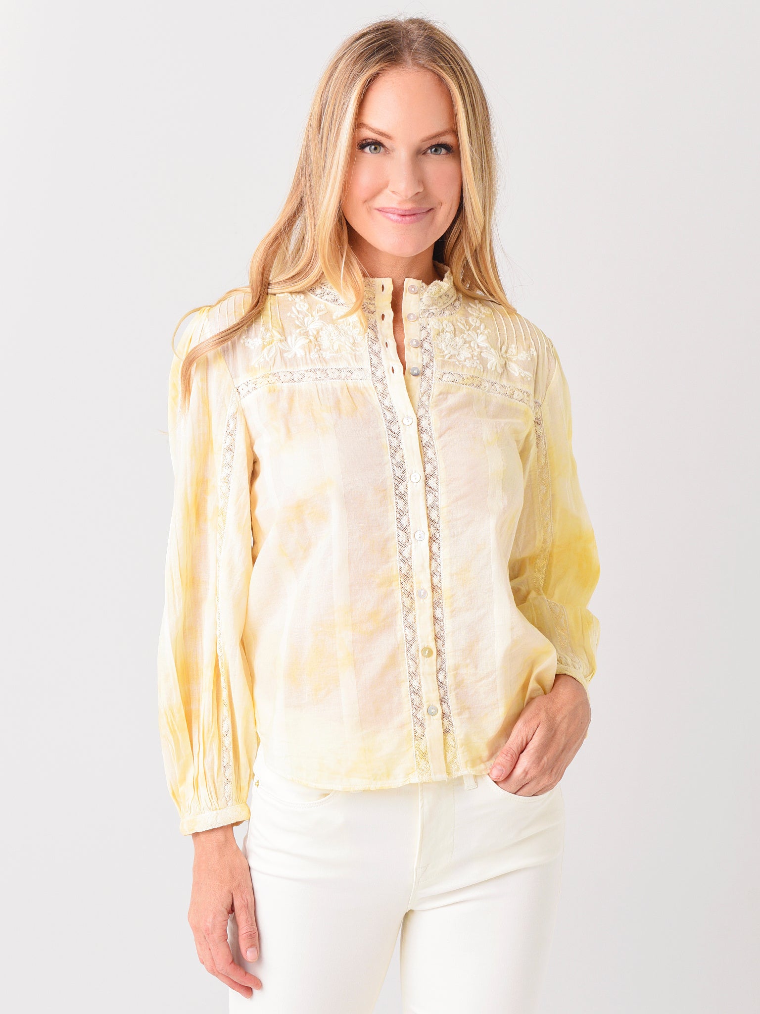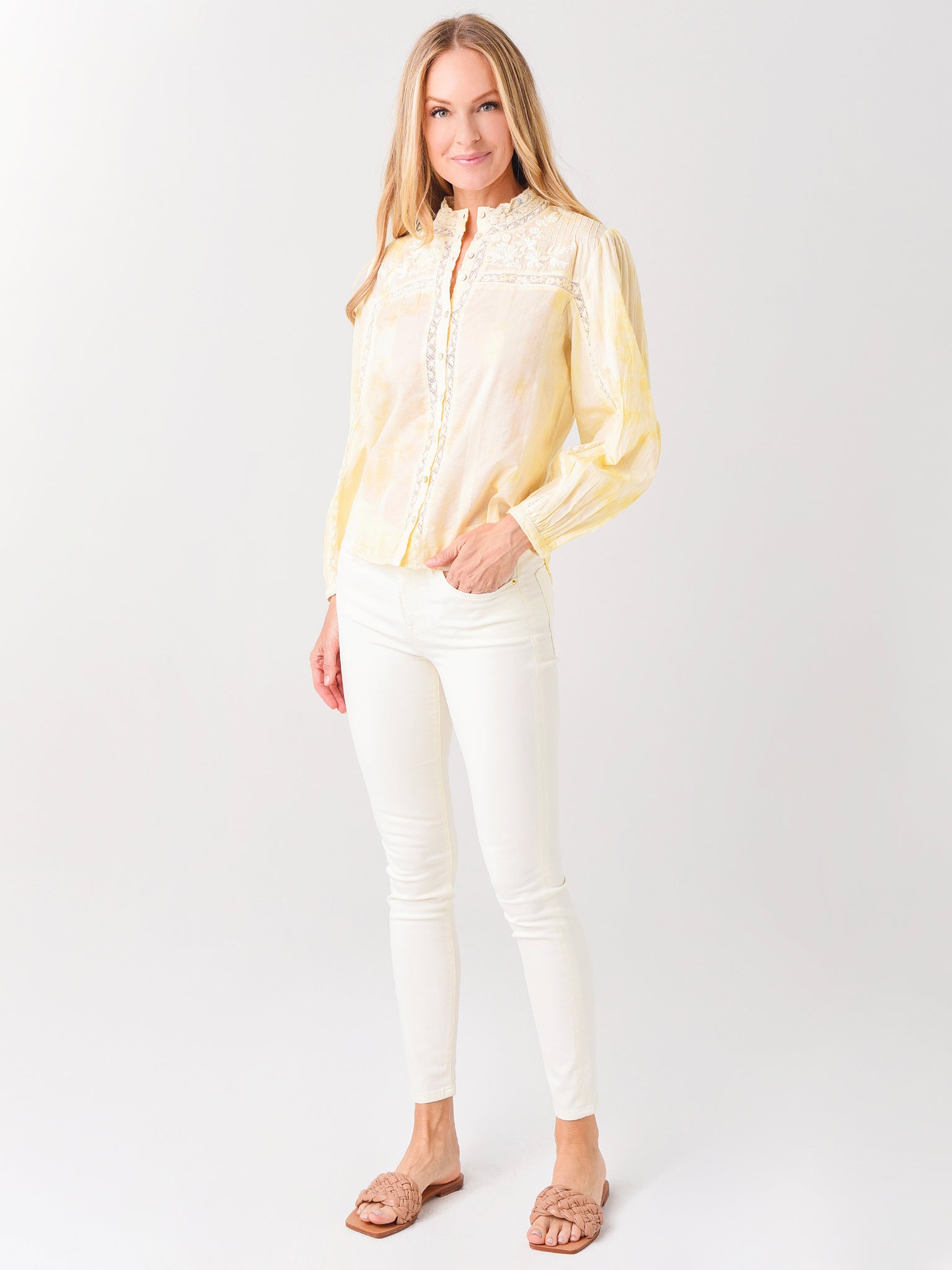 Button-down blouse with feminine details and a wildflower embroidered yoke.