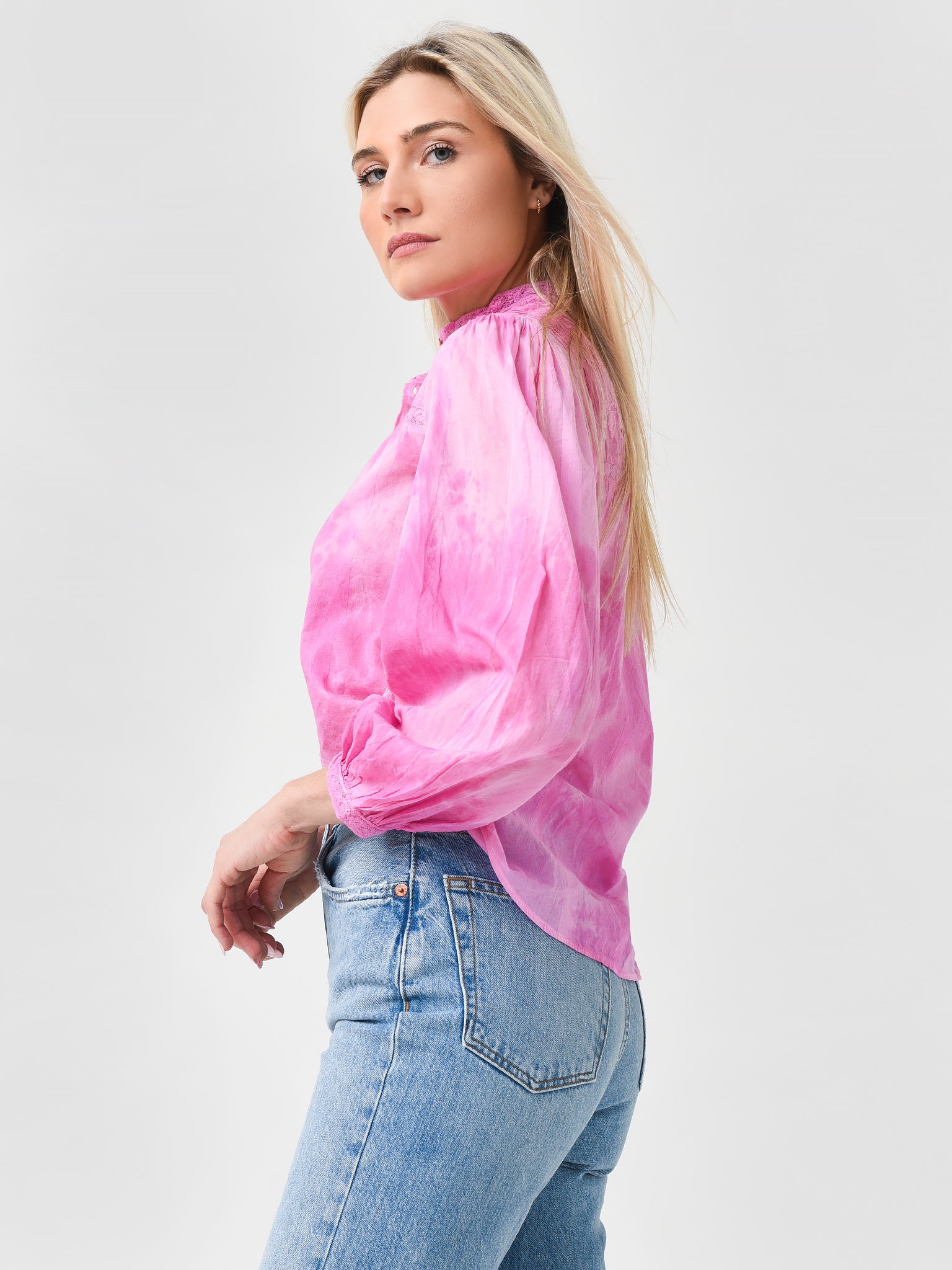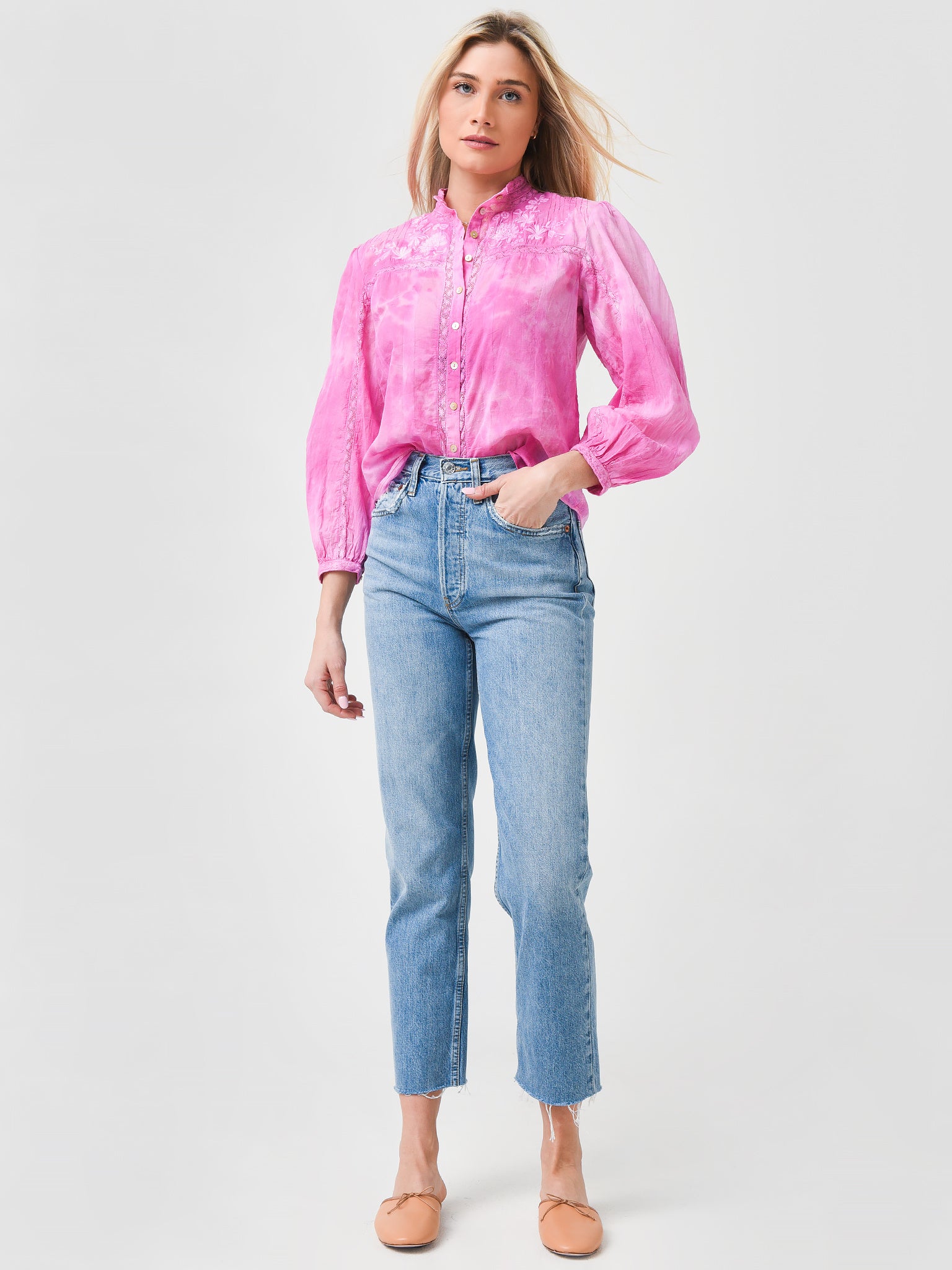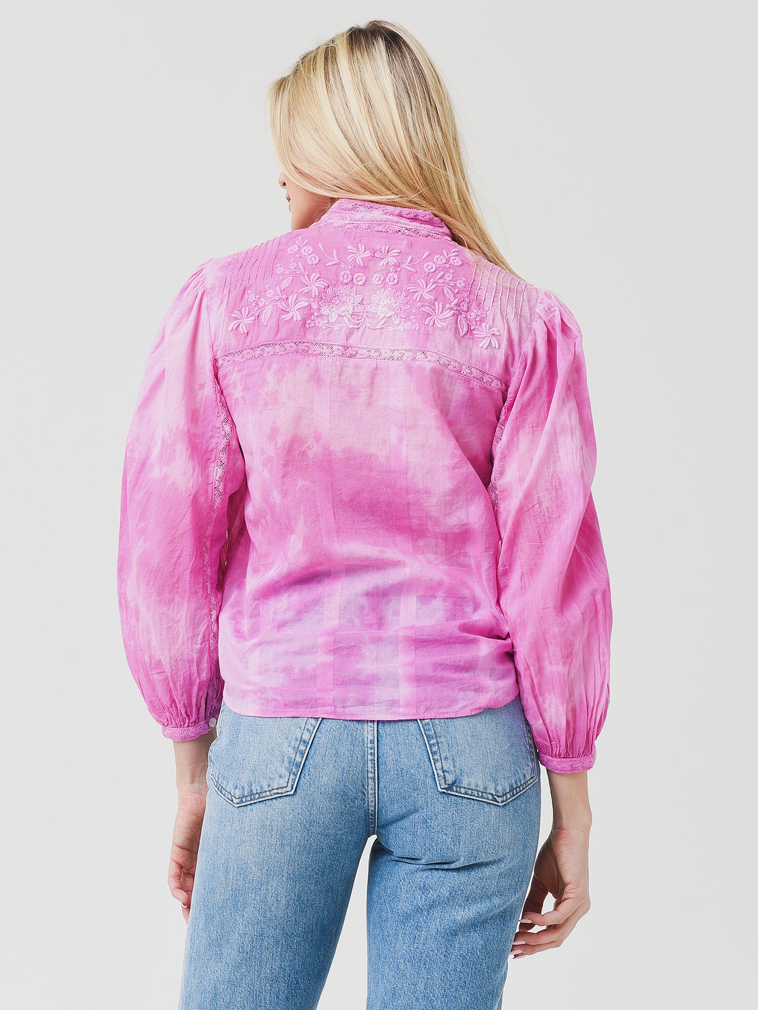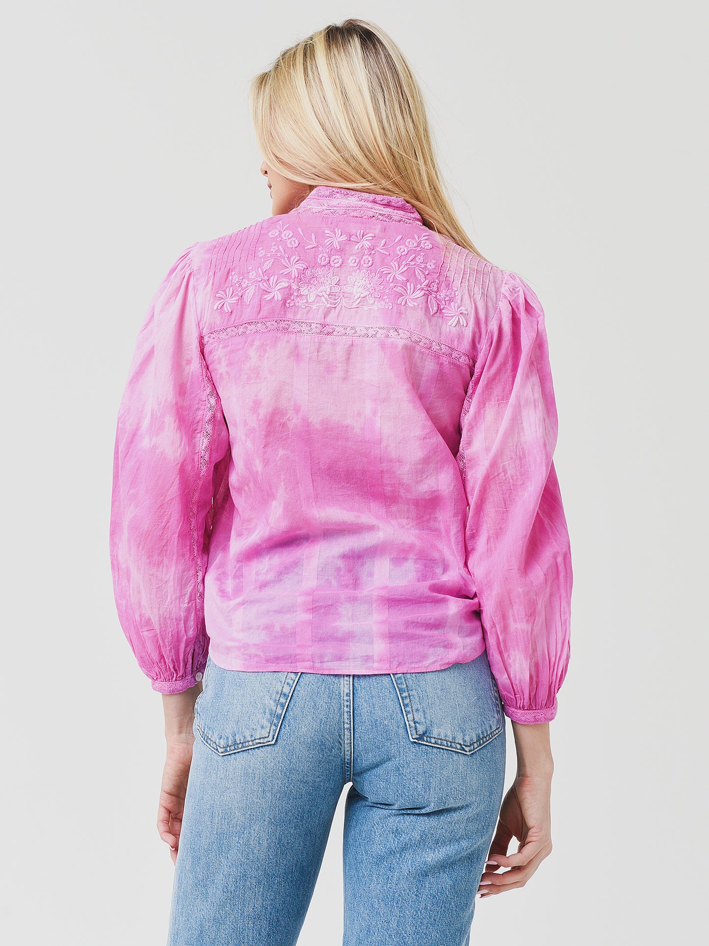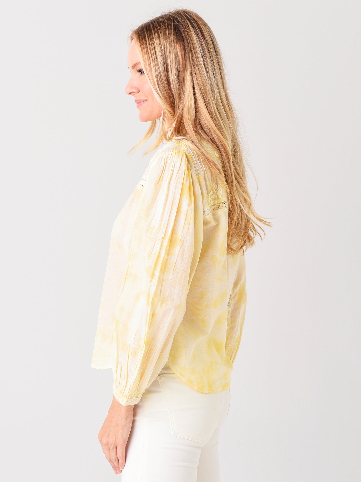 Button-down blouse with feminine details and a wildflower embroidered yoke.