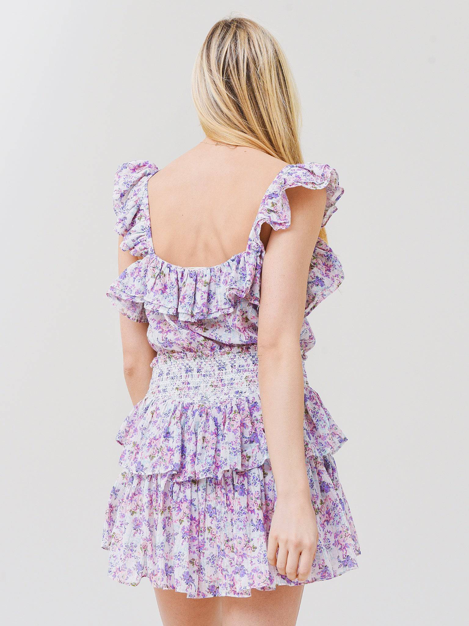 Floral-printed mini dress with decorative ruffles.
