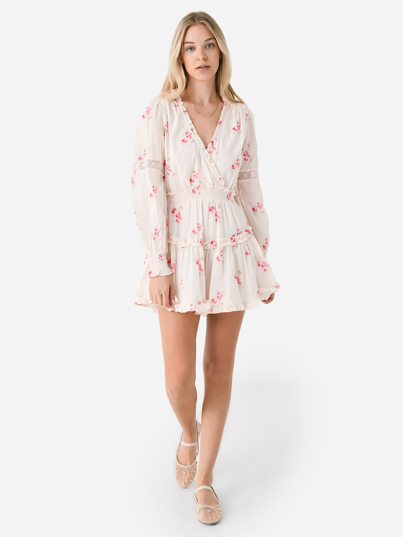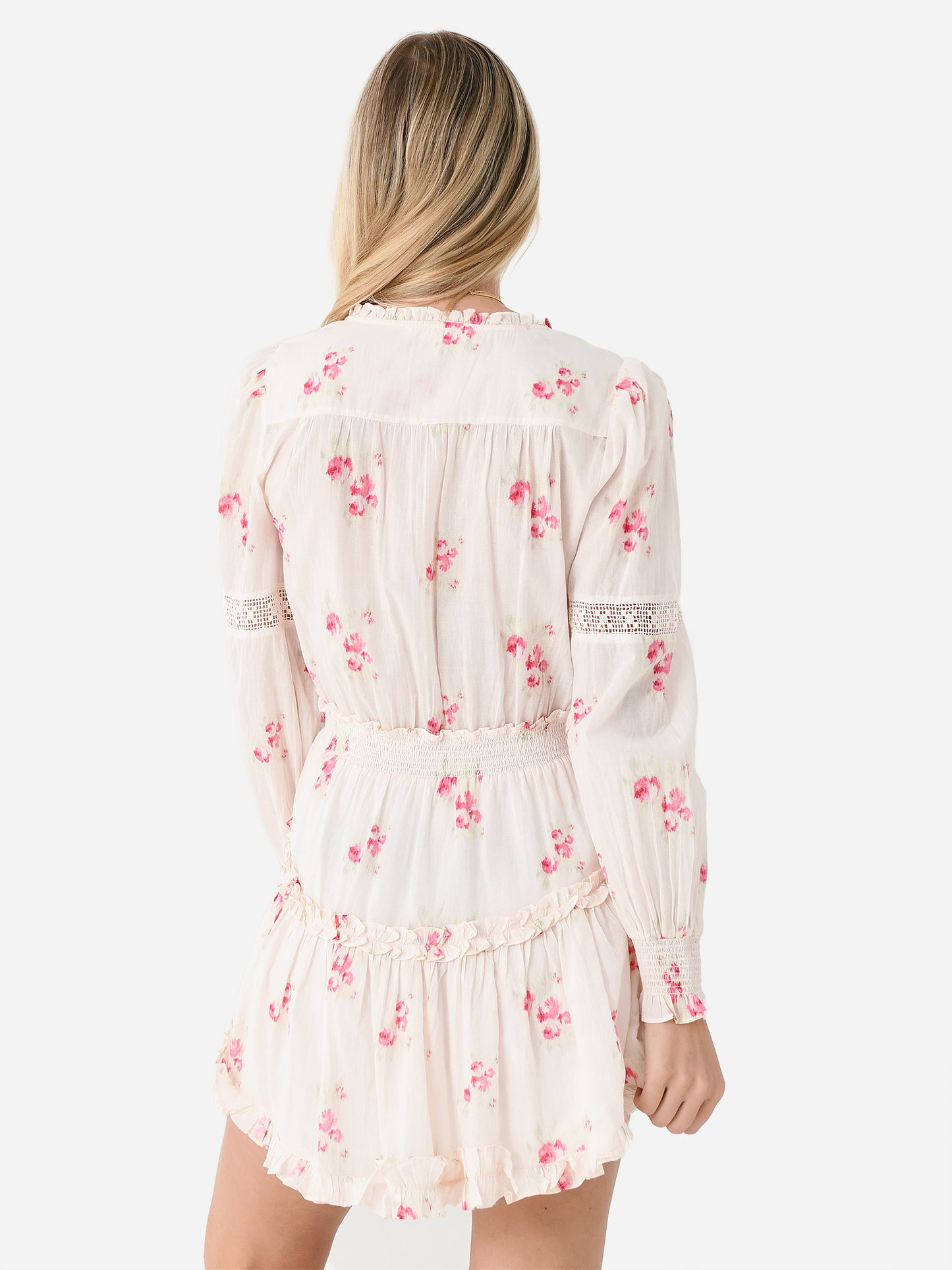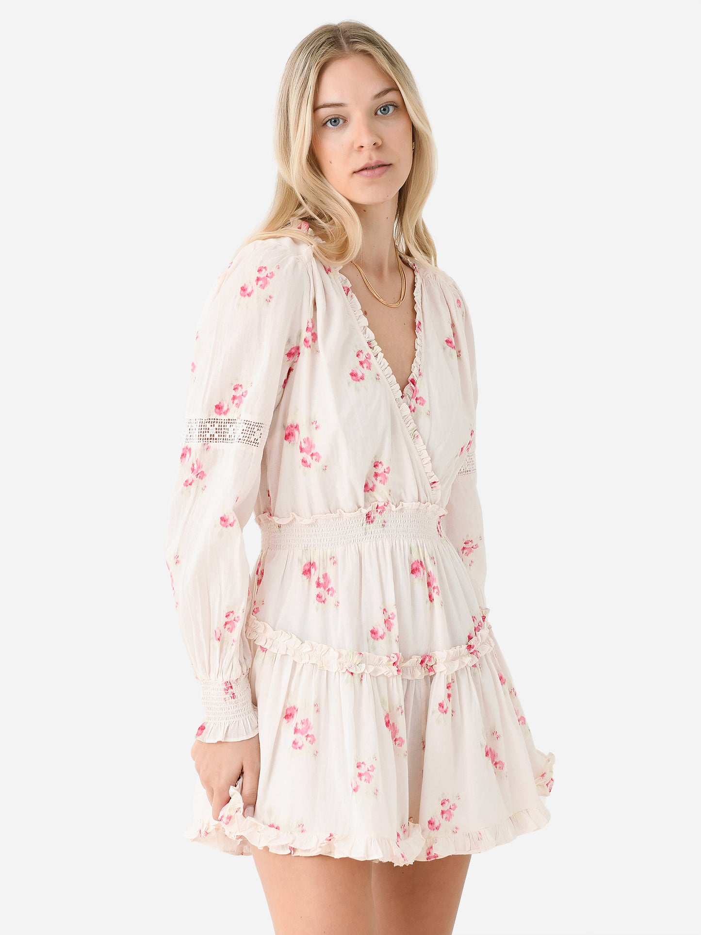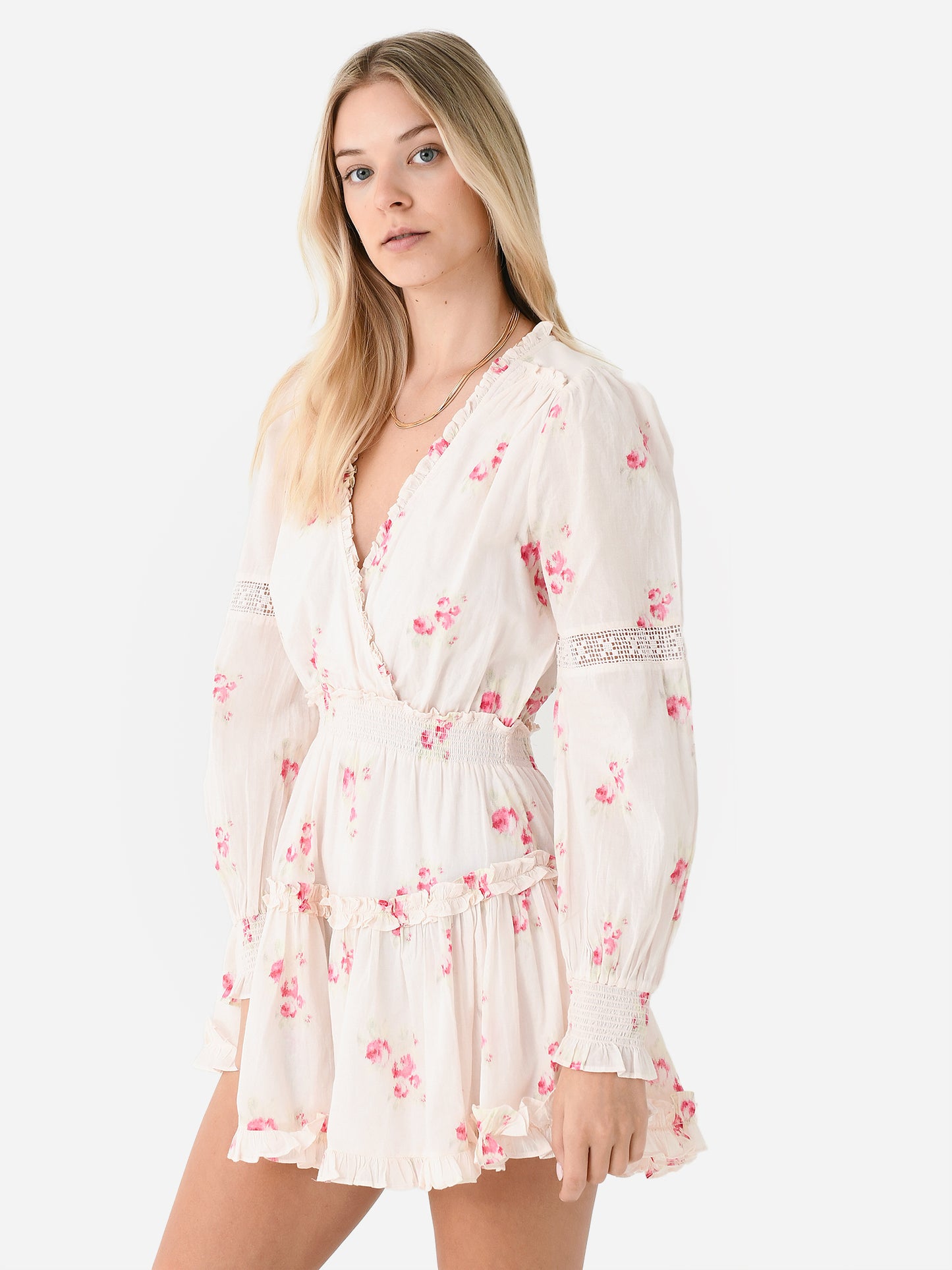 A lightweight cotton dress featuring blouson sleeves, ruffle trims, and a French-inspired ikat floral print.