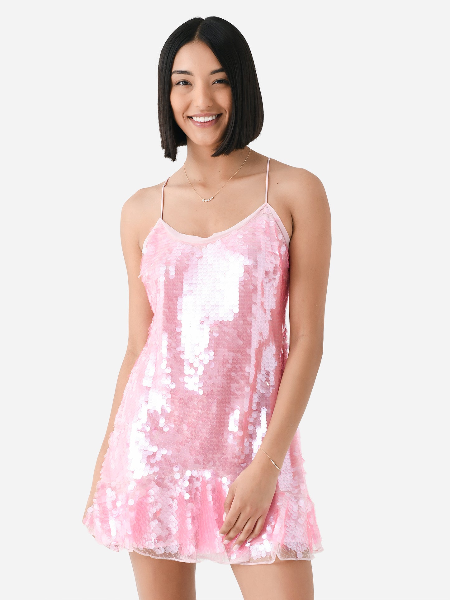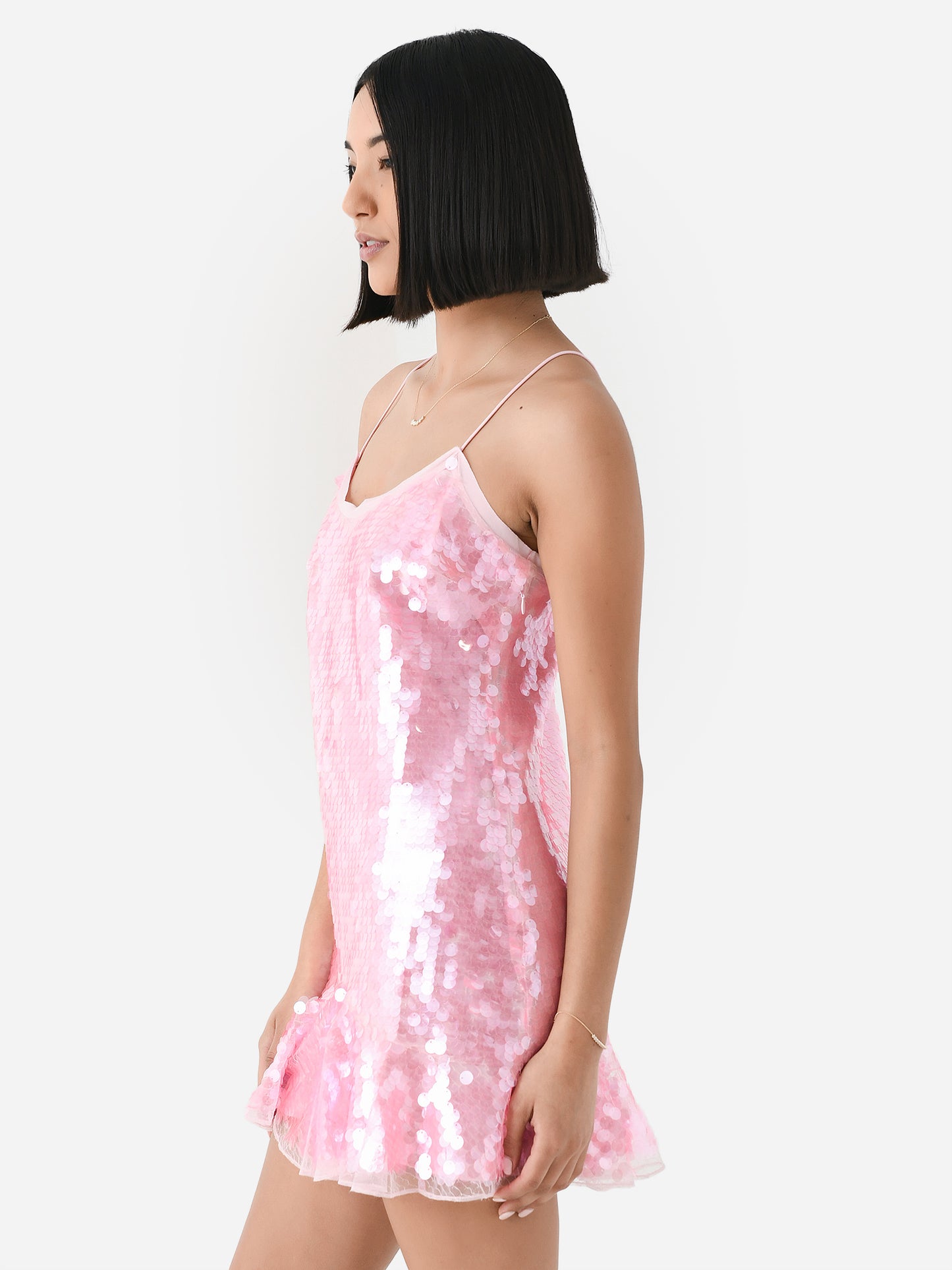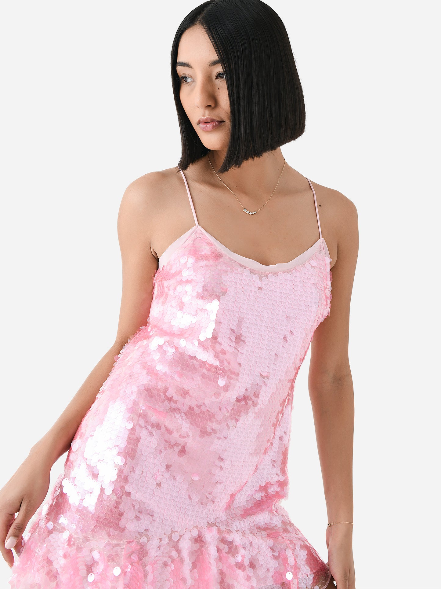 A feminine mini dress with a semi-sheer construction and all-over shimmering sequin paillettes.