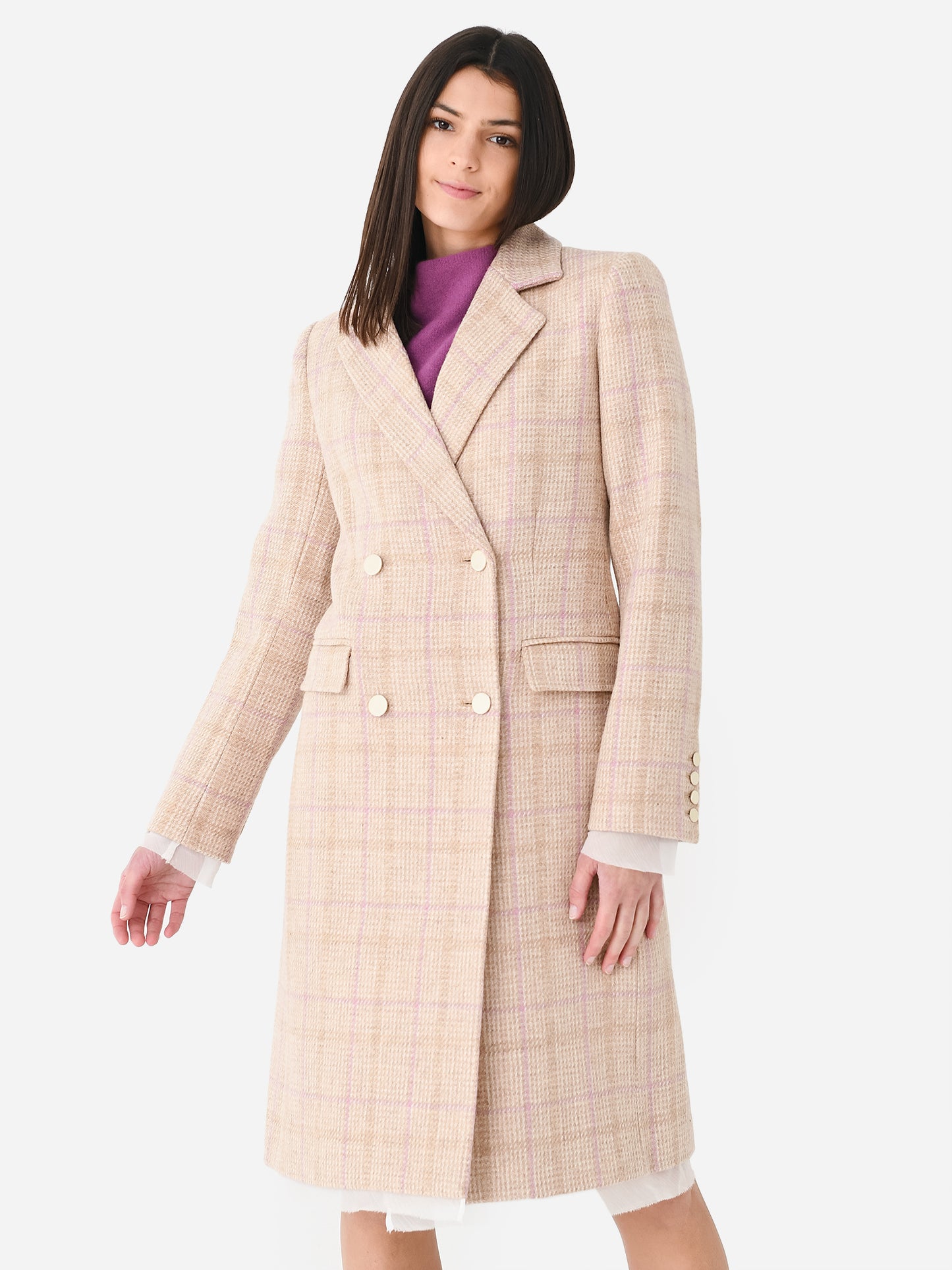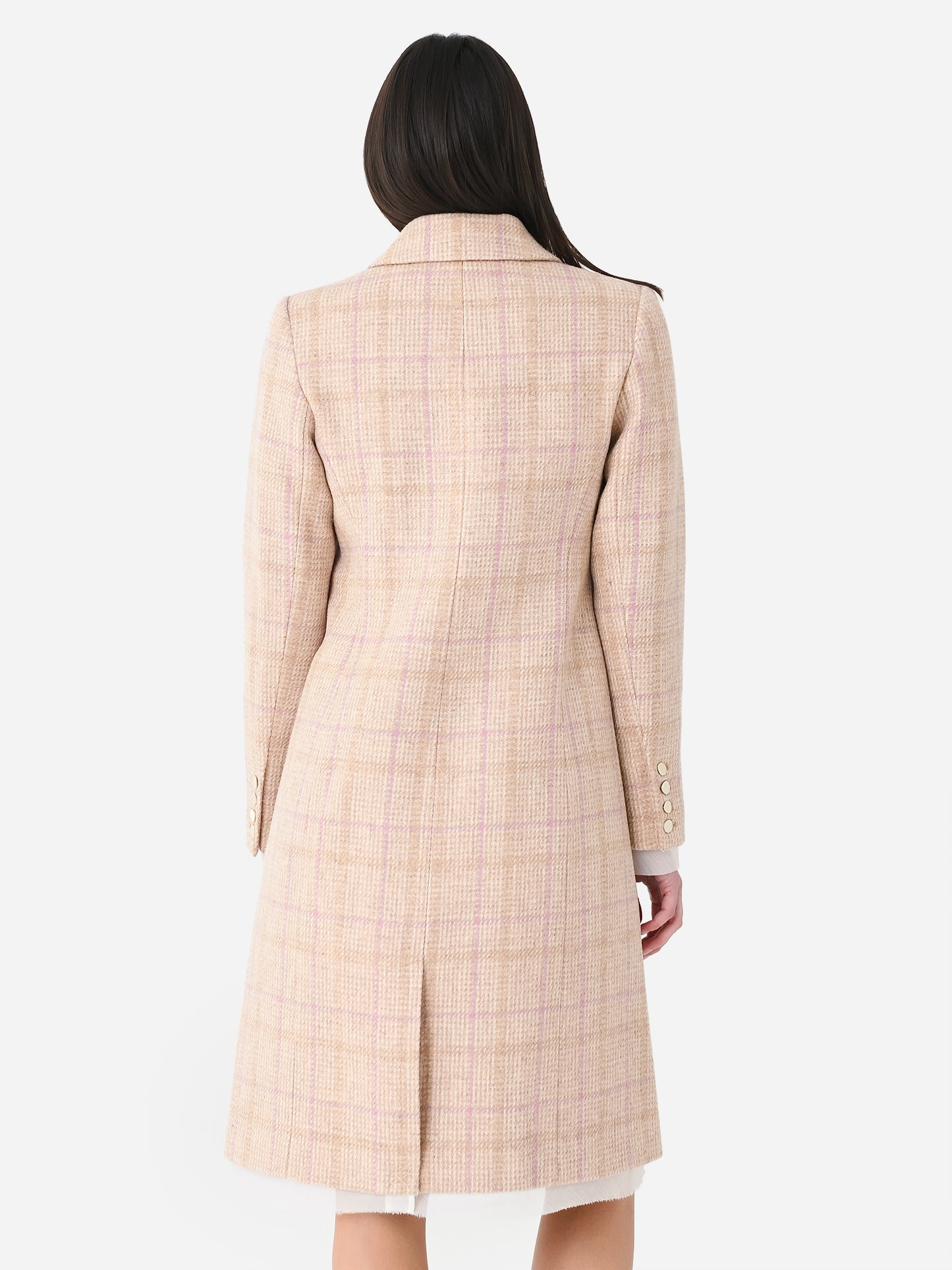 A longline plaid coat made from wool with a dainty chiffon trim.