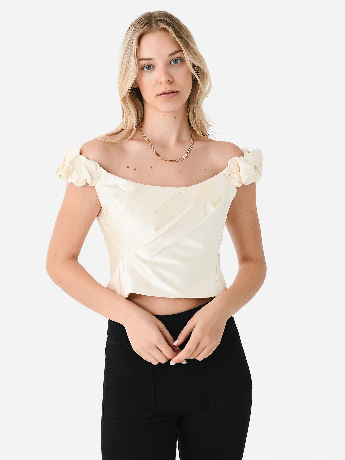 A satin cropped top with an off-the-shoulder style and a gathered construction.