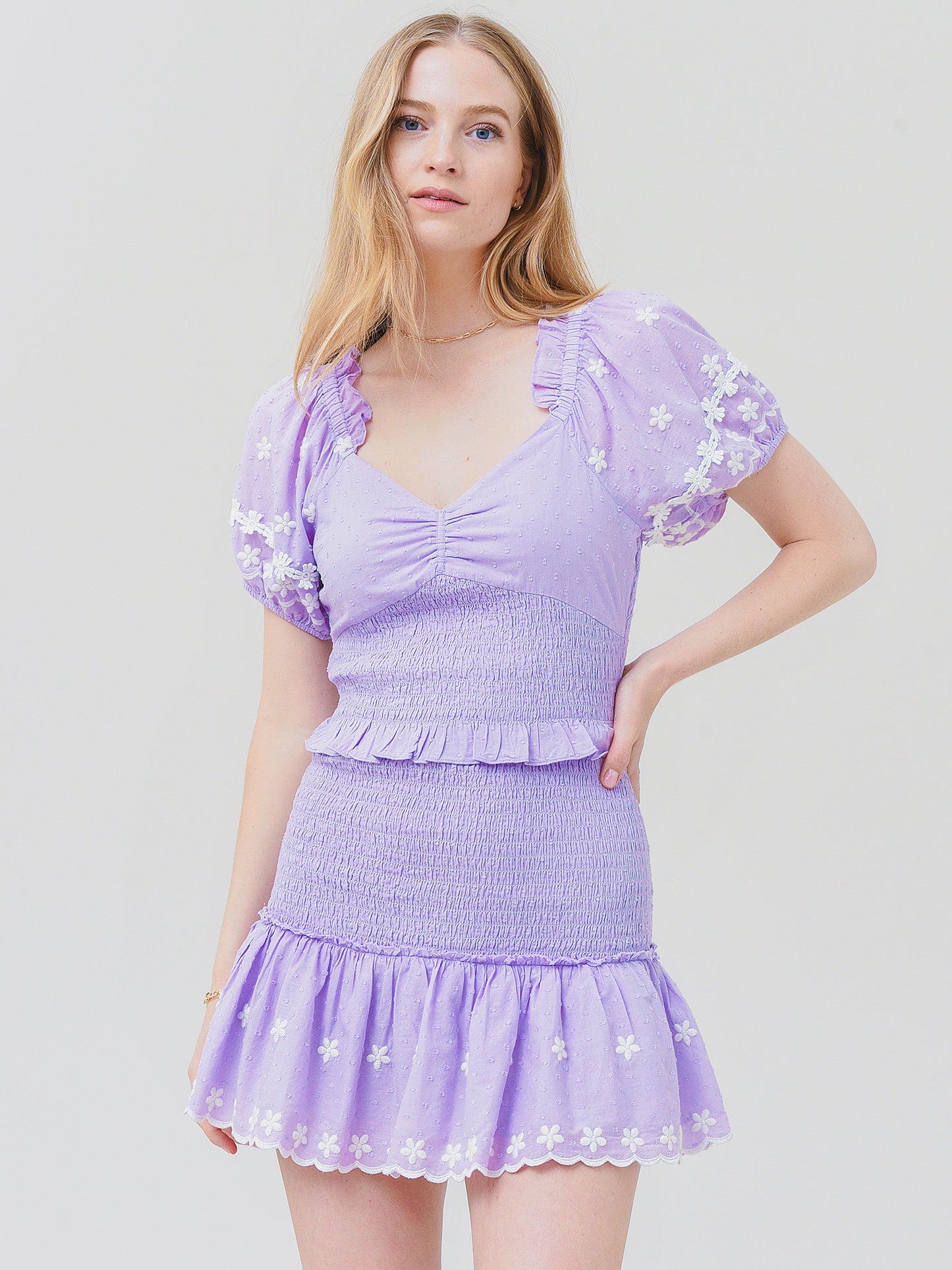 Smocked mini dress with floral applique details.