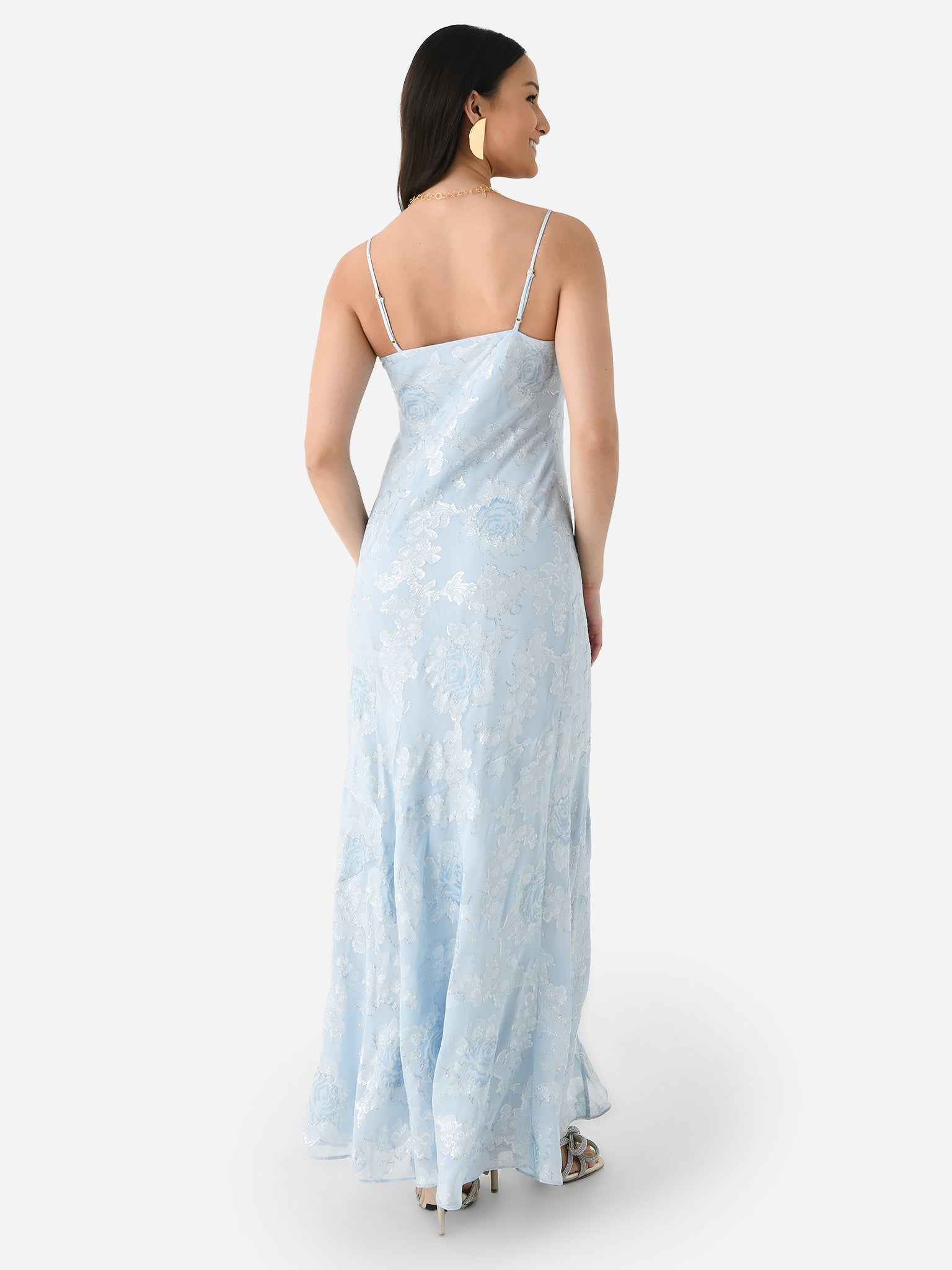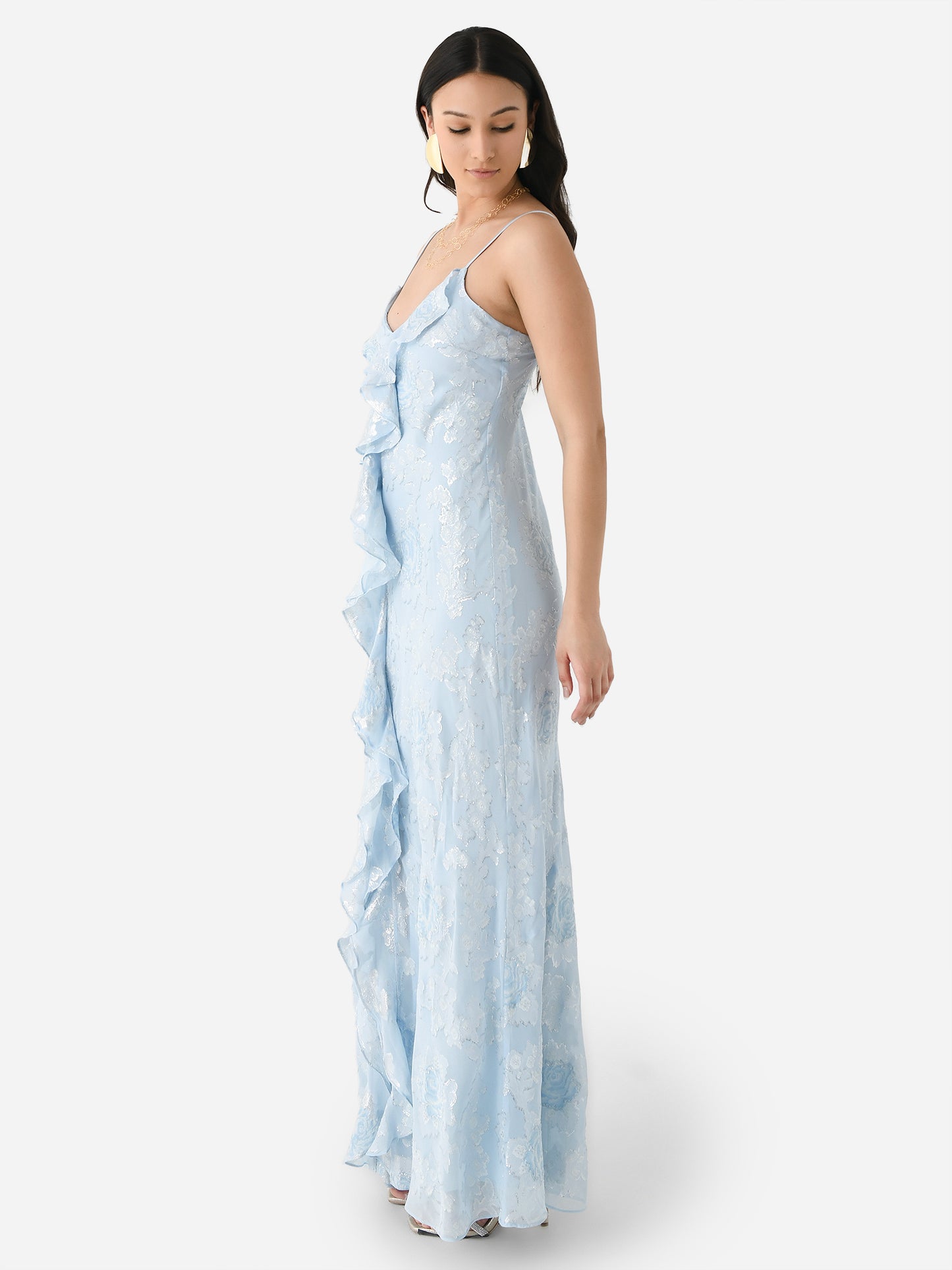 A long, flowy dress featuring a front cascading ruffle and textured, metallic floral print throughout.
