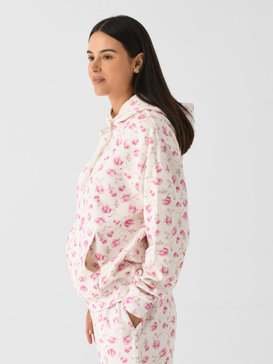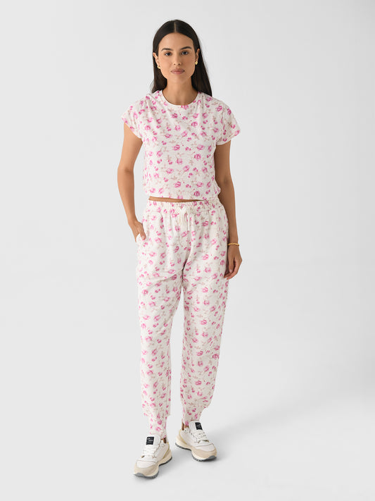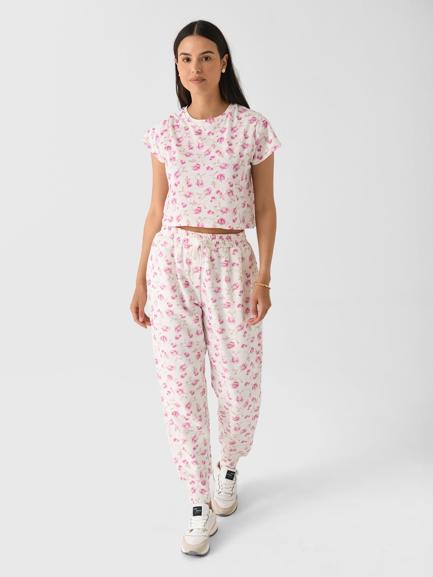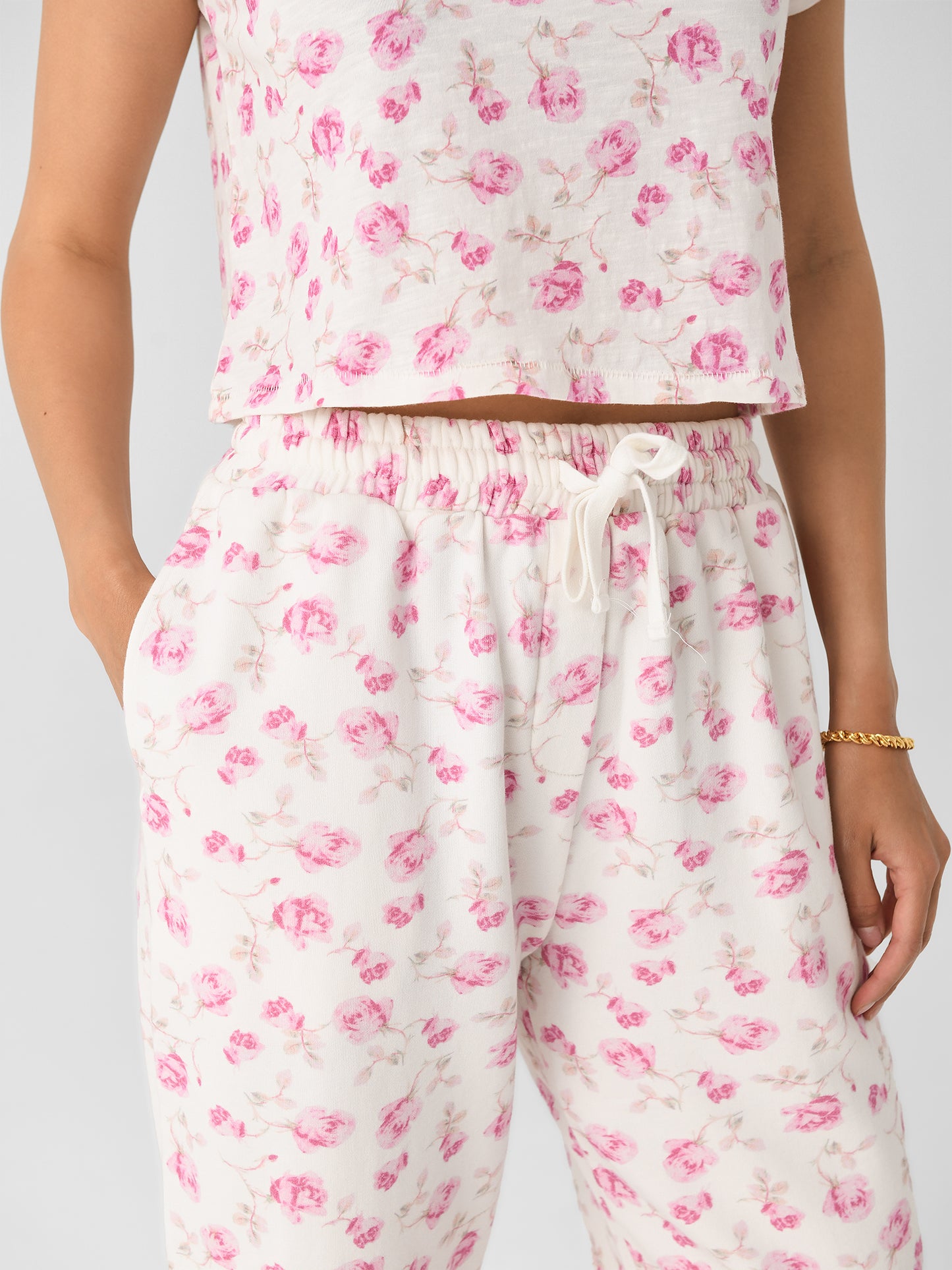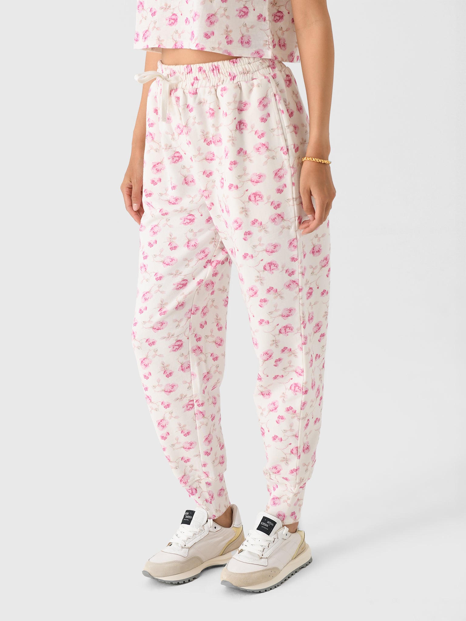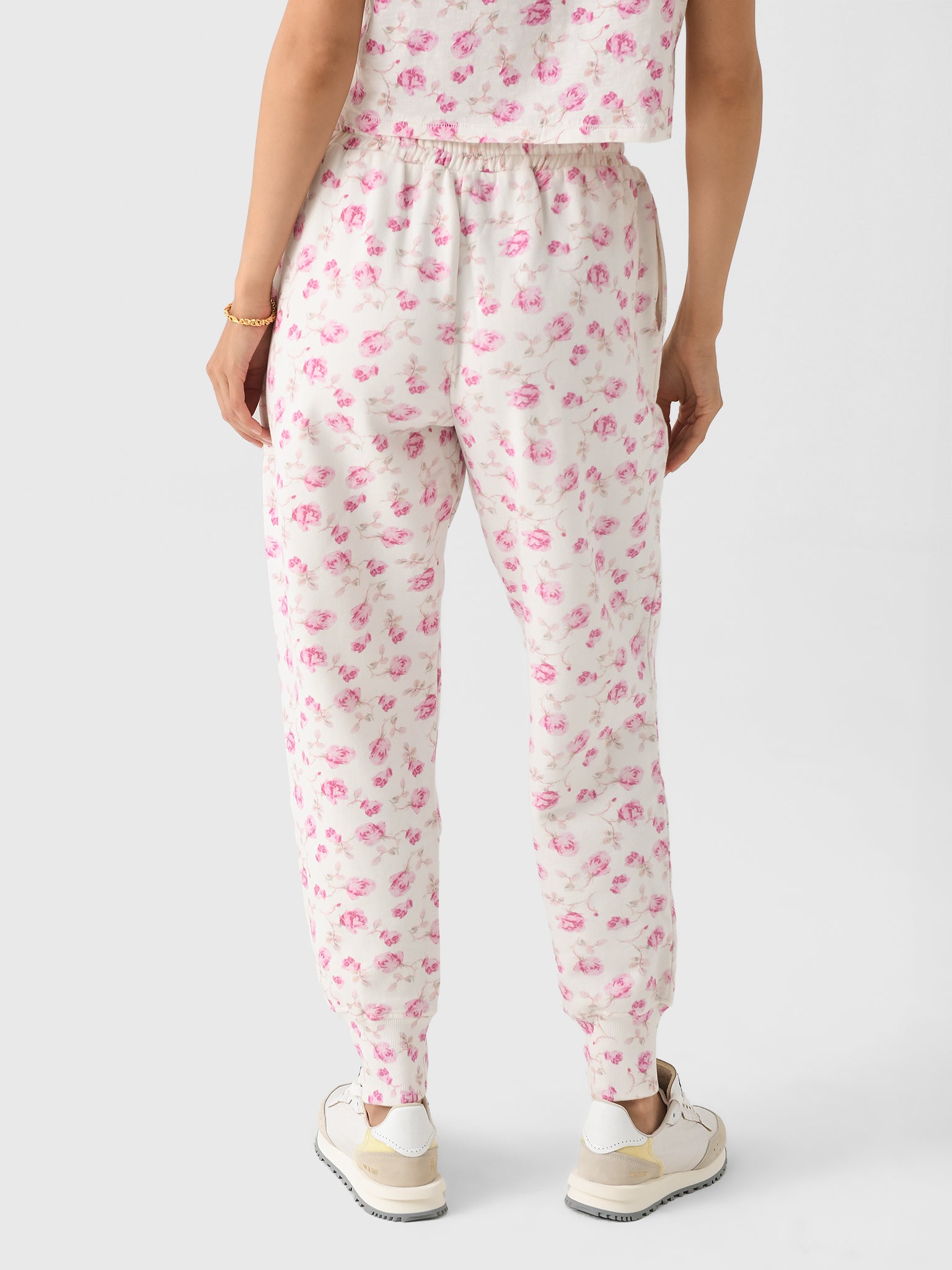 A cozy sweatpant made from plush cotton fabric featuring a feminine floral print.