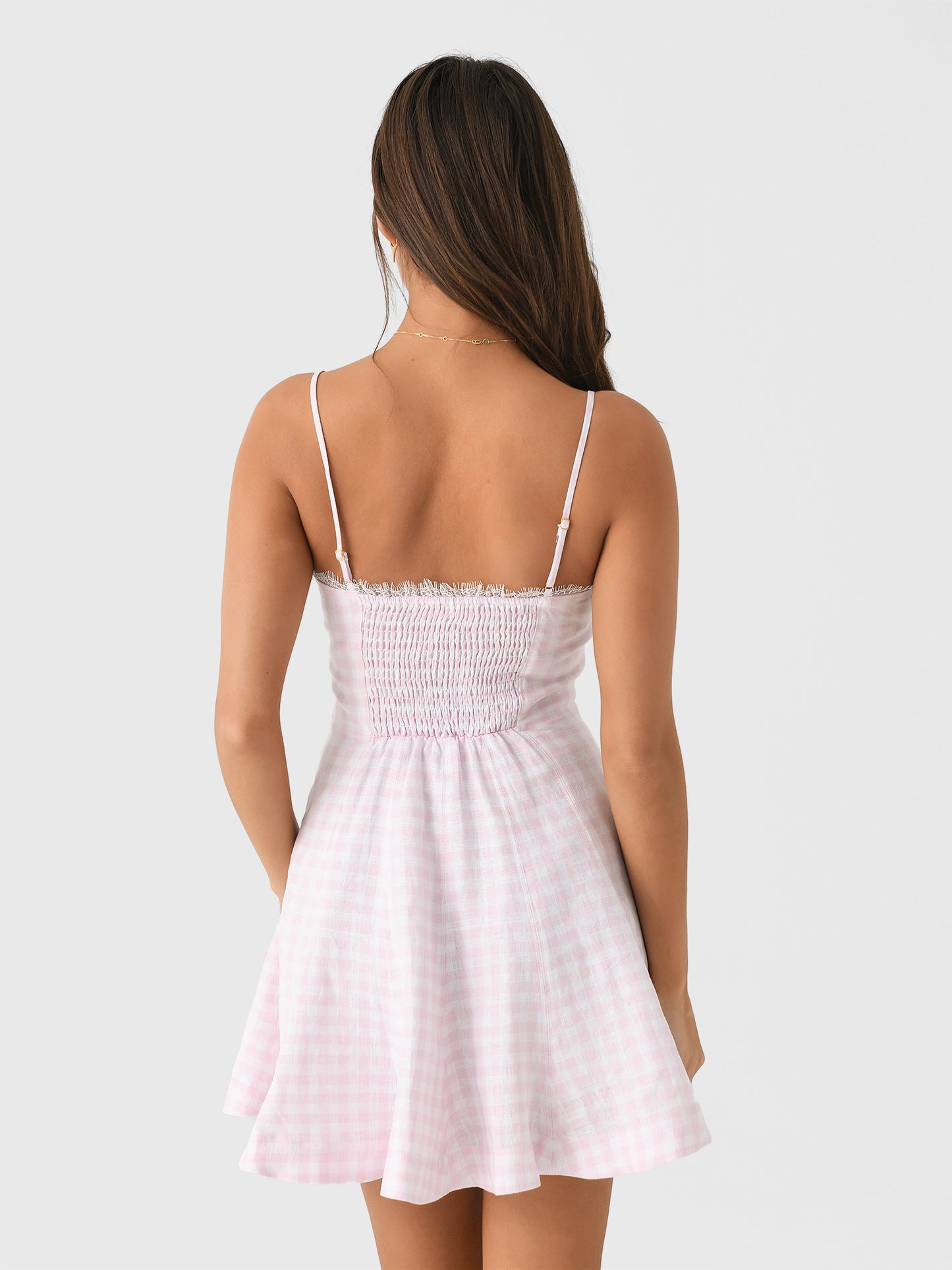 A charming mini dress made from gingham-printed linen fabric with a fitted bodice and flare skirt creating a flattering silhouette.