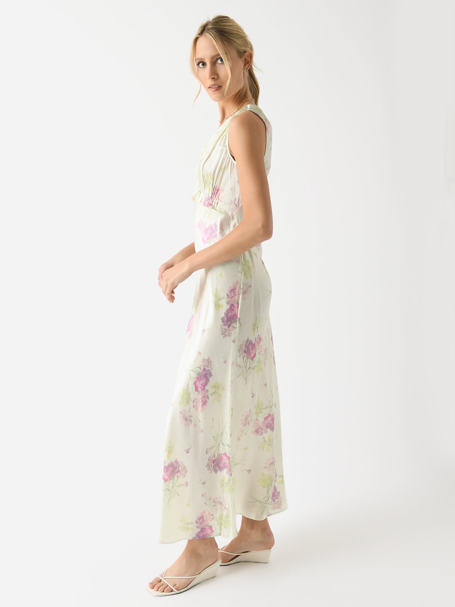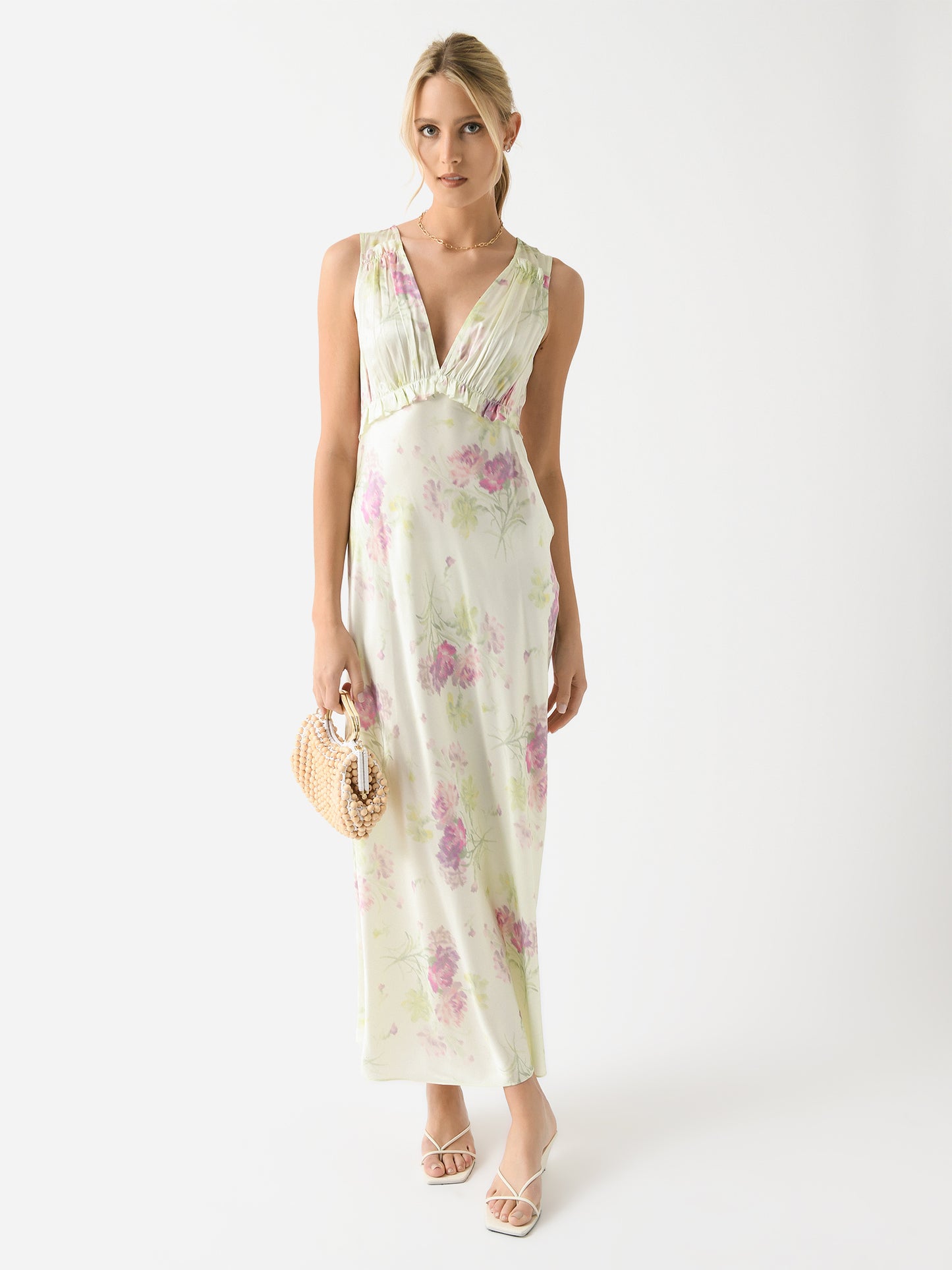 A maxi-length silk dress with a bohemian design and a vintage-inspired floral print.
