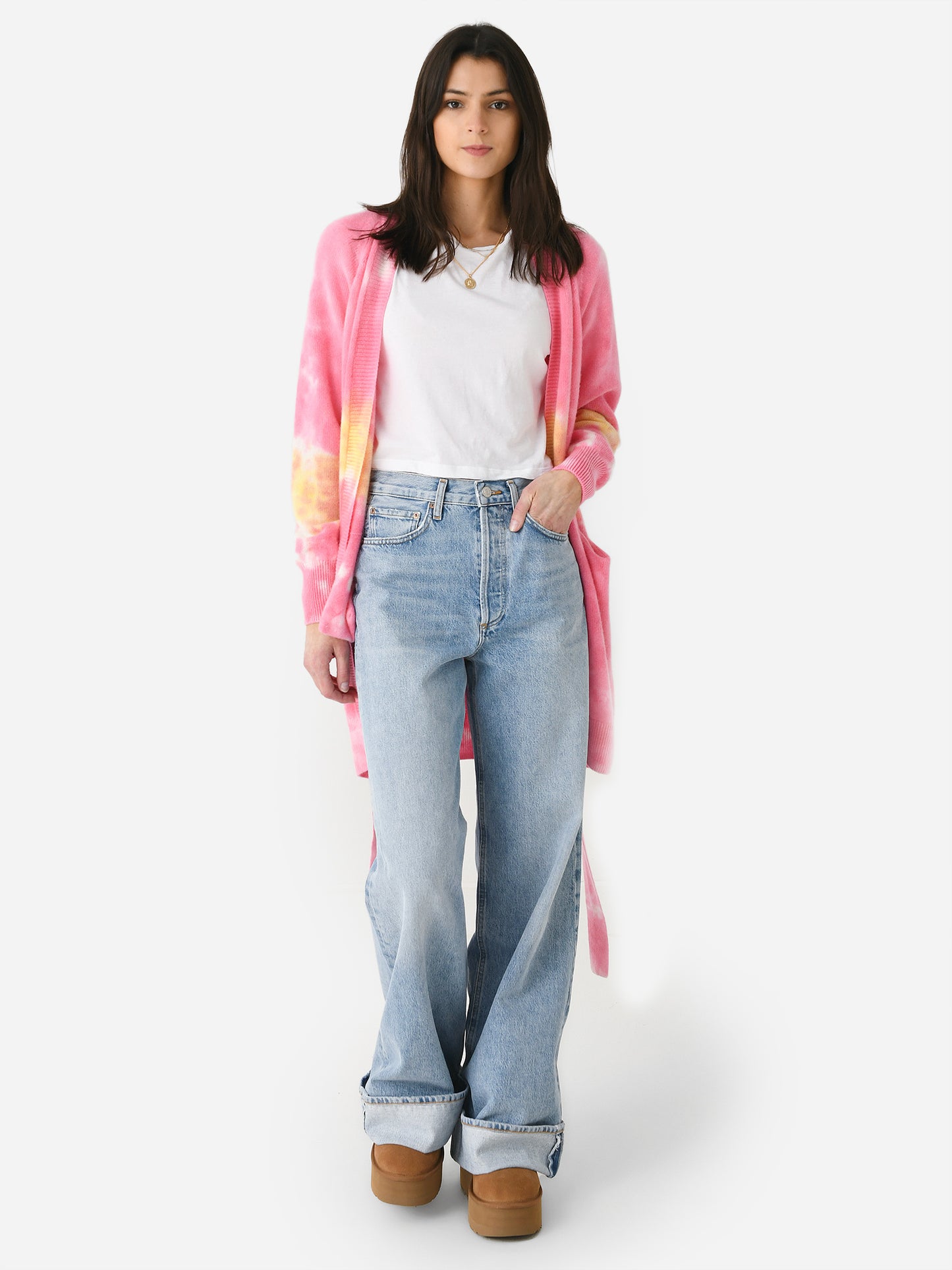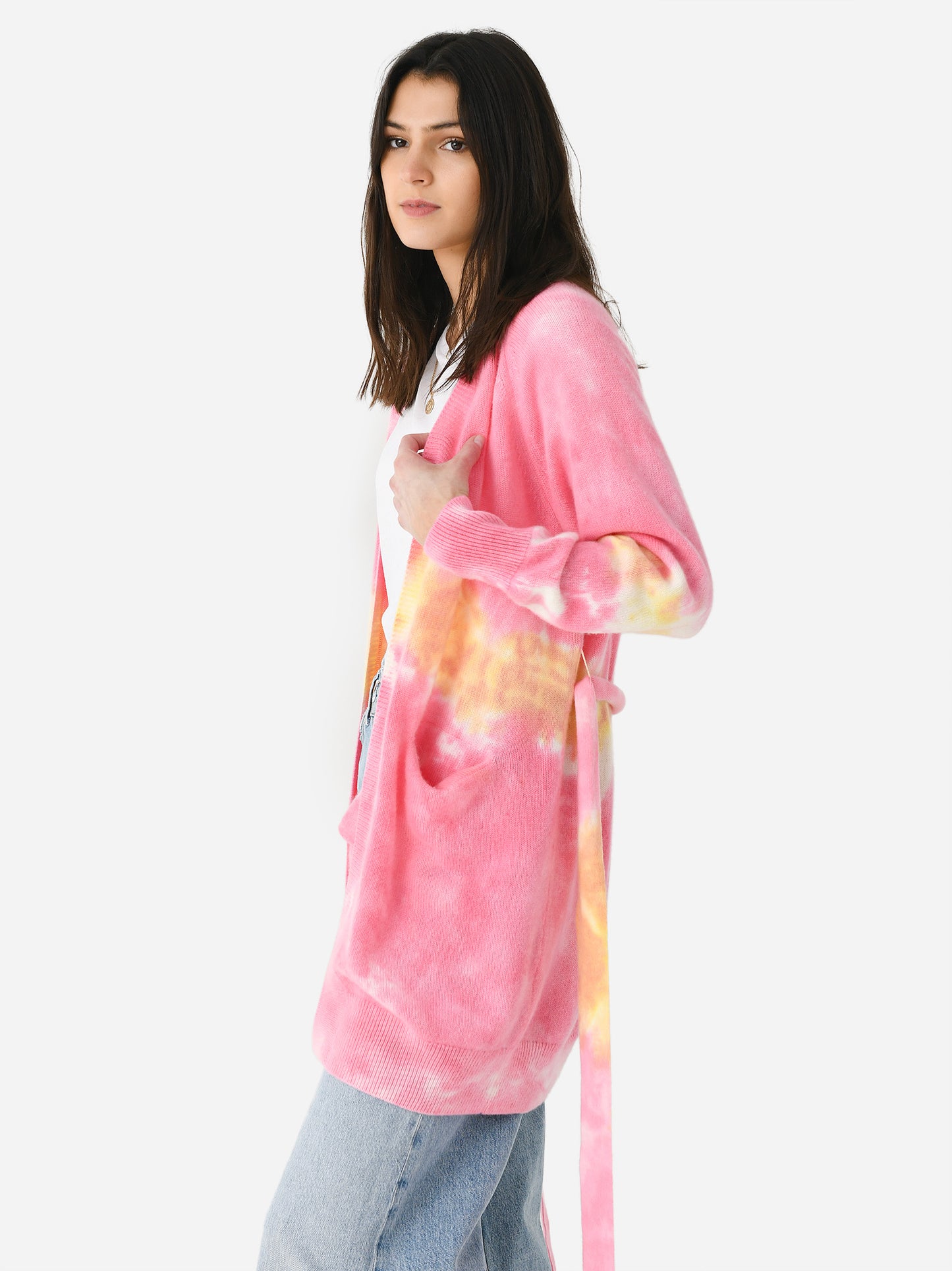 An ultra cozy belted cardigan made from soft cashmere with a bright tie-dye print.