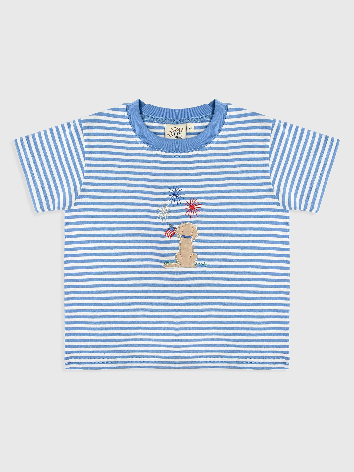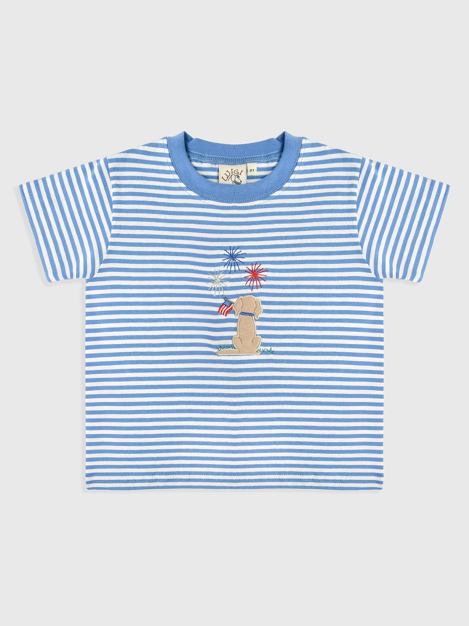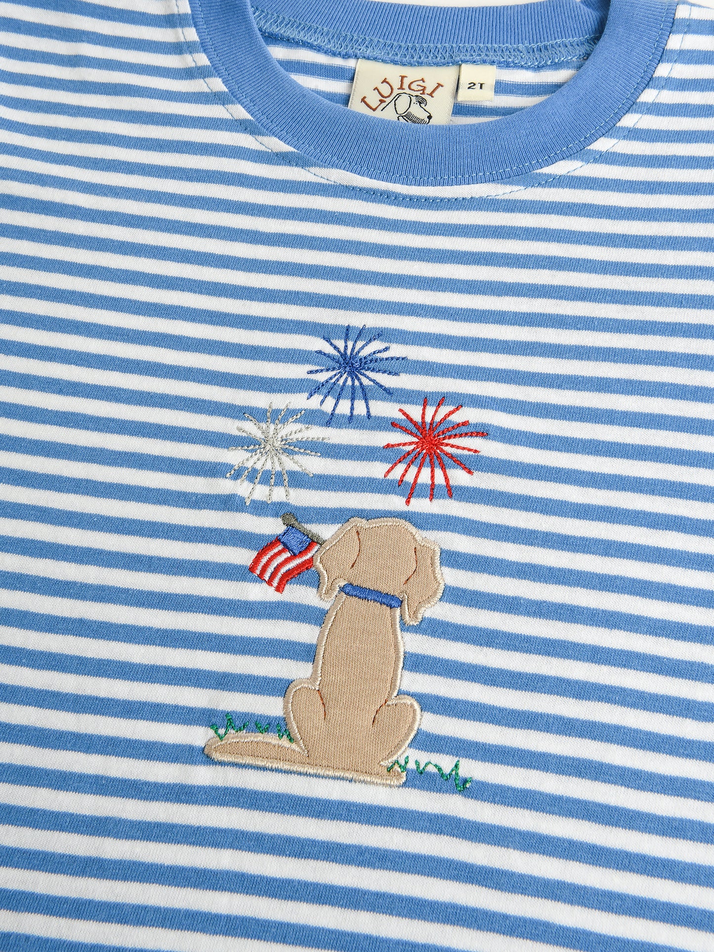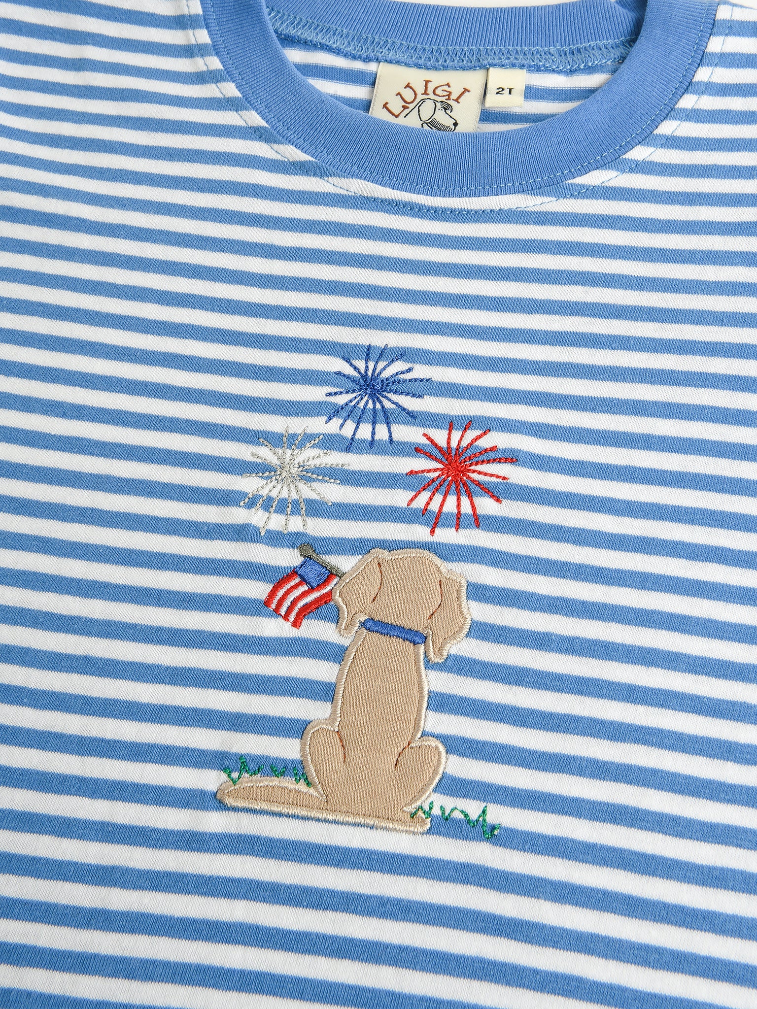A soft cotton shirt with a classic design and an embroidered dog watching fireworks graphic.