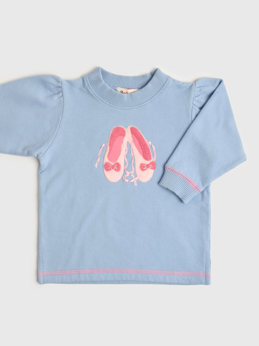 A cozy and cute essential, this cotton fleece sweatshirt features a charming ballet slipper graphic. Details include contrast stitching and subtle puff sleeves, making it the perfect soft layer for little ones.