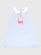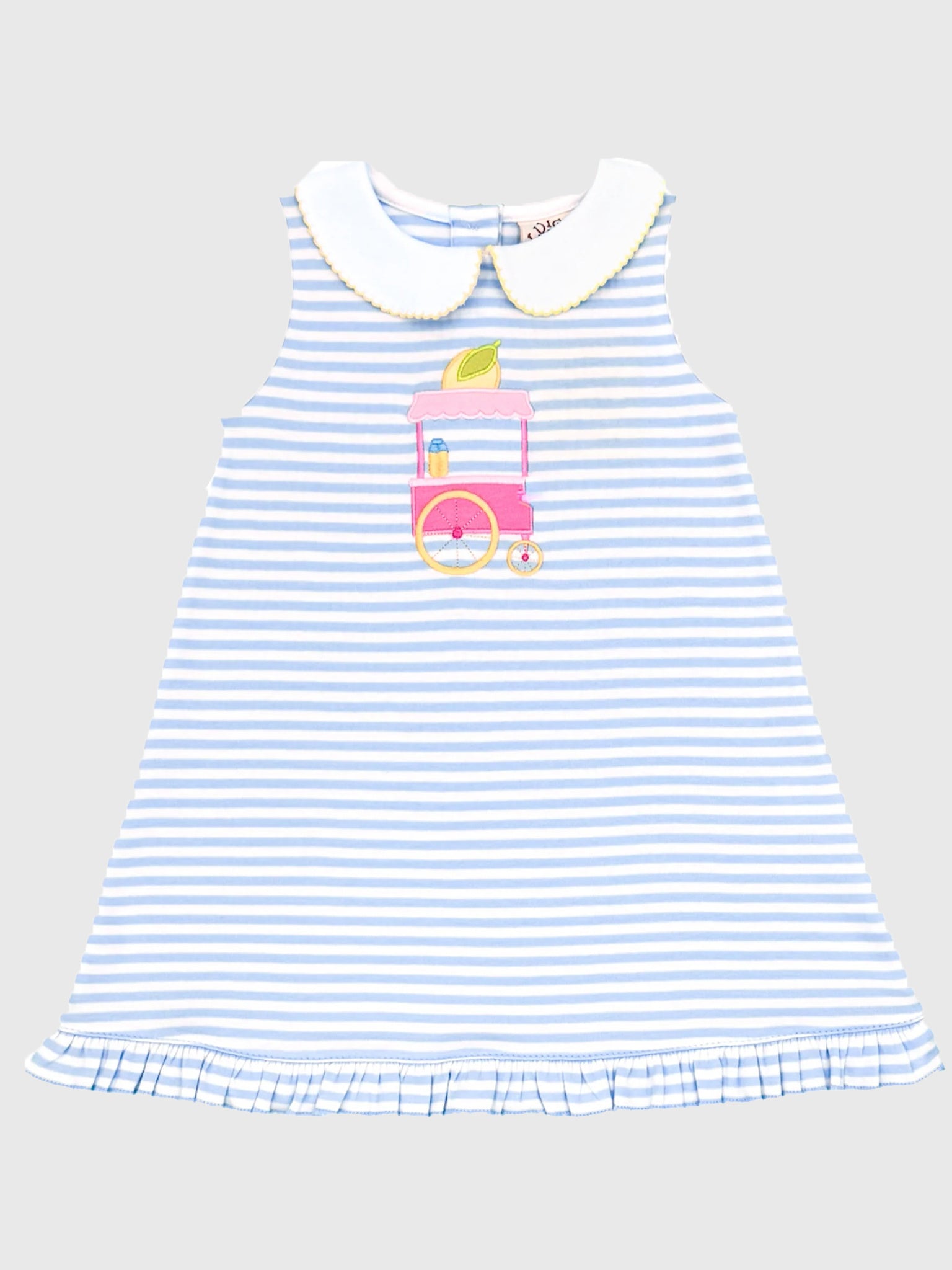 A light blue and white striped sleeveless dress with a white Peter Pan collar, a lemonade cart appliqué, and a ruffled hem.