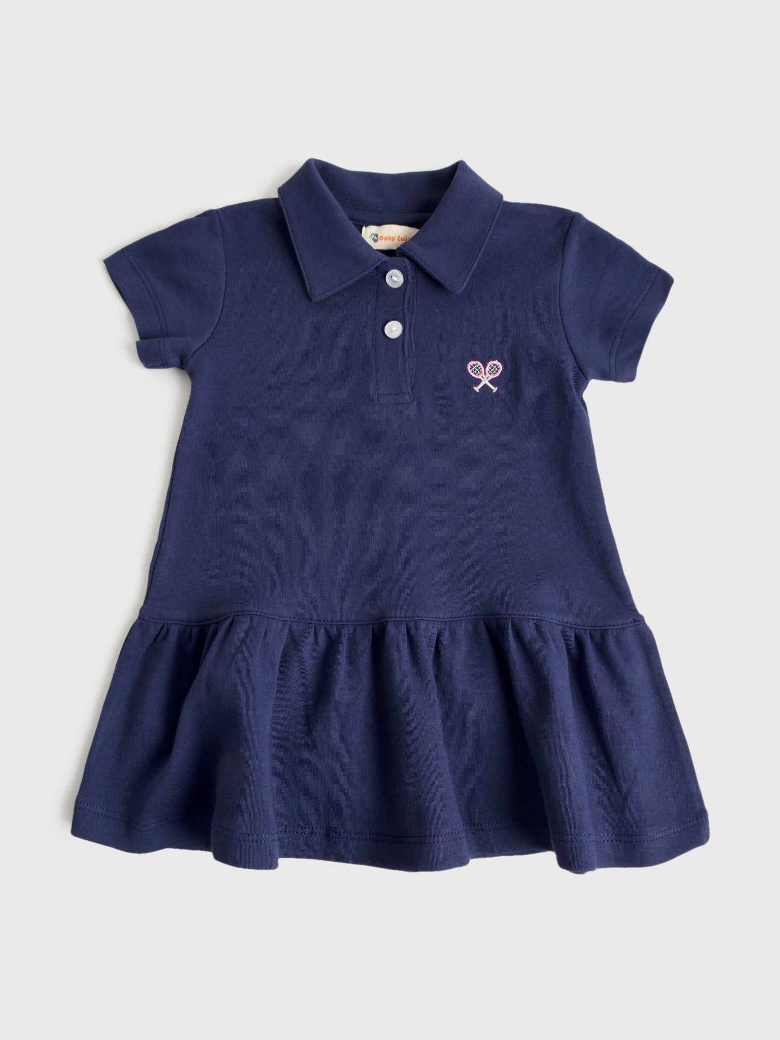A polo-style dress made from soft cotton and finished with an embroidered tennis graphic and a flounce skirt.