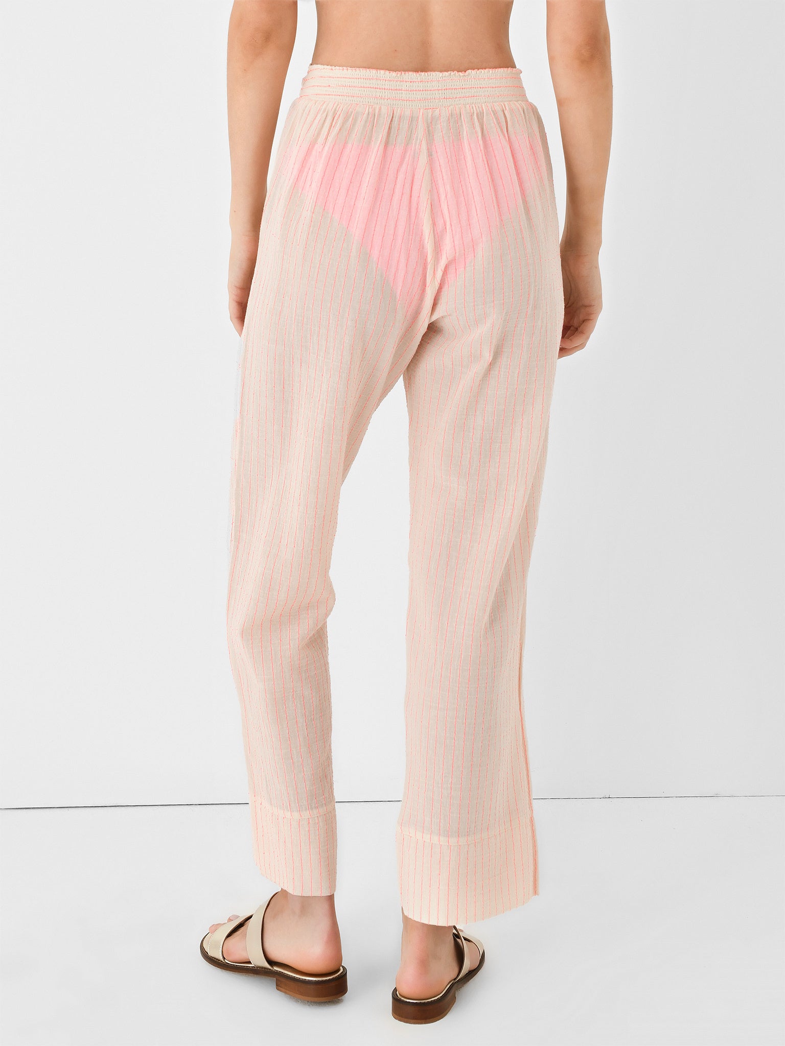 A lightweight cover-up pant with a straight silhouette and subtle stripe print.