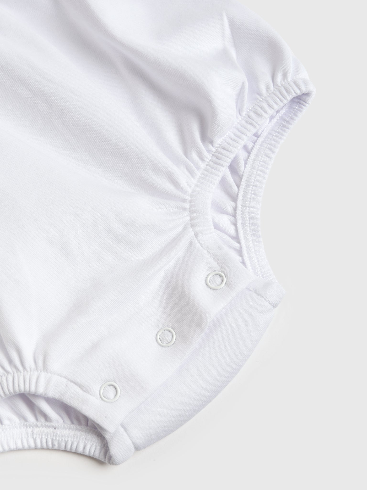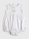 This cute little bubble is made from soft Pima cotton and features a ruffle-trimmed neckline and an embroidered gold design.