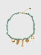 A turquoise bead necklace featuring assorted gold-plated brass charms.