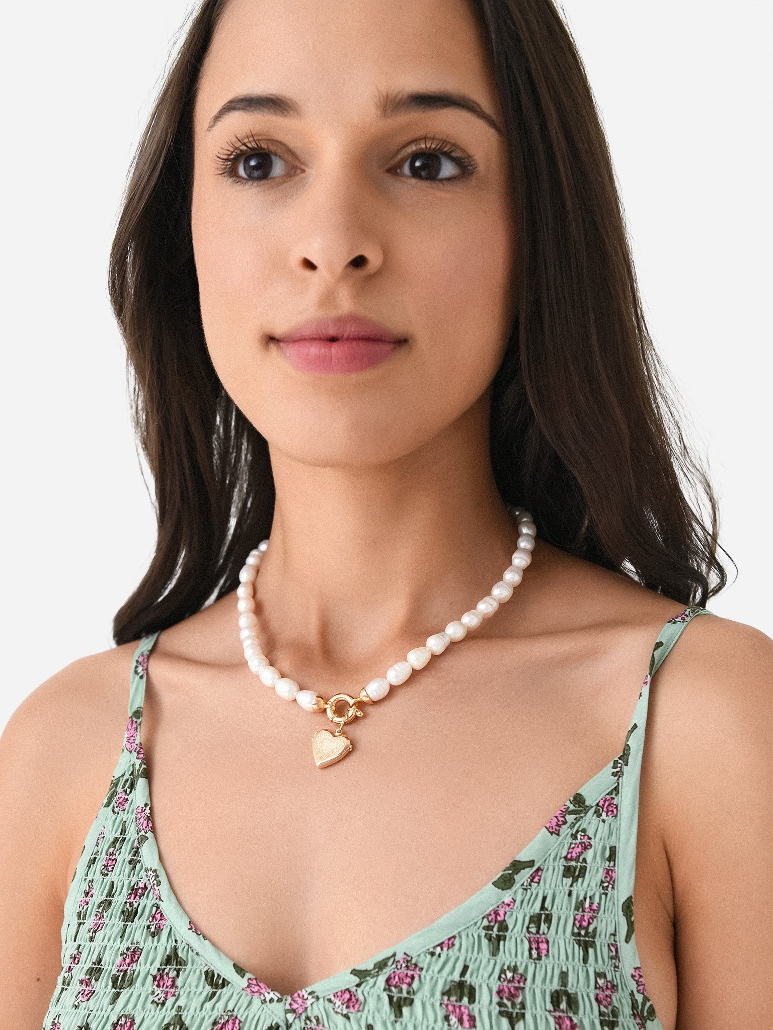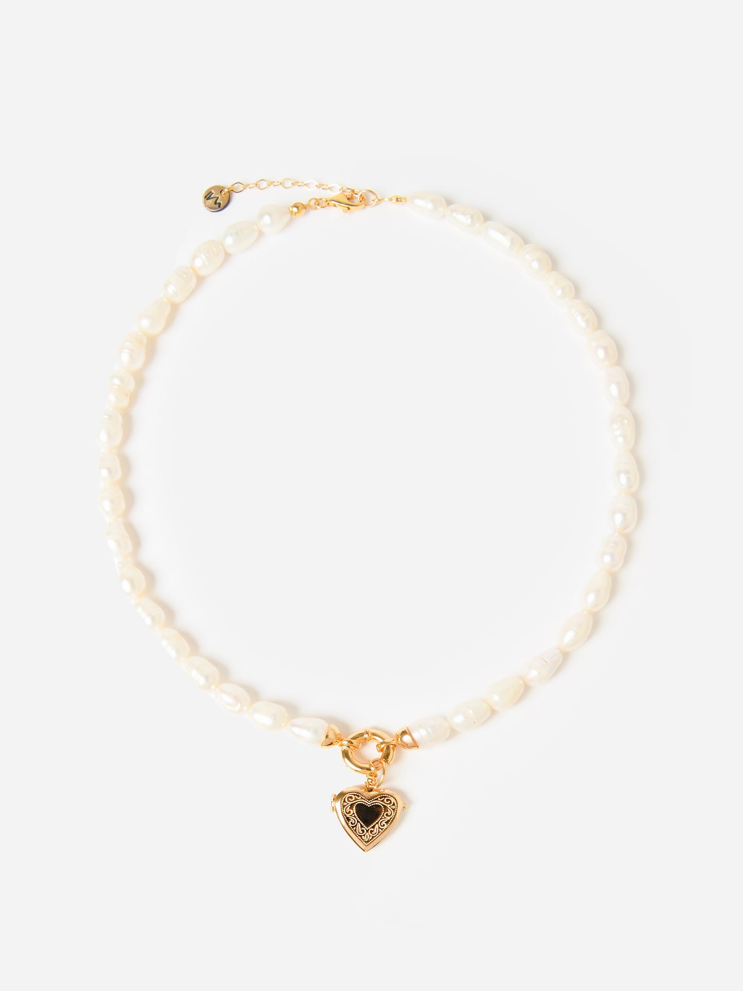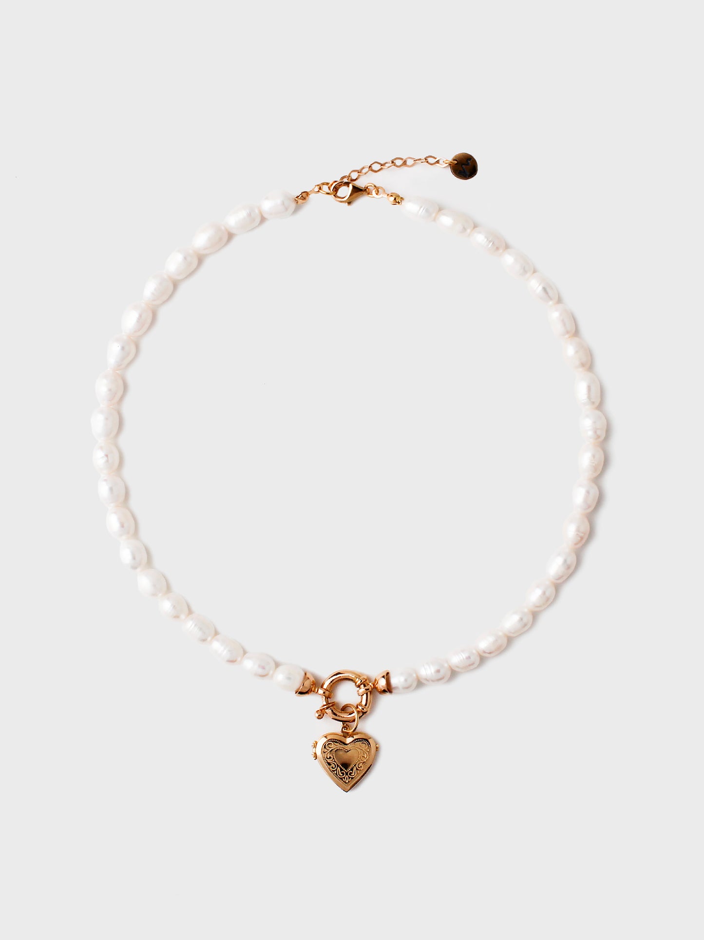 18-karat vermeil filigree heart locket pendant necklace surrounded by irregular freshwater pearls.