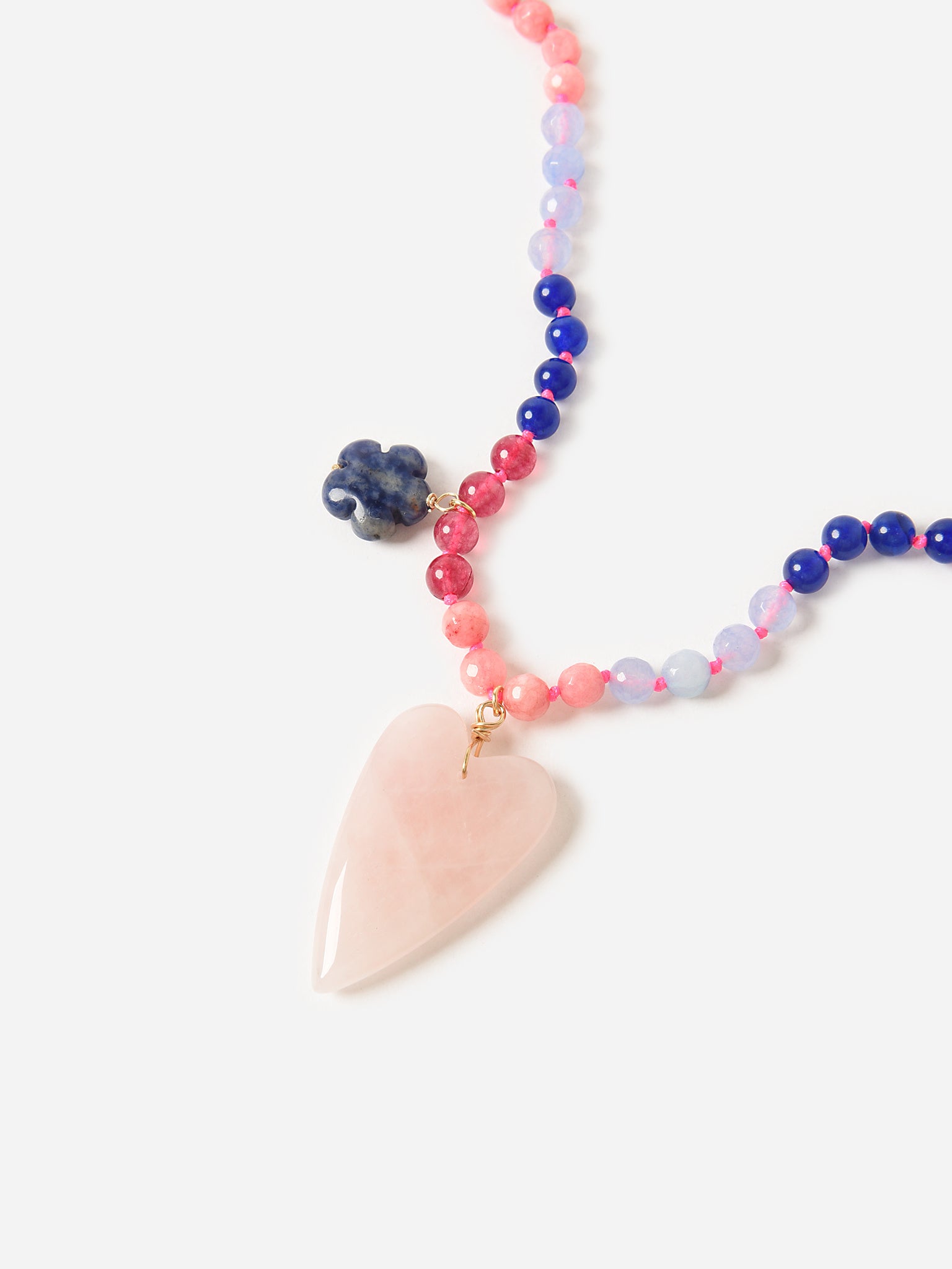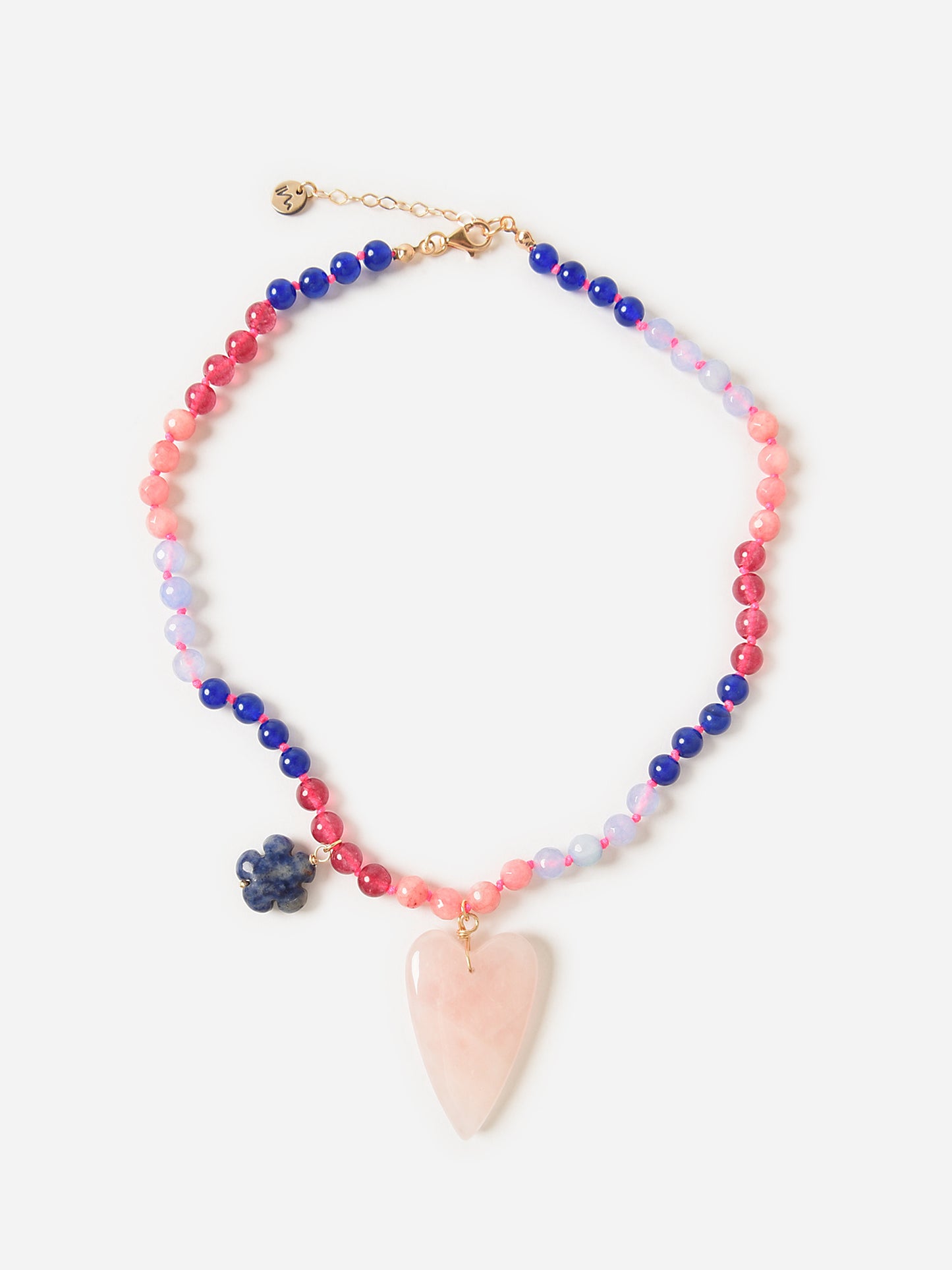 A colorful necklace made from semi-precious beads with a heart and floral pendant.