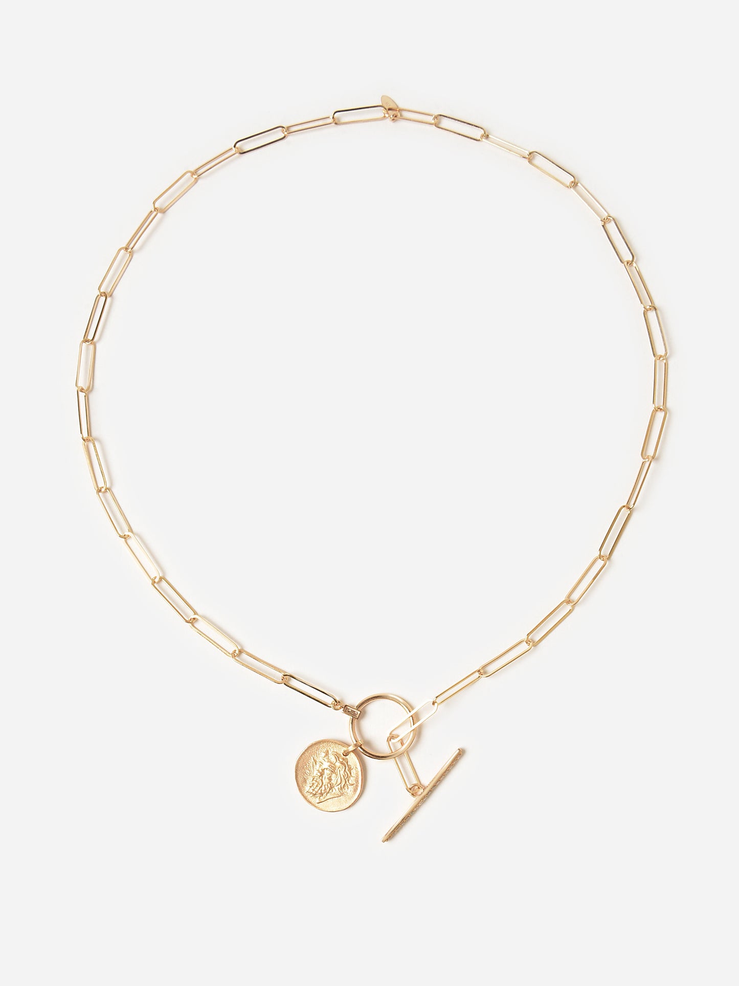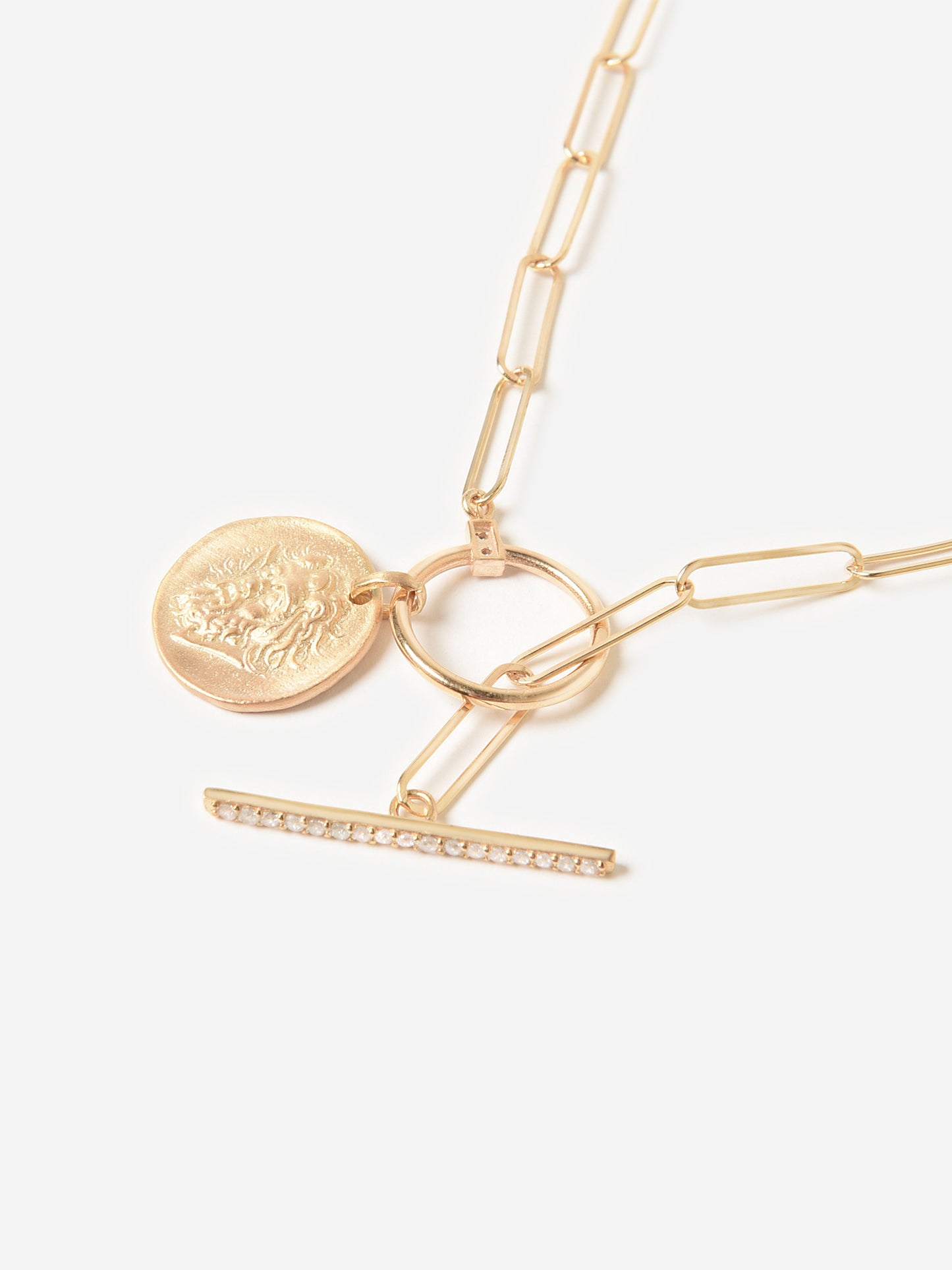 An 18-karat vermeil toggle chain necklace with a coin pendant and pavé crystal accents.