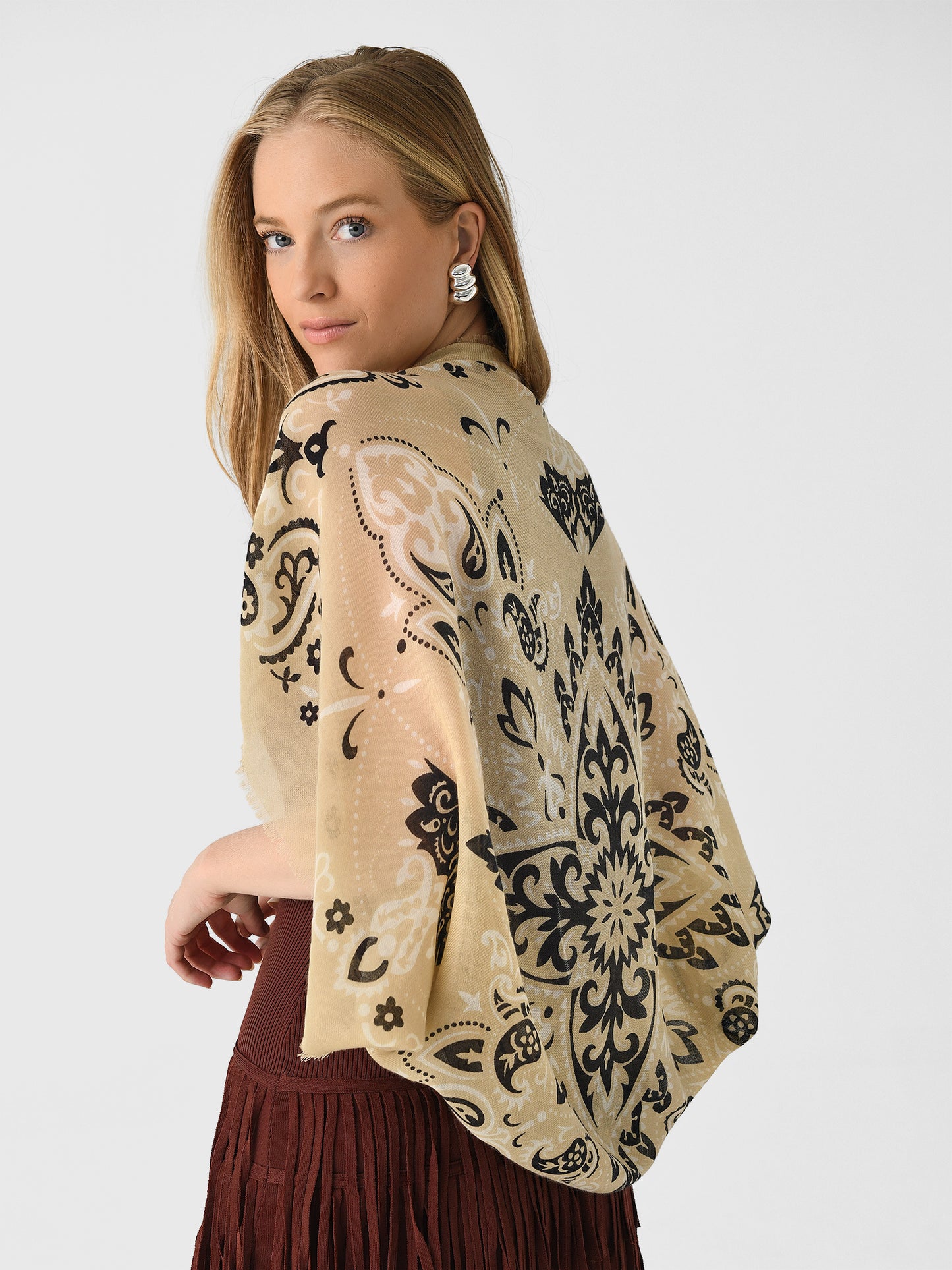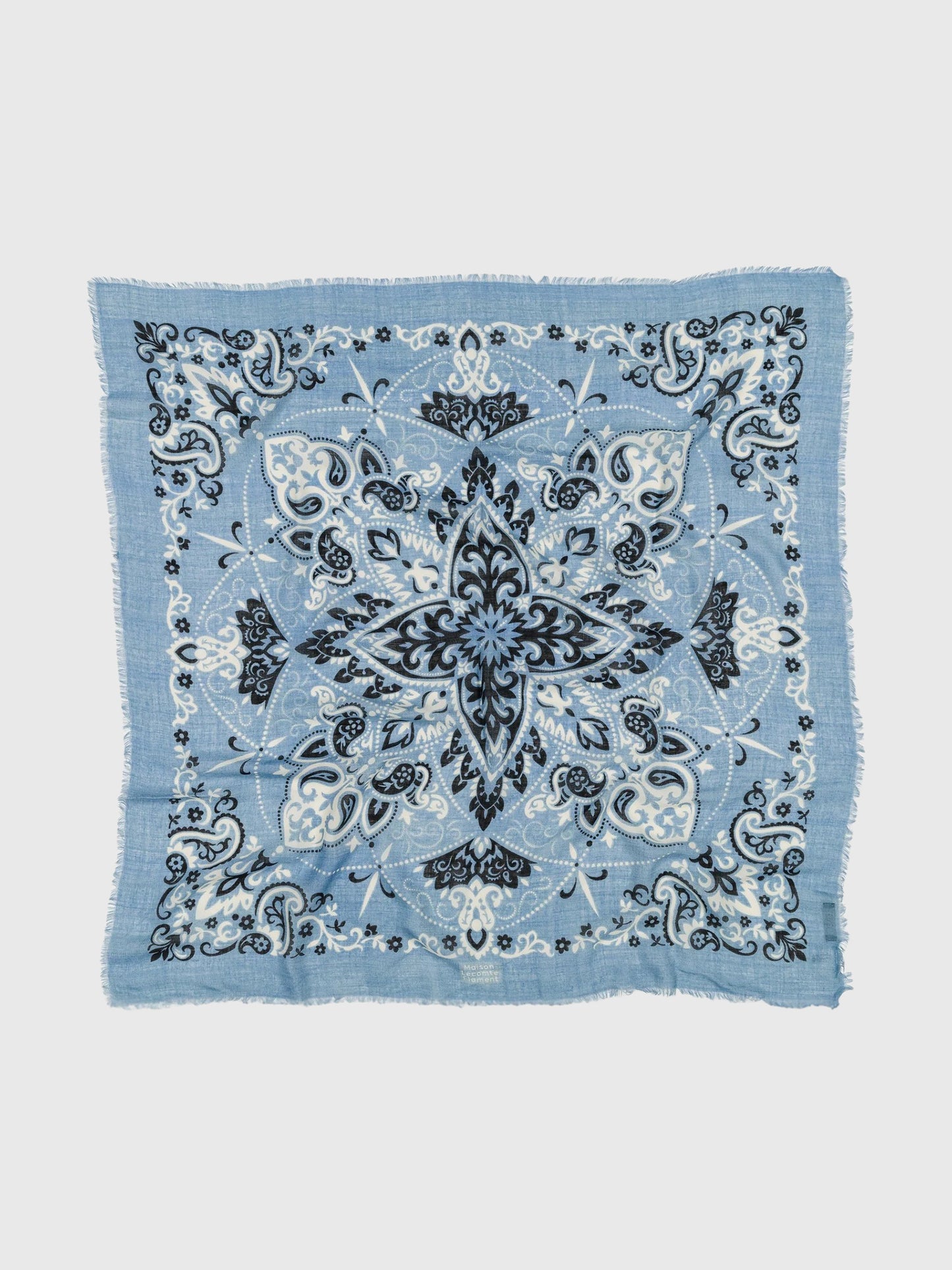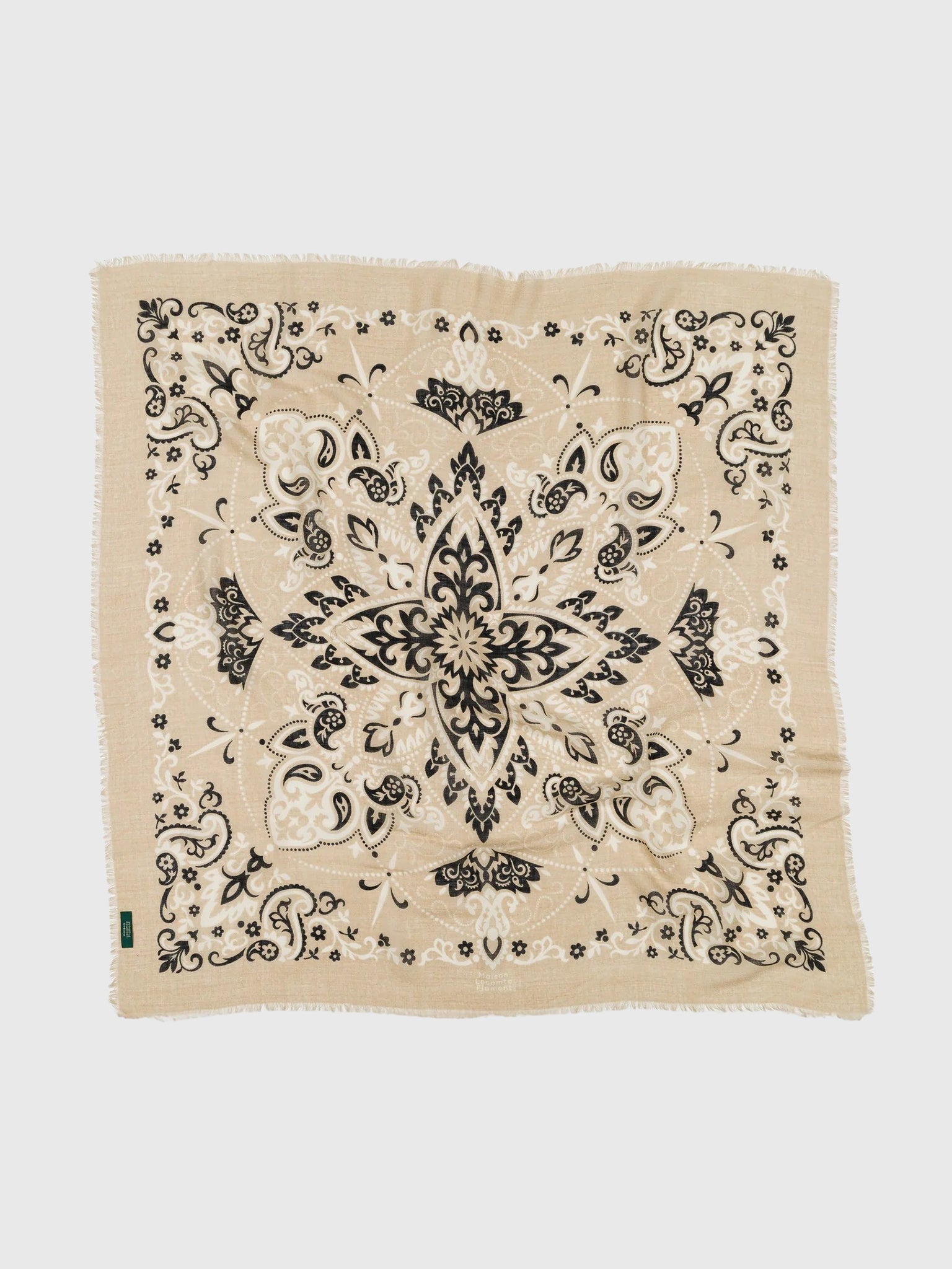 A bandana-printed square scarf made from a soft blend of wool and silk, perfect for adding a touch of sophistication to your look.