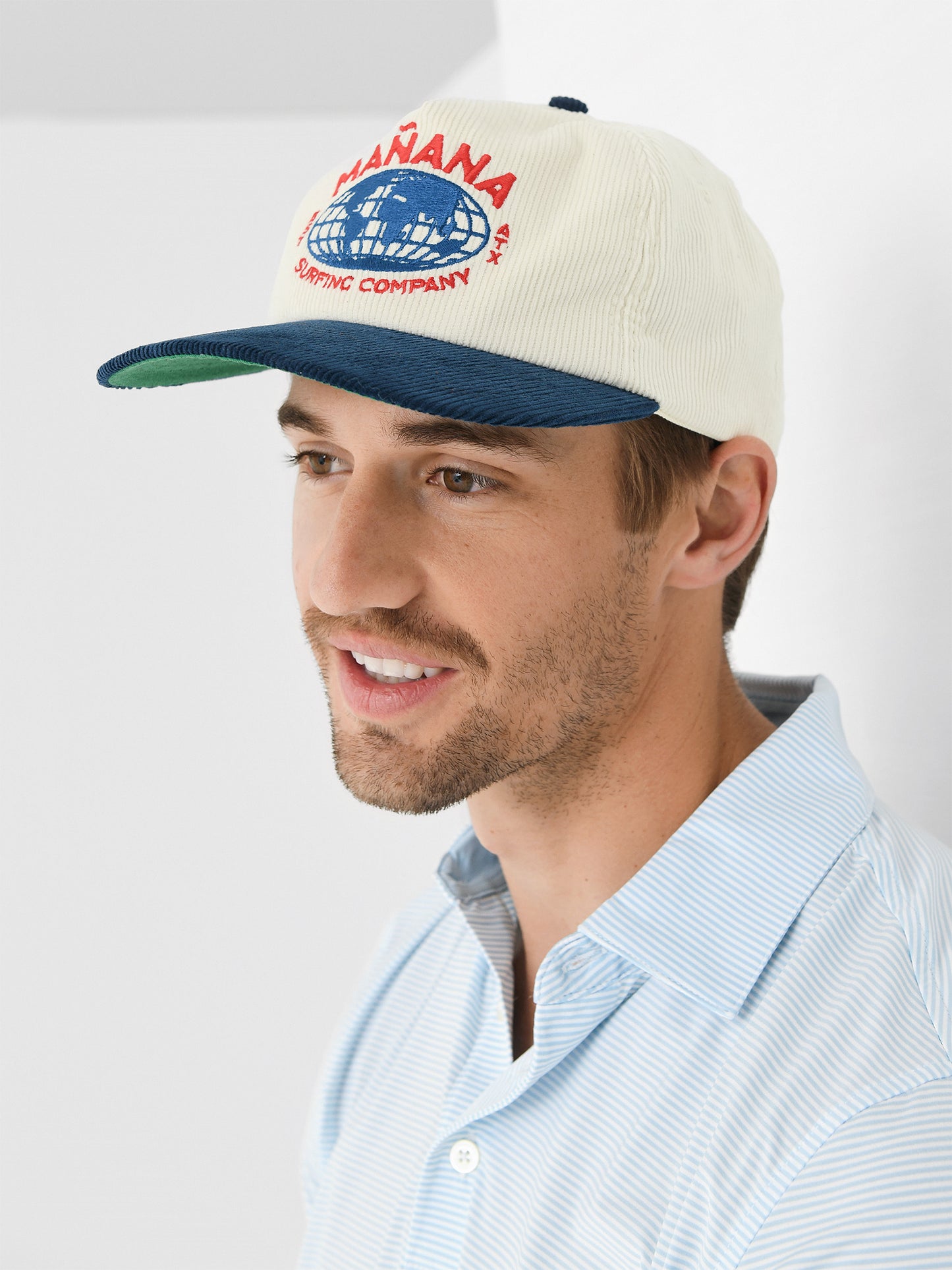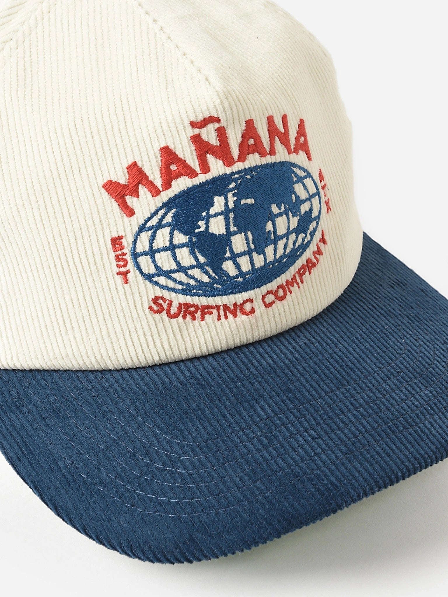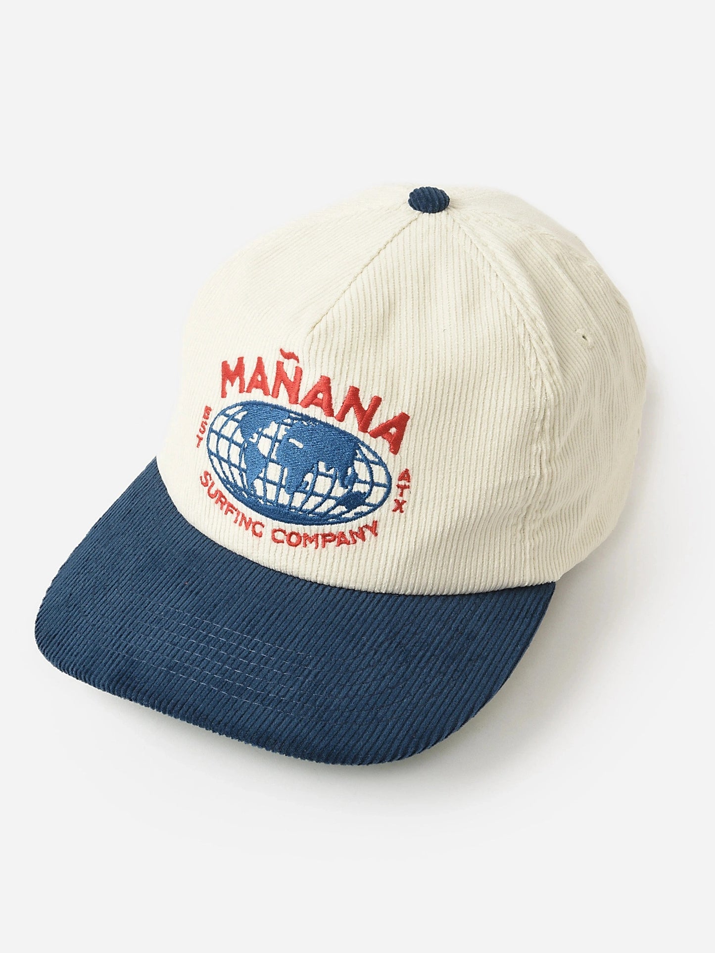 A corduroy snapback hat featuring an embroidered Mañana design and a five-panel mid-crown construction.