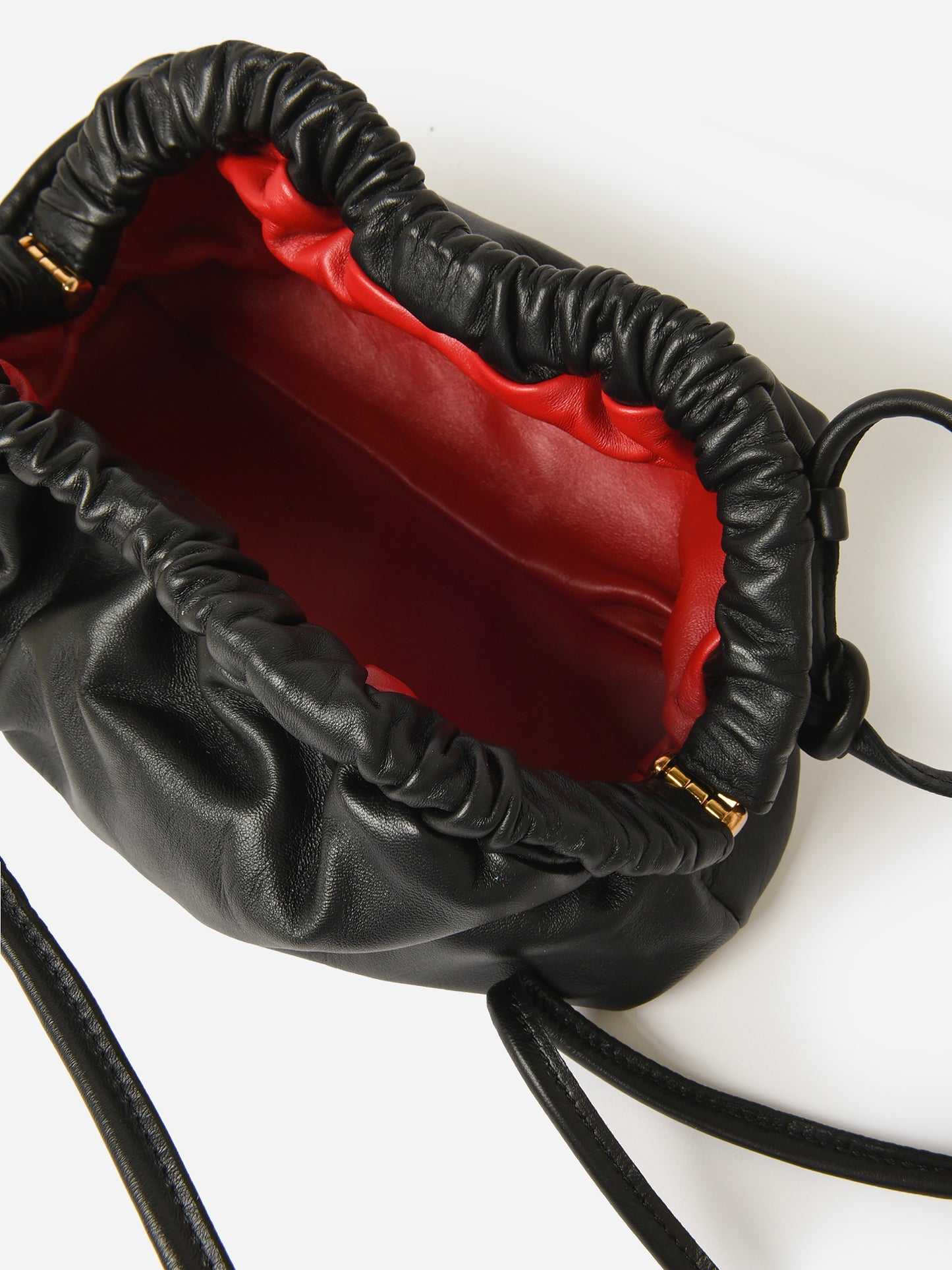 A sculptural clutch handcrafted from Italian lambskin leather with an elegantly curved frame with a magnetic closure and removable strap.