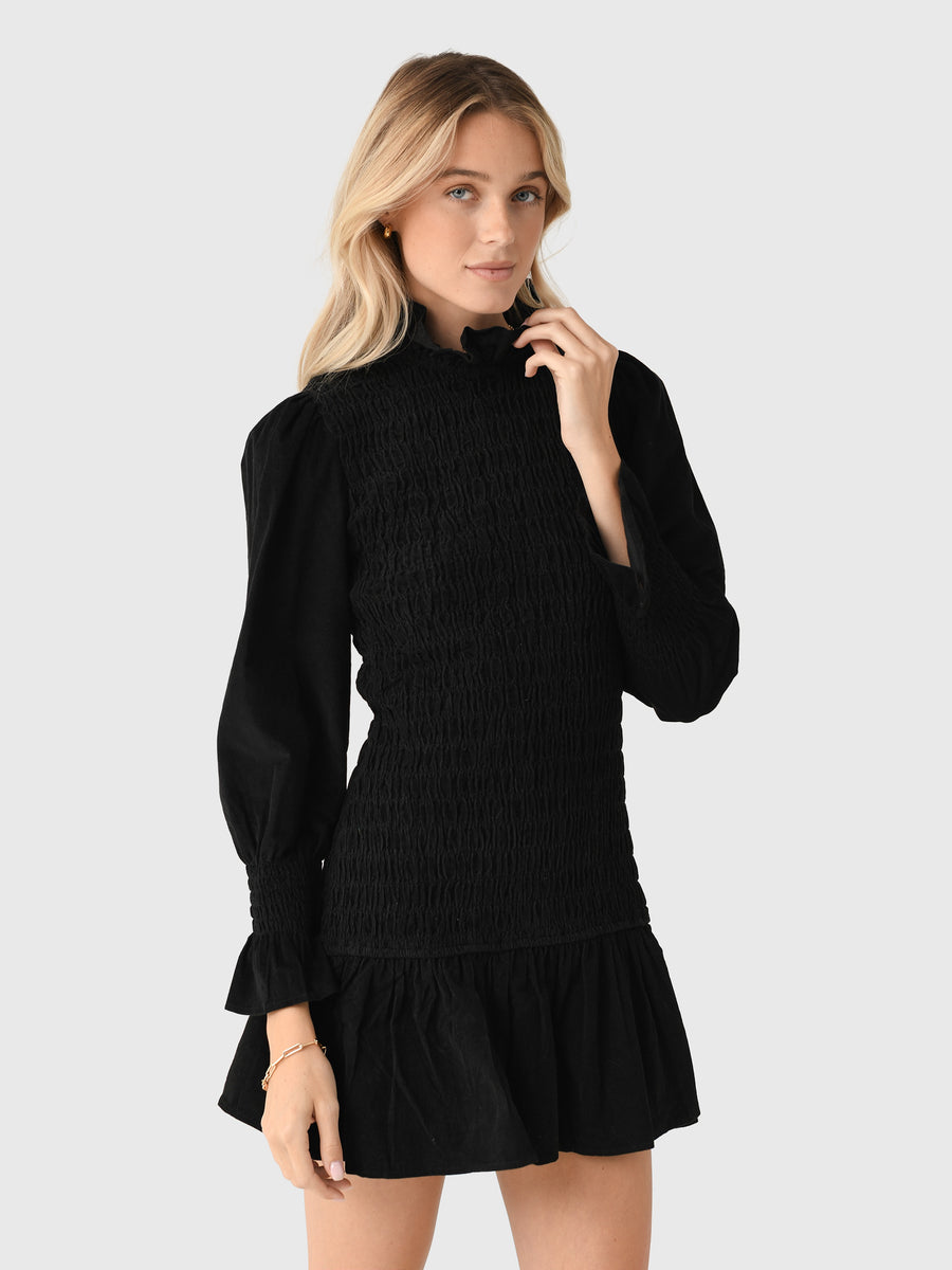 This charming mini dress is crafted from soft corduroy cotton for a cozy yet stylish feel. It features elegant long sleeves and a high neckline finished with a delicate ruffled collar. The silhouette is enhanced by detailed smocked detailing on both the bodice and the sleeve cuffs, creating a beautifully fitted look.