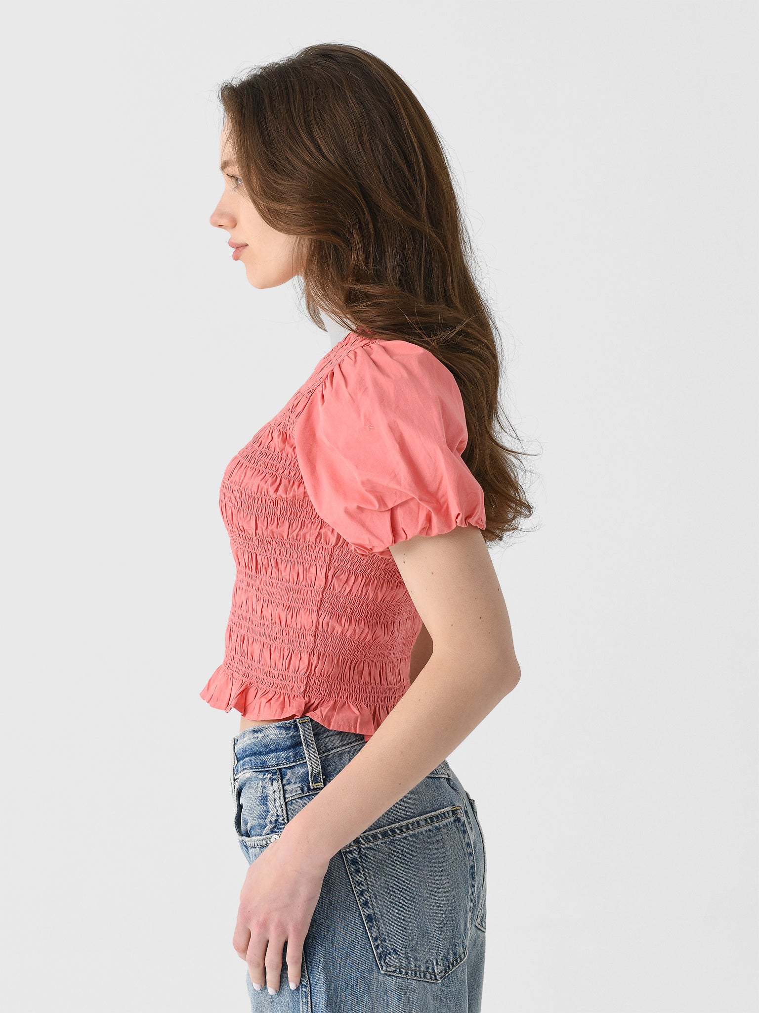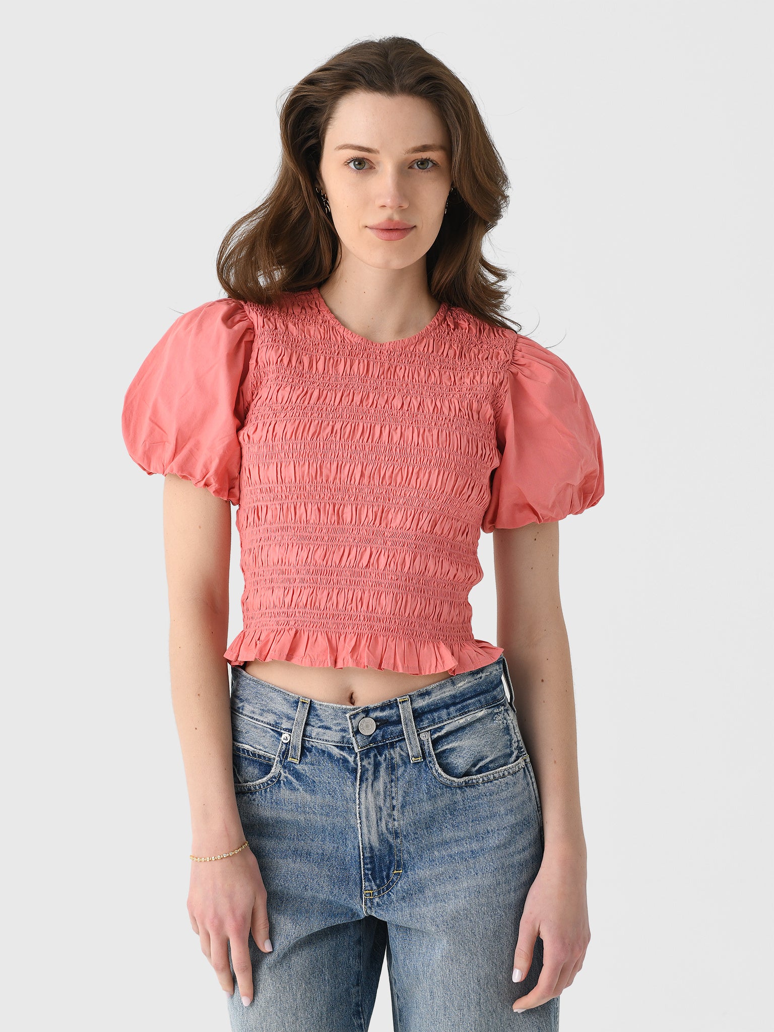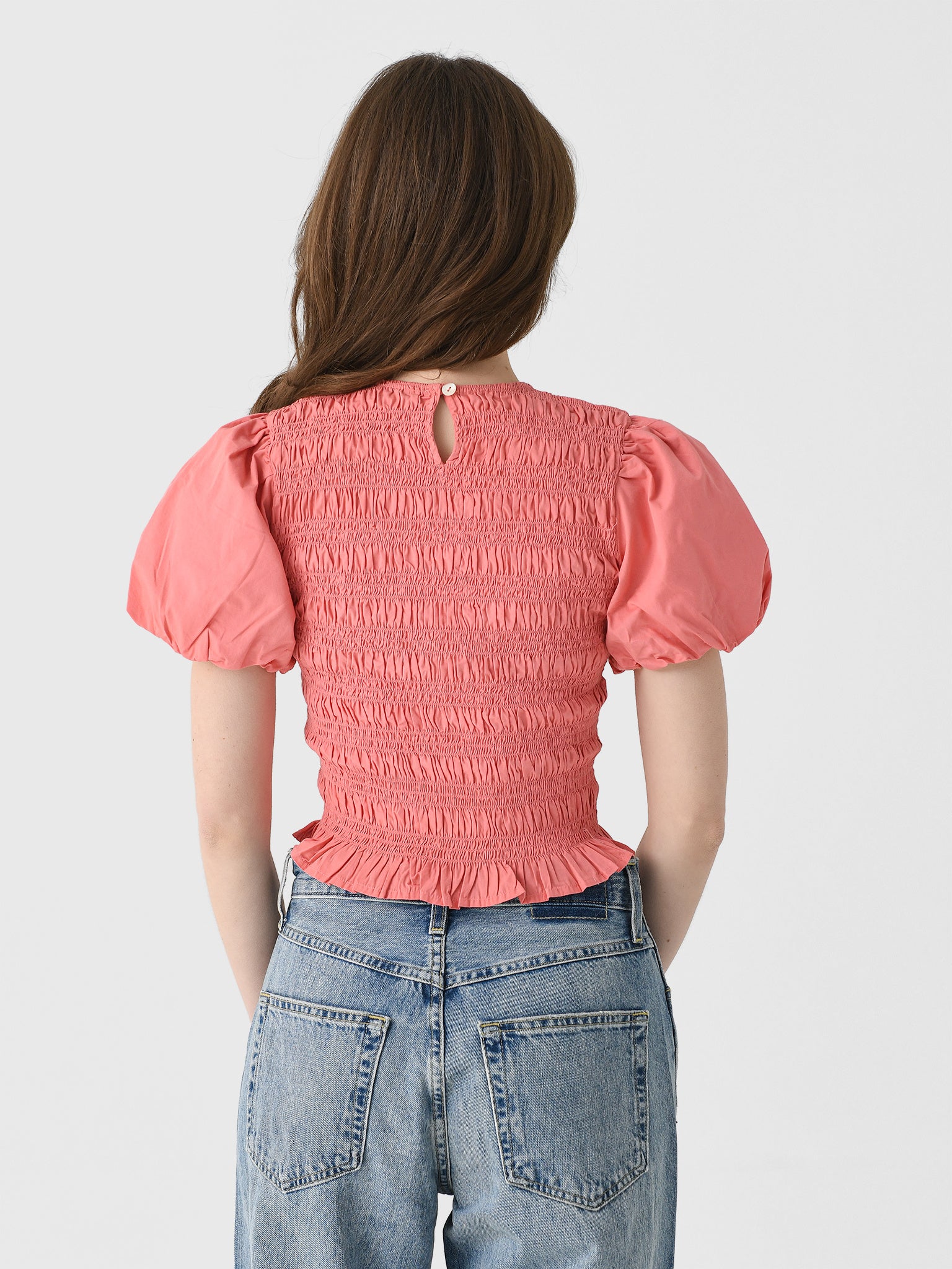 The Baila Shirt offers a charming and elegant silhouette with a slim fit and puffed sleeves. Crafted in soft cotton, it features a delicate smocked design and a classic round collar.