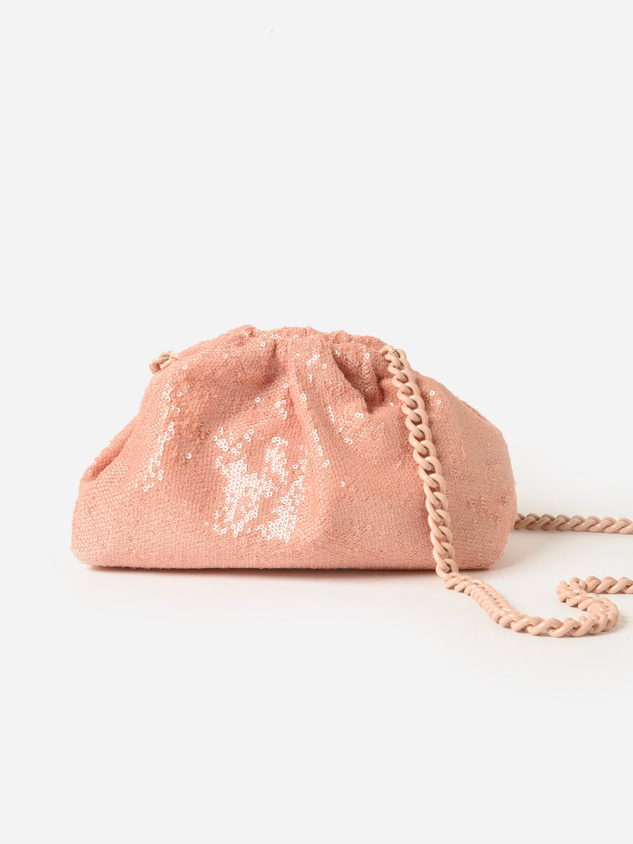 A mini-sized sequin clutch with a matching aluminum chain strap.