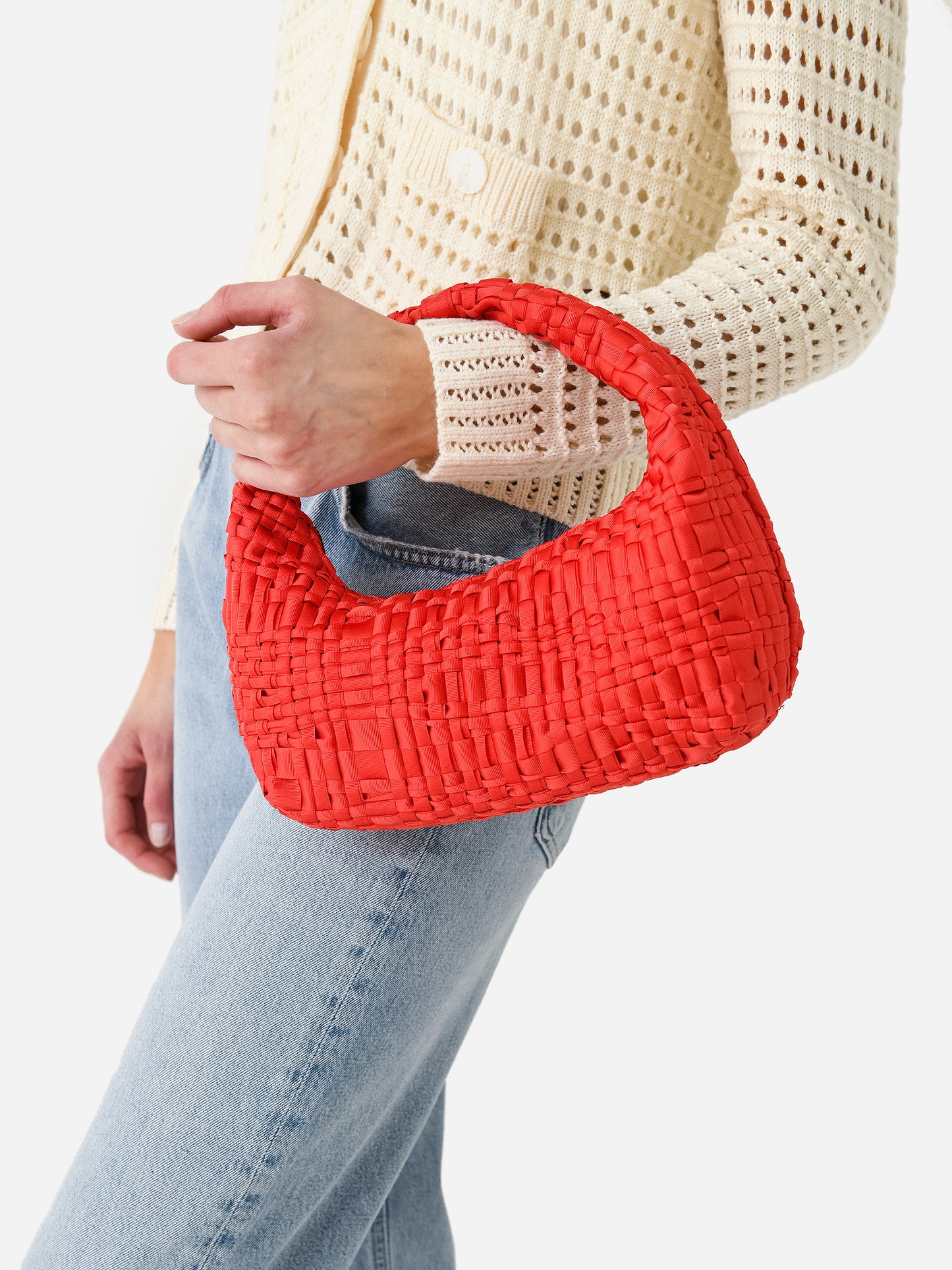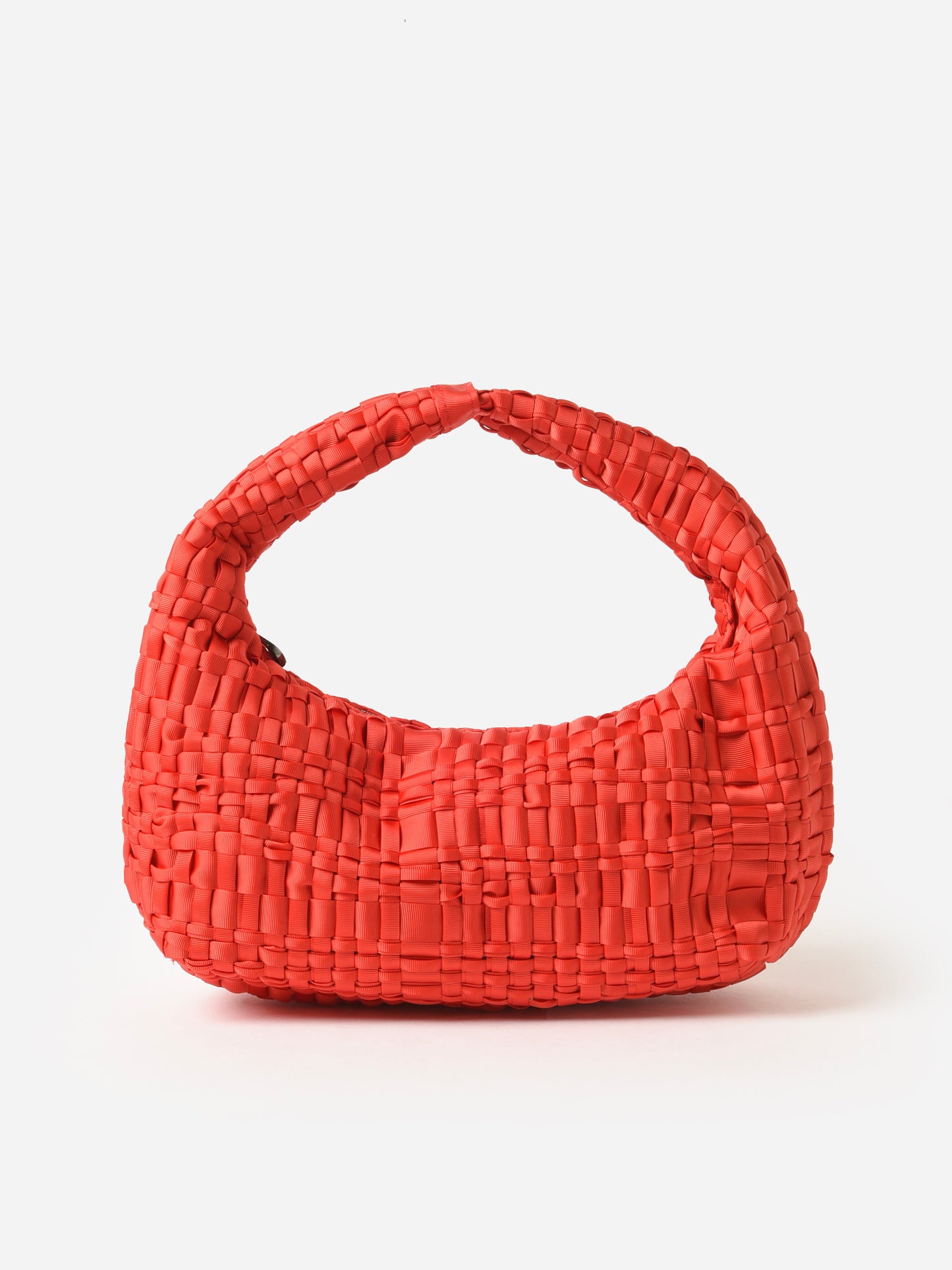 A top-handle handbag made from woven ribbon fabric with a zip closure and satin viscose lining.