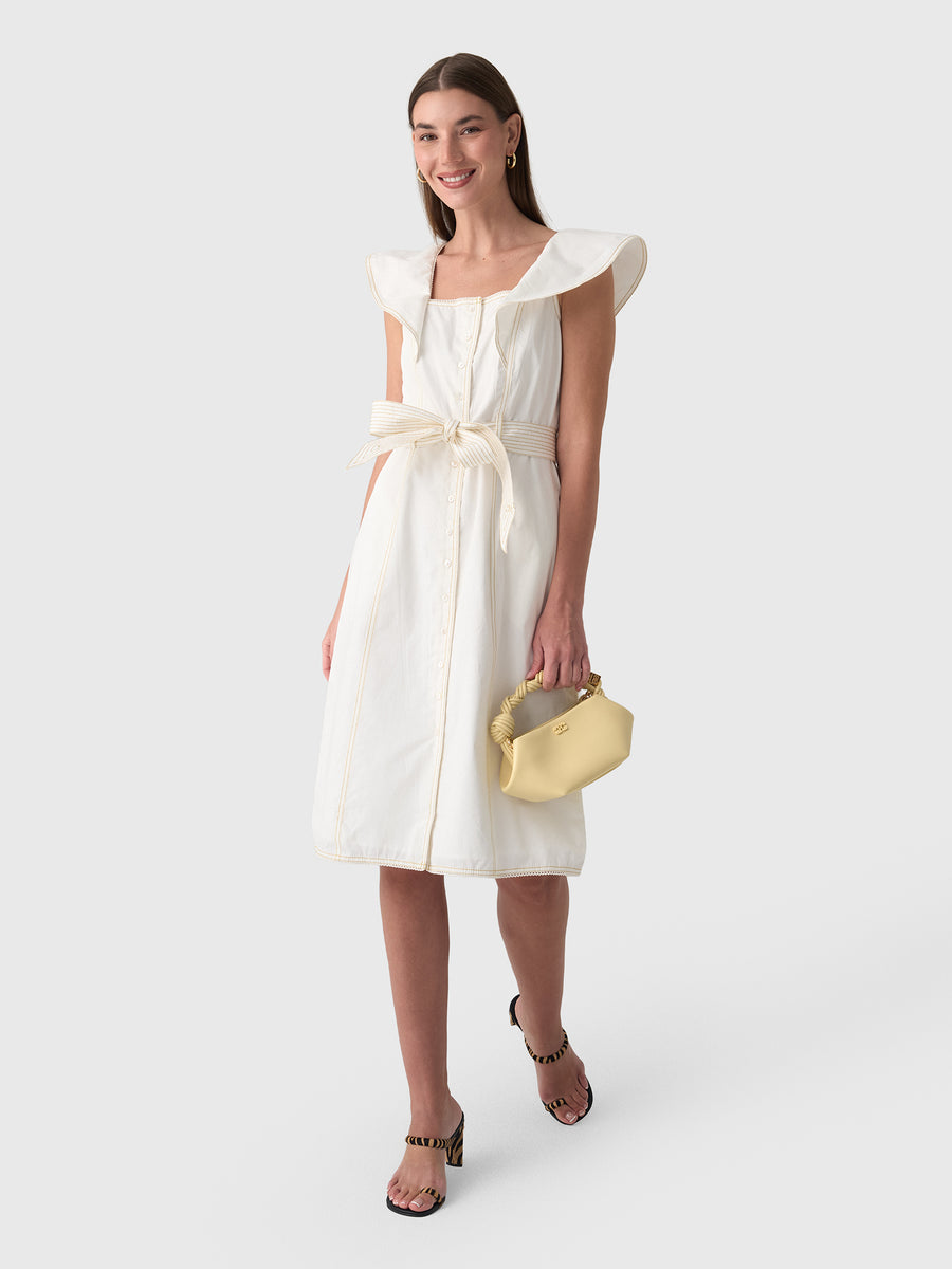 This dress is crafted from structured cotton and features a feminine, button-down silhouette that falls just above the knee. The design is defined by dramatic, oversized ruffle details at the shoulders that frame a square neckline. Vertical contrast topstitching runs the length of the garment, accentuating the clean construction and tailored panels.