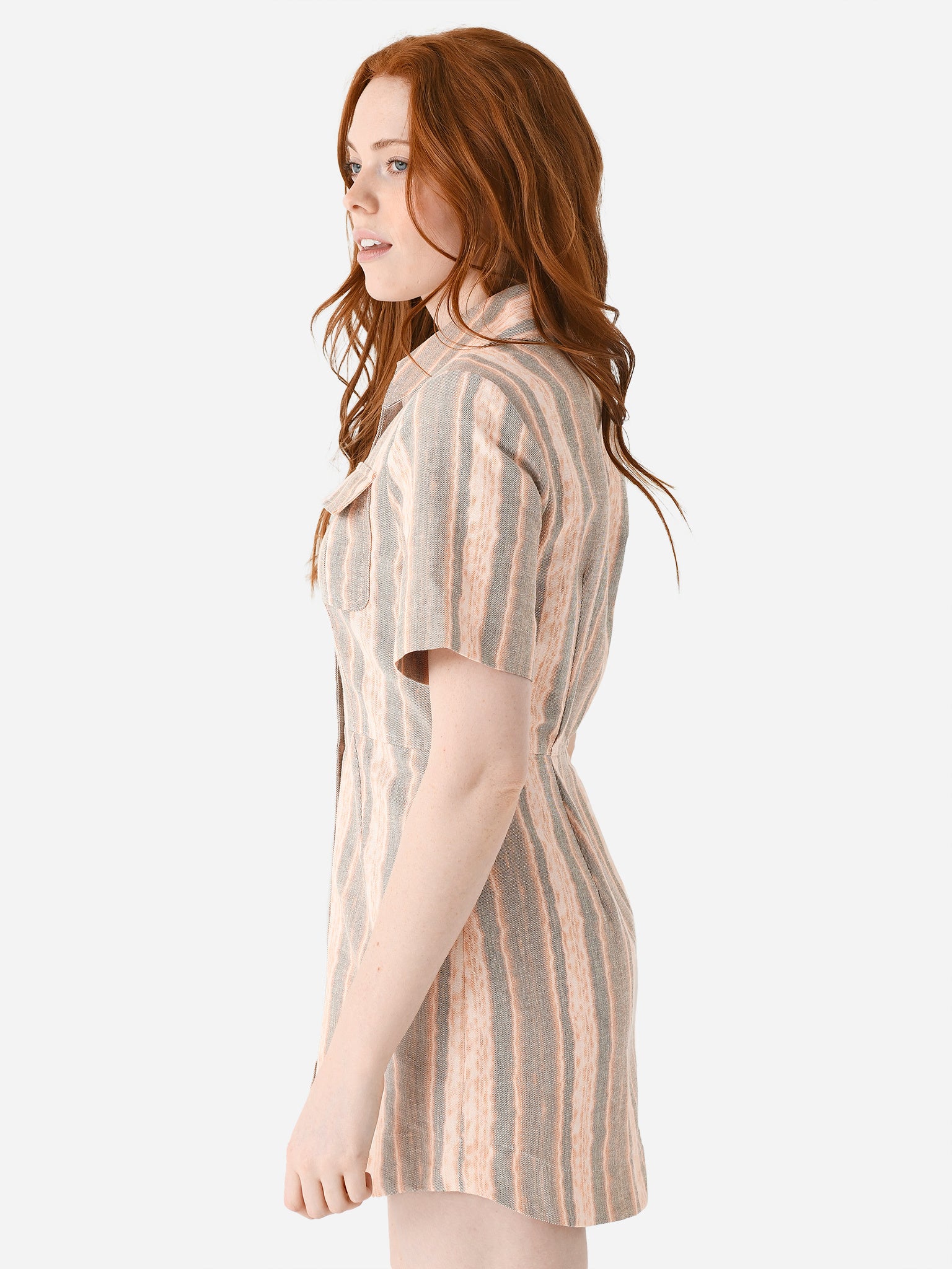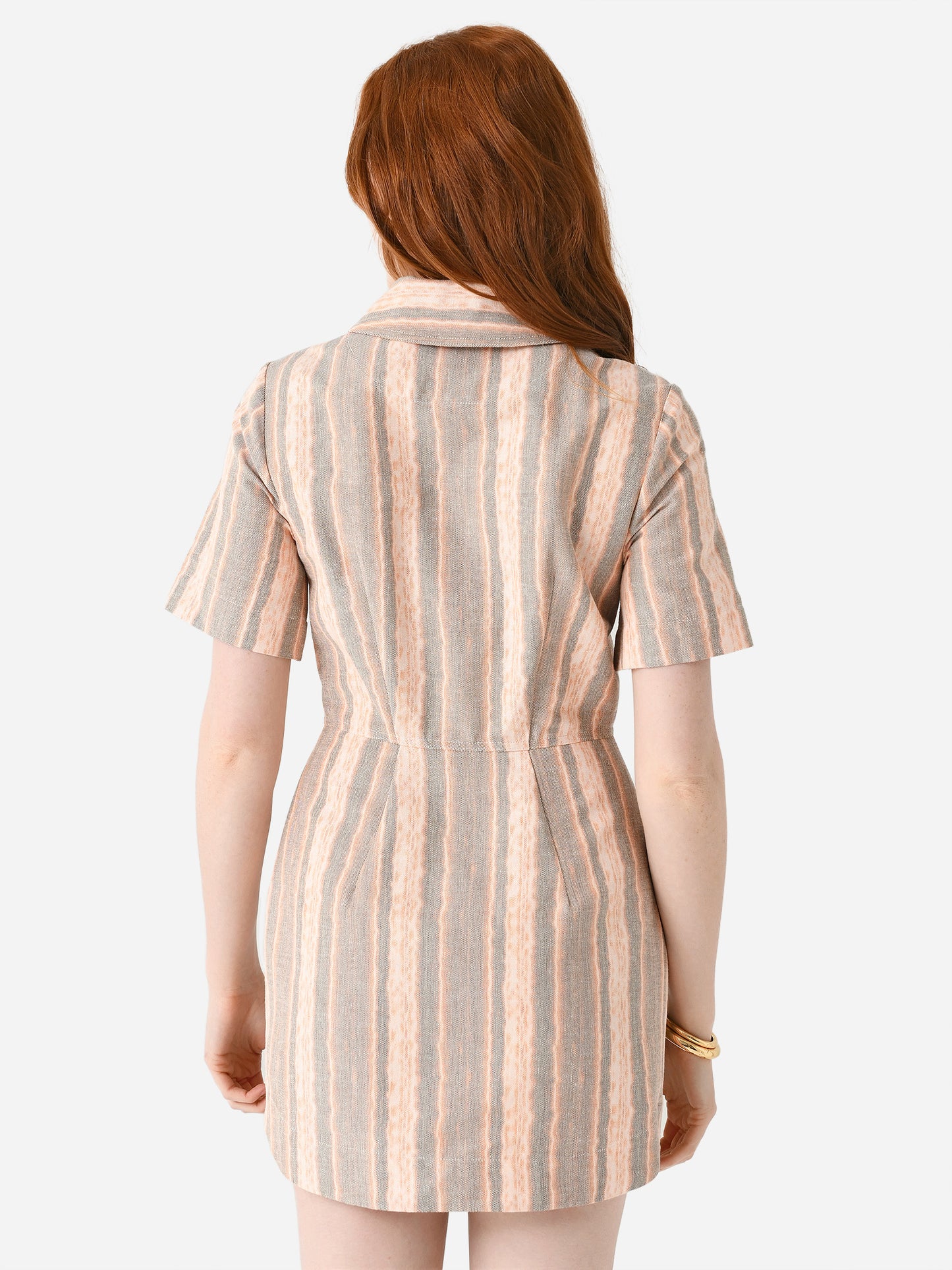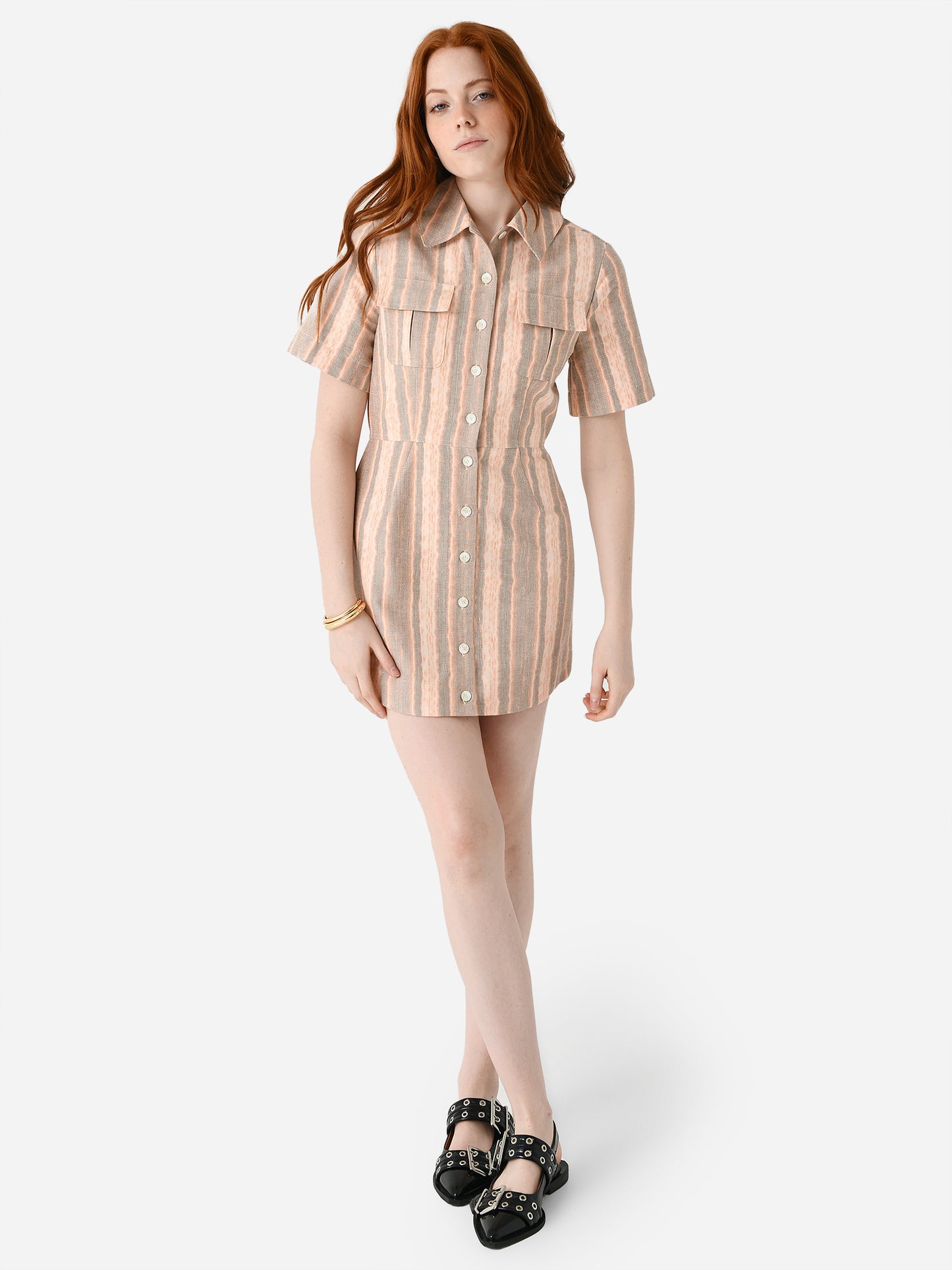 A fitted shirt-style mini dress made from tie-dyed stripe denim fabric.