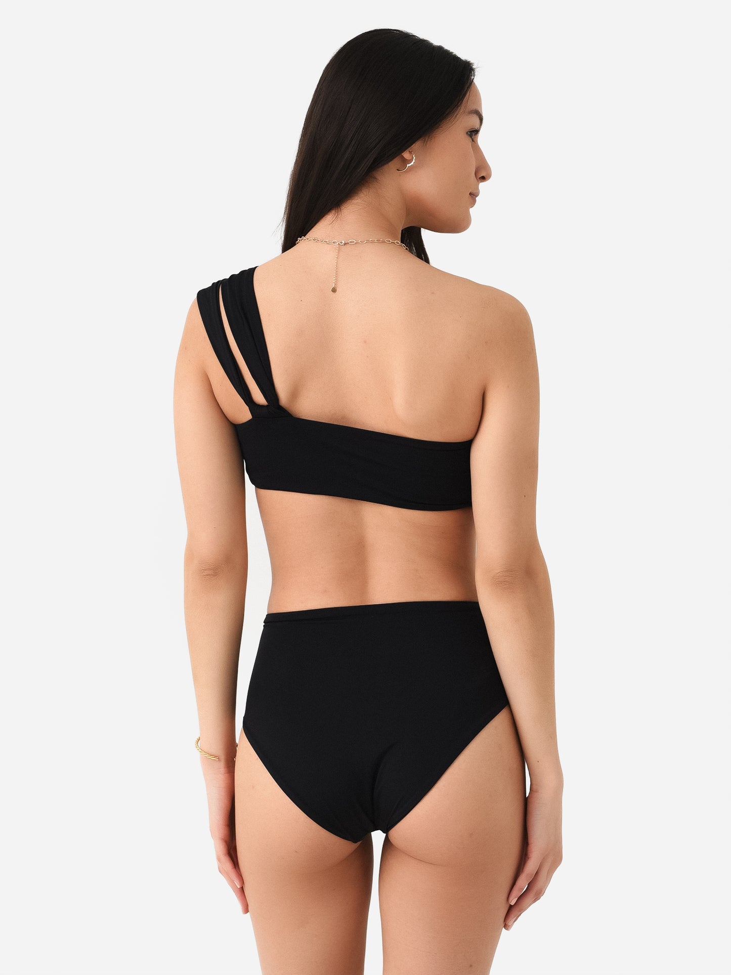 Two-piece bikini set with a one-shoulder top and a high-waisted bottom.