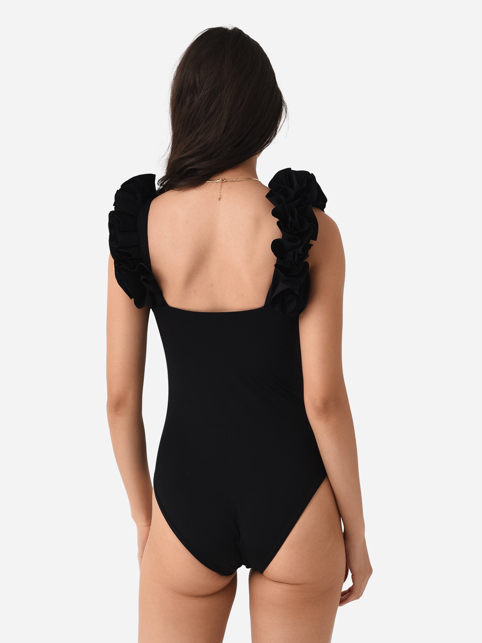 One-piece swimsuit with a low neckline and little flower-shaped ruffle straps.