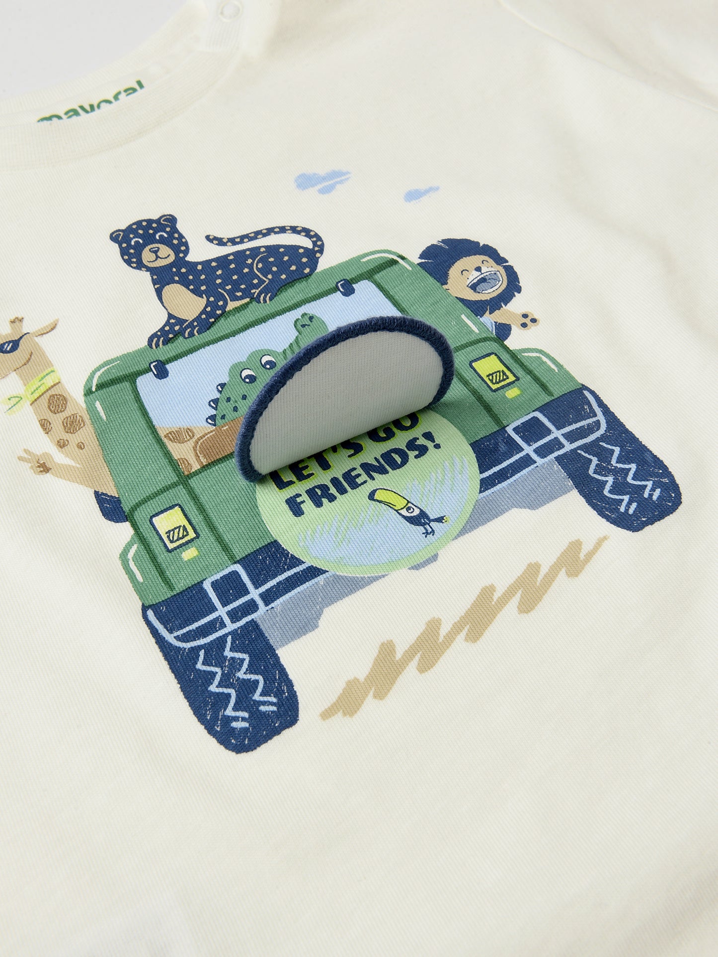 A short-sleeve cotton t-shirt with a peek-a-boo graphic.