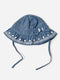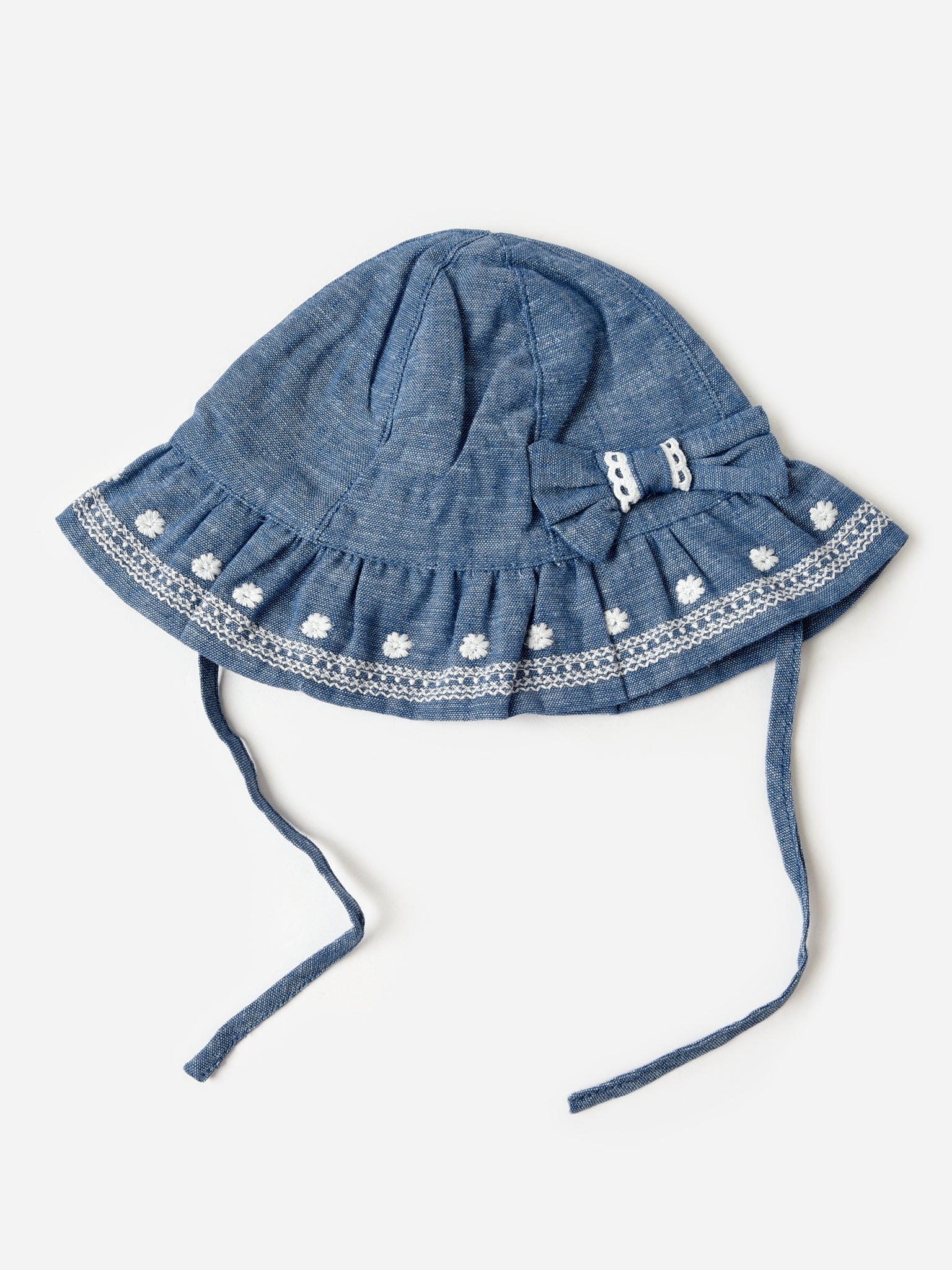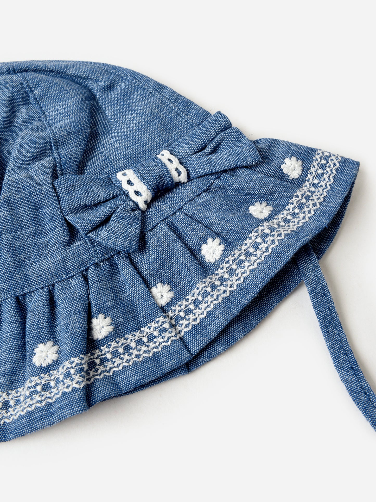 A linen cotton hat with adjustable ties and delicate contrast embroidery.