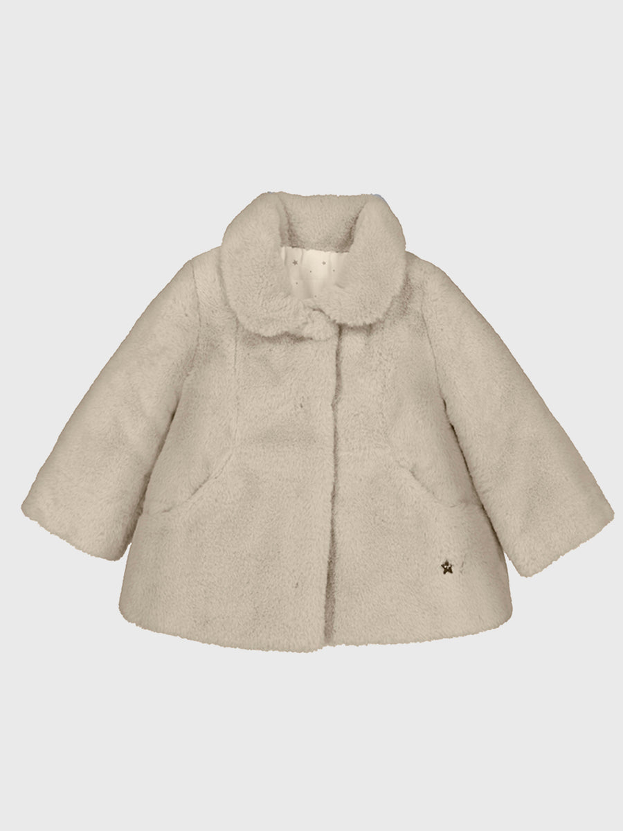 This adorable baby coat is made from soft, plush faux fur, perfect for keeping your little one cozy and stylish. The coat features a rounded collar, a full button-down front, and two front pockets.