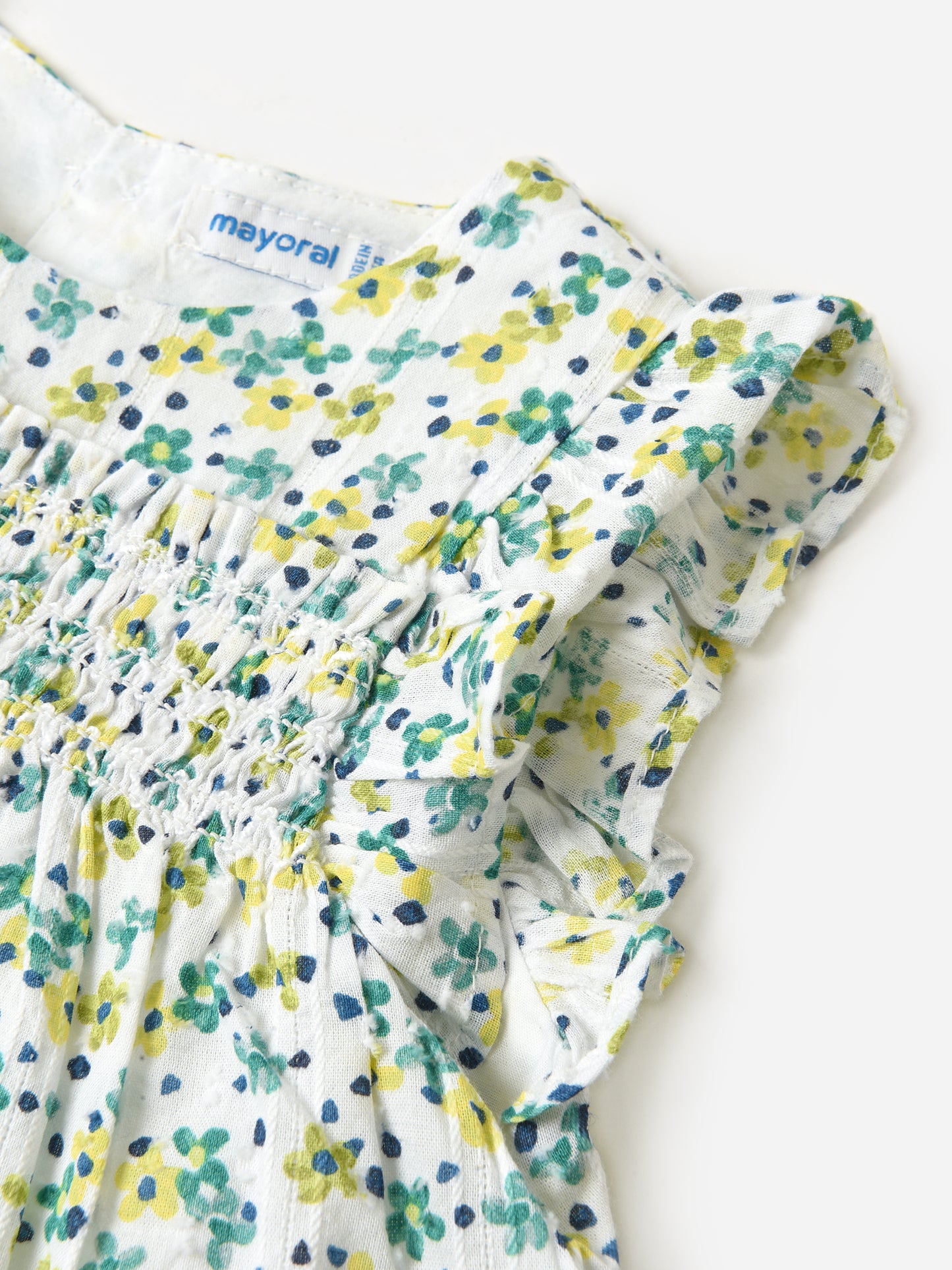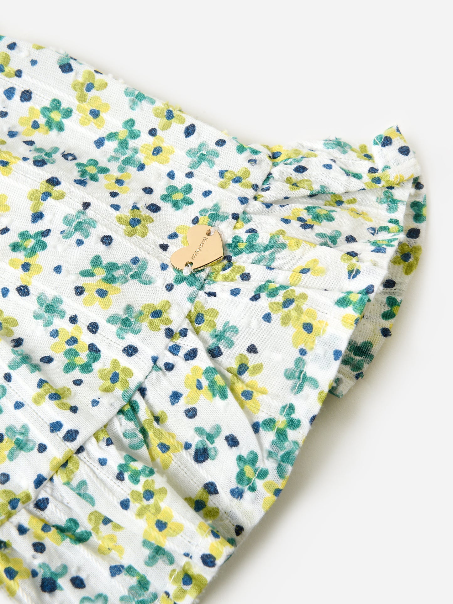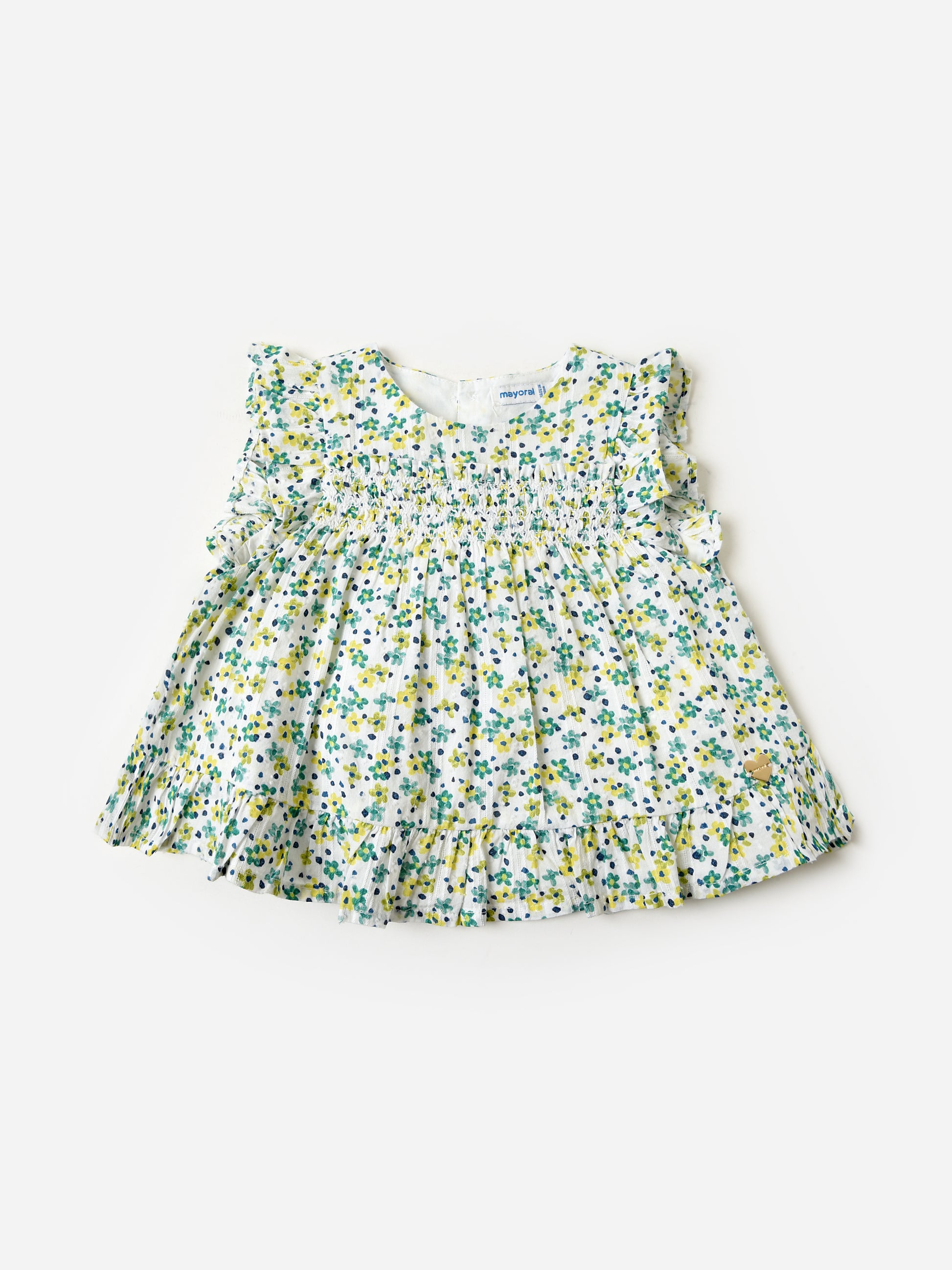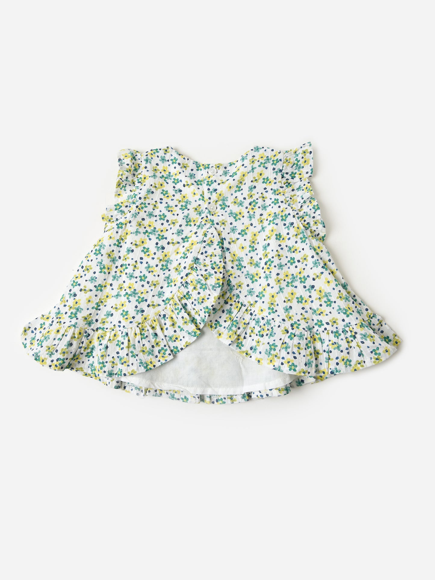 A flowy cotton blouse with cute ruffle details and a colorful floral print.