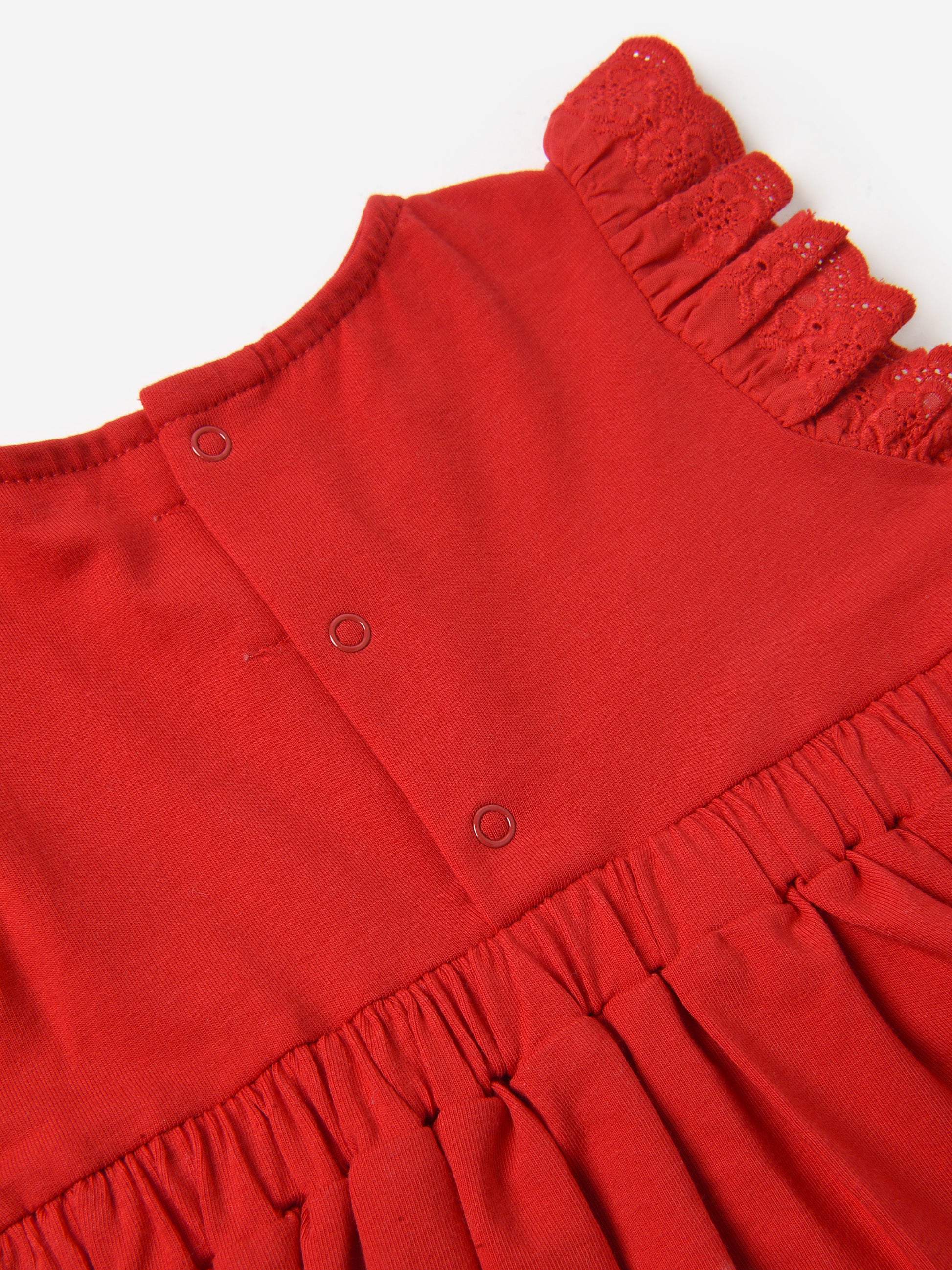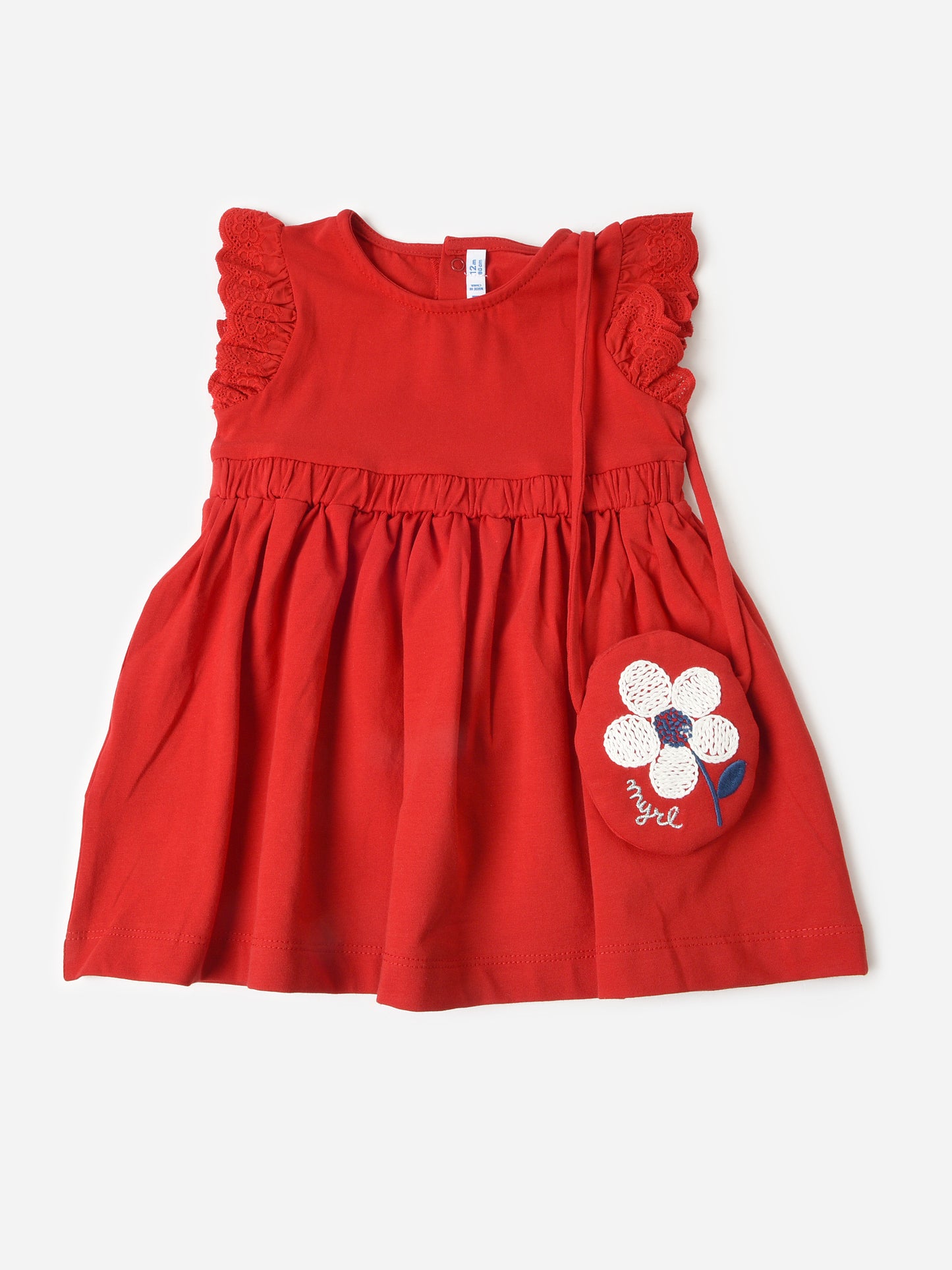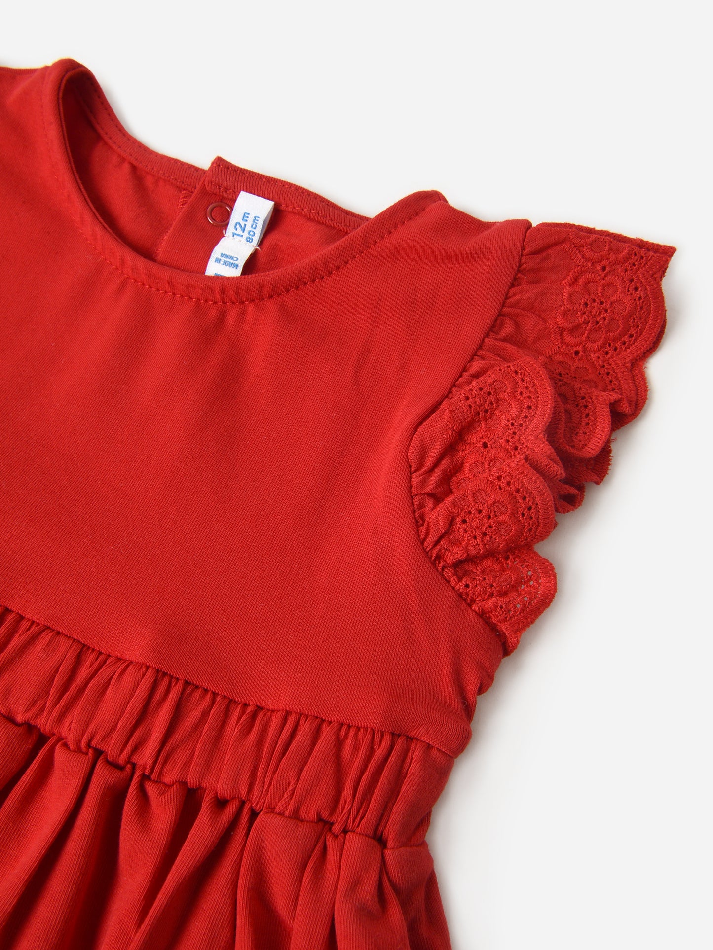A lightweight cotton dress with delicate eyelet ruffle sleeves and a gathered waistband.